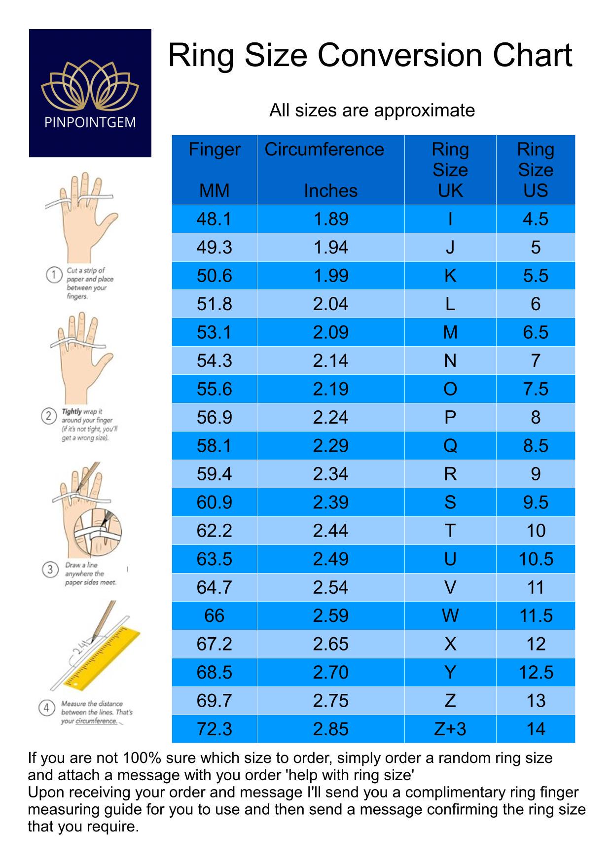 1) Please see our last photo for quick measure guide and ring size conversion chart. Please measure in mm the circumference of your intended ring finger then from our ring size conversion chart choose the US ring size close to your finger circumference.