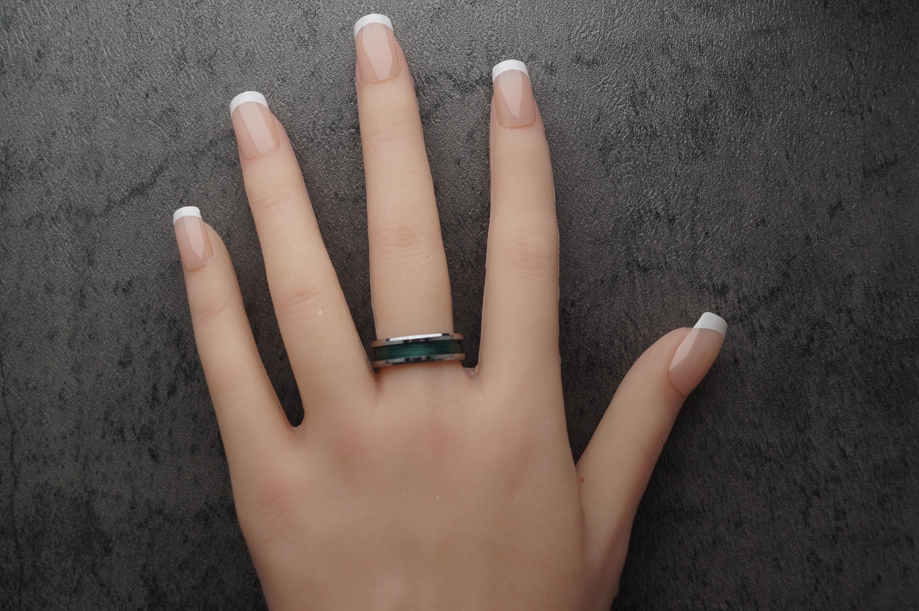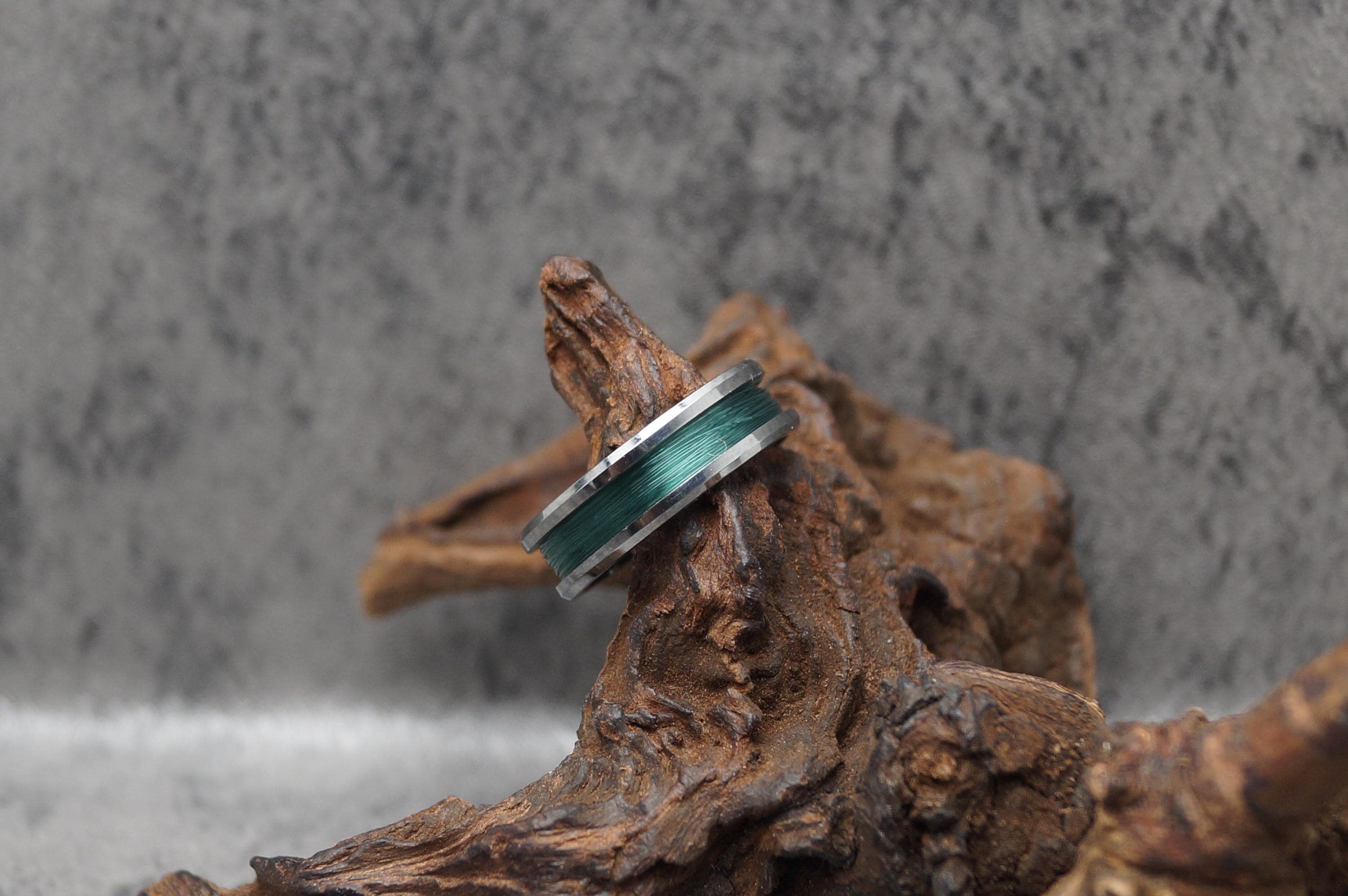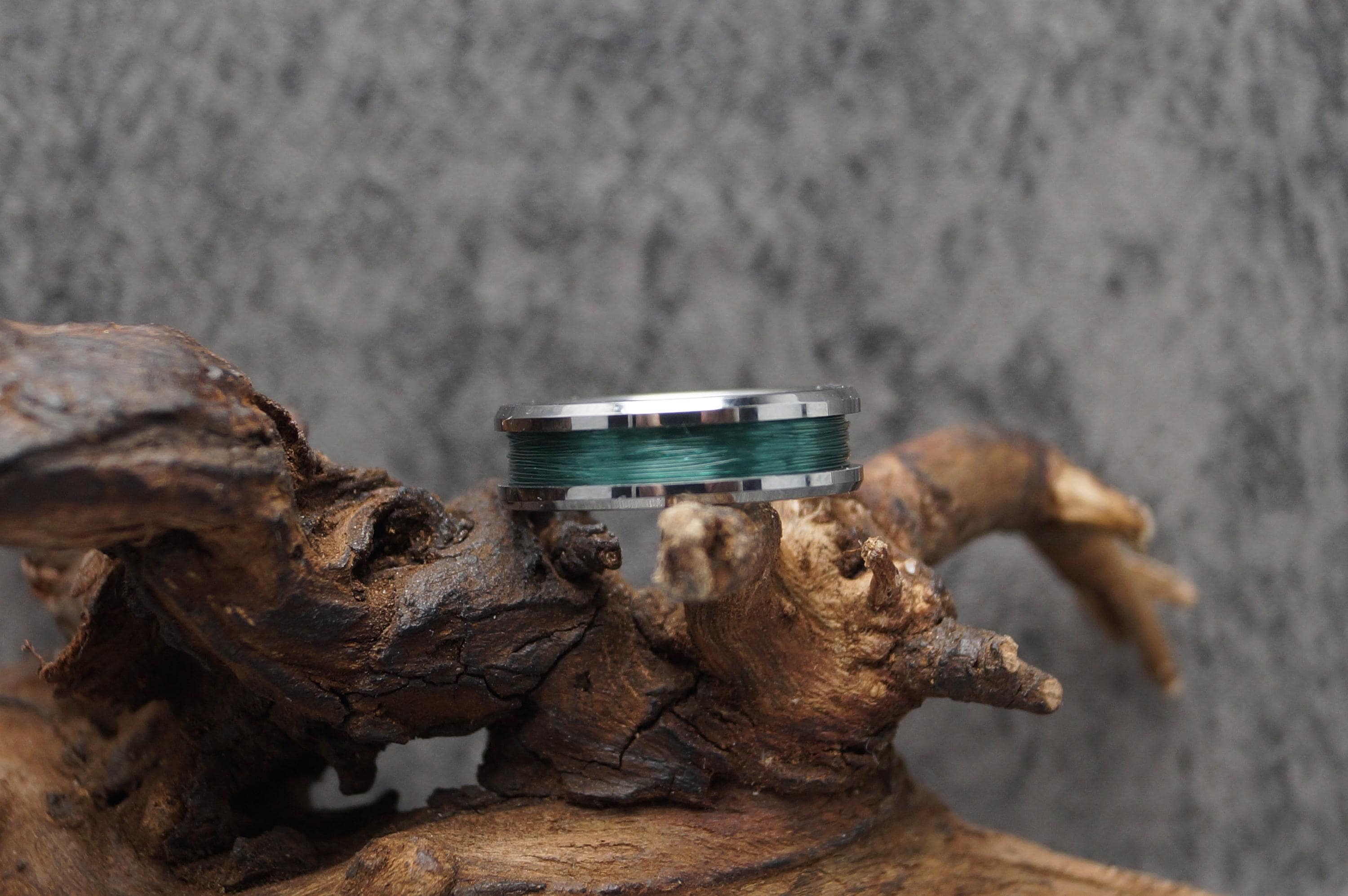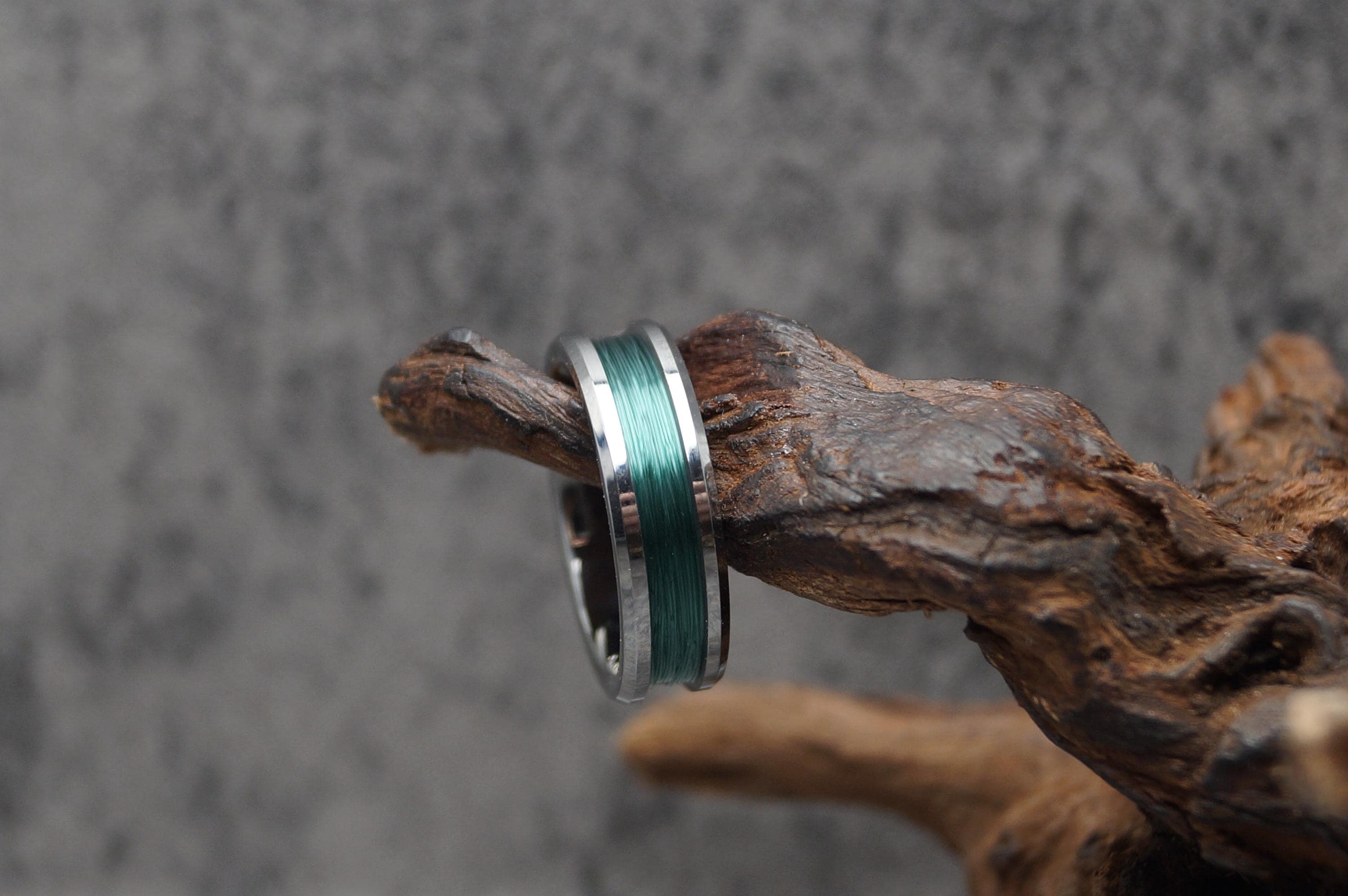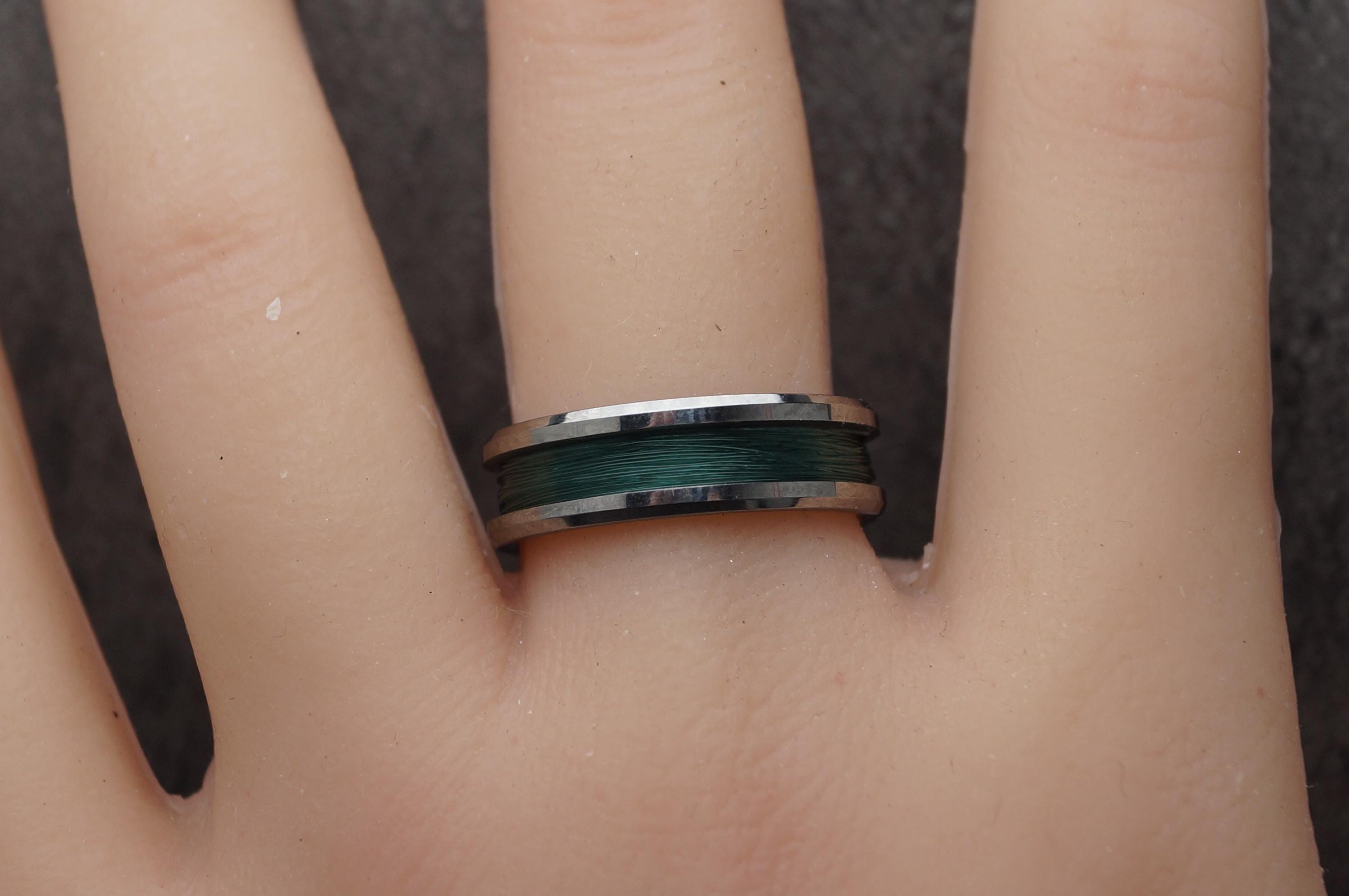 This genuine Tungsten Carbide ring is inlaid with genuine Fishing Line - Teal