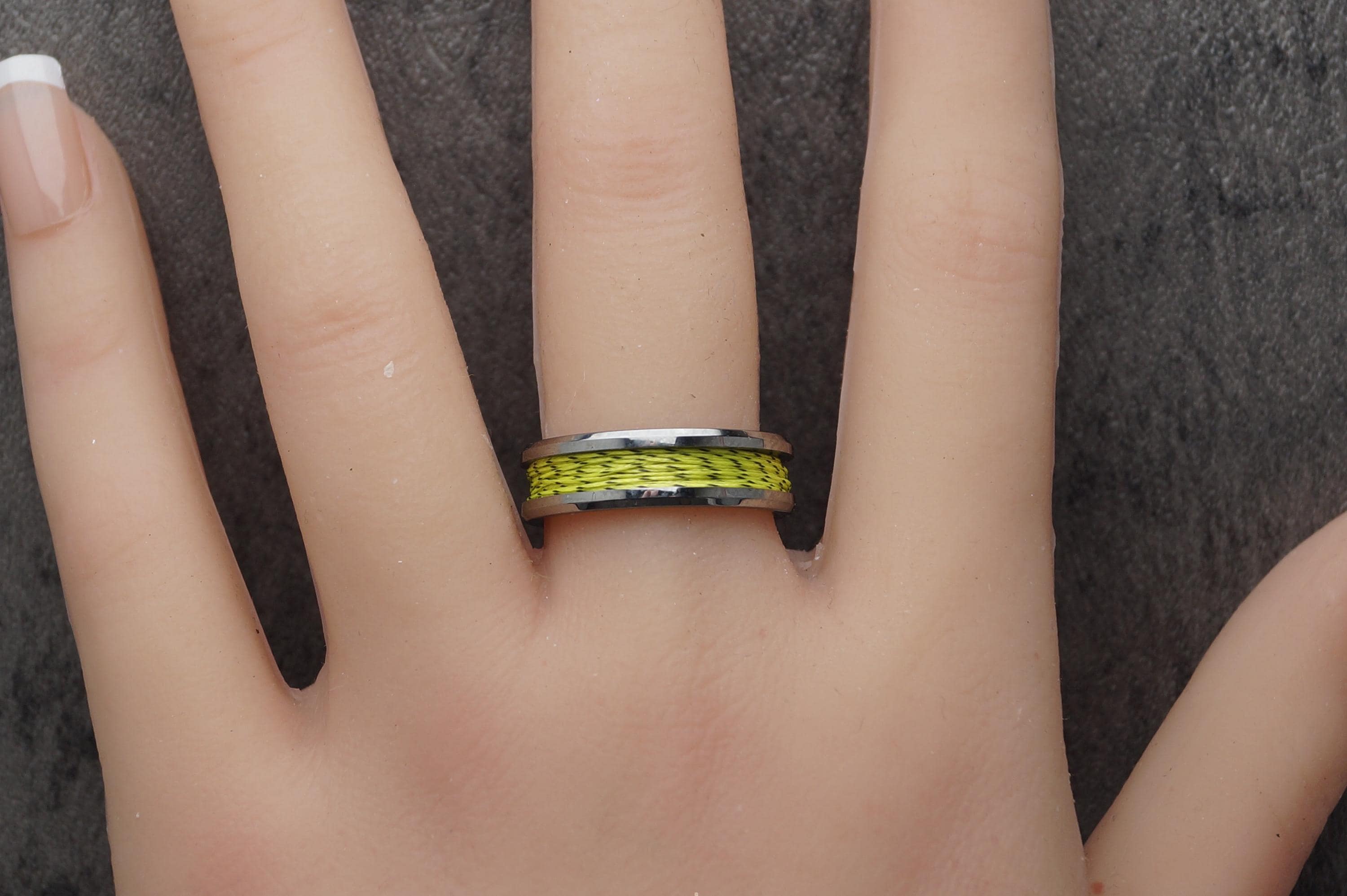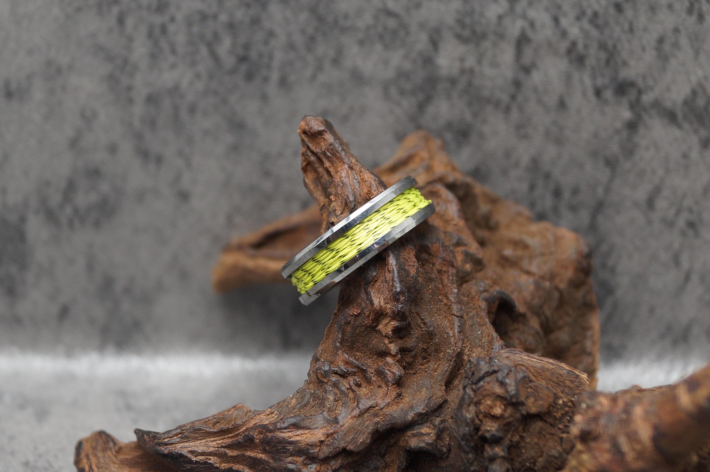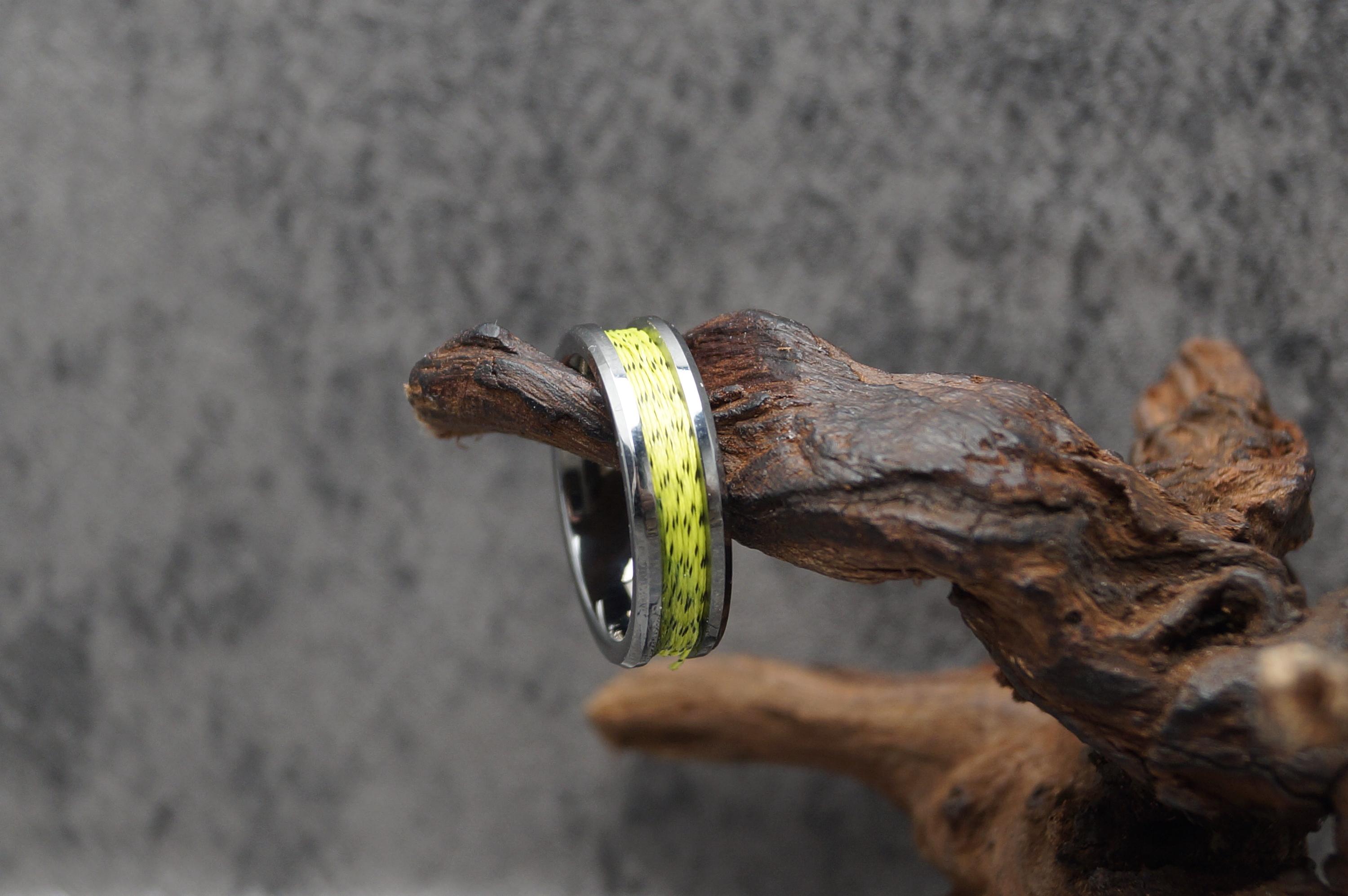 This genuine Tungsten Carbide ring is inlaid with genuine Spider-Line Green and Black Fishing Line.