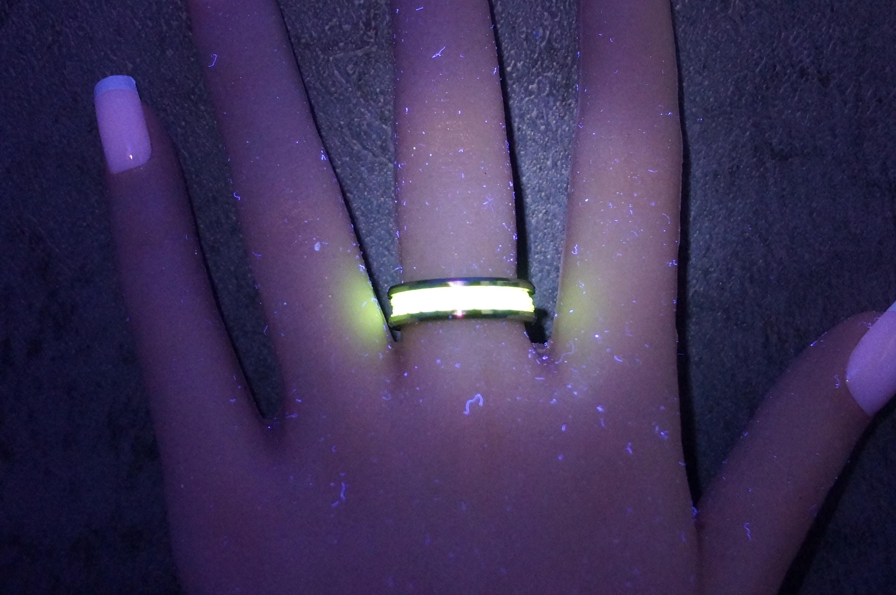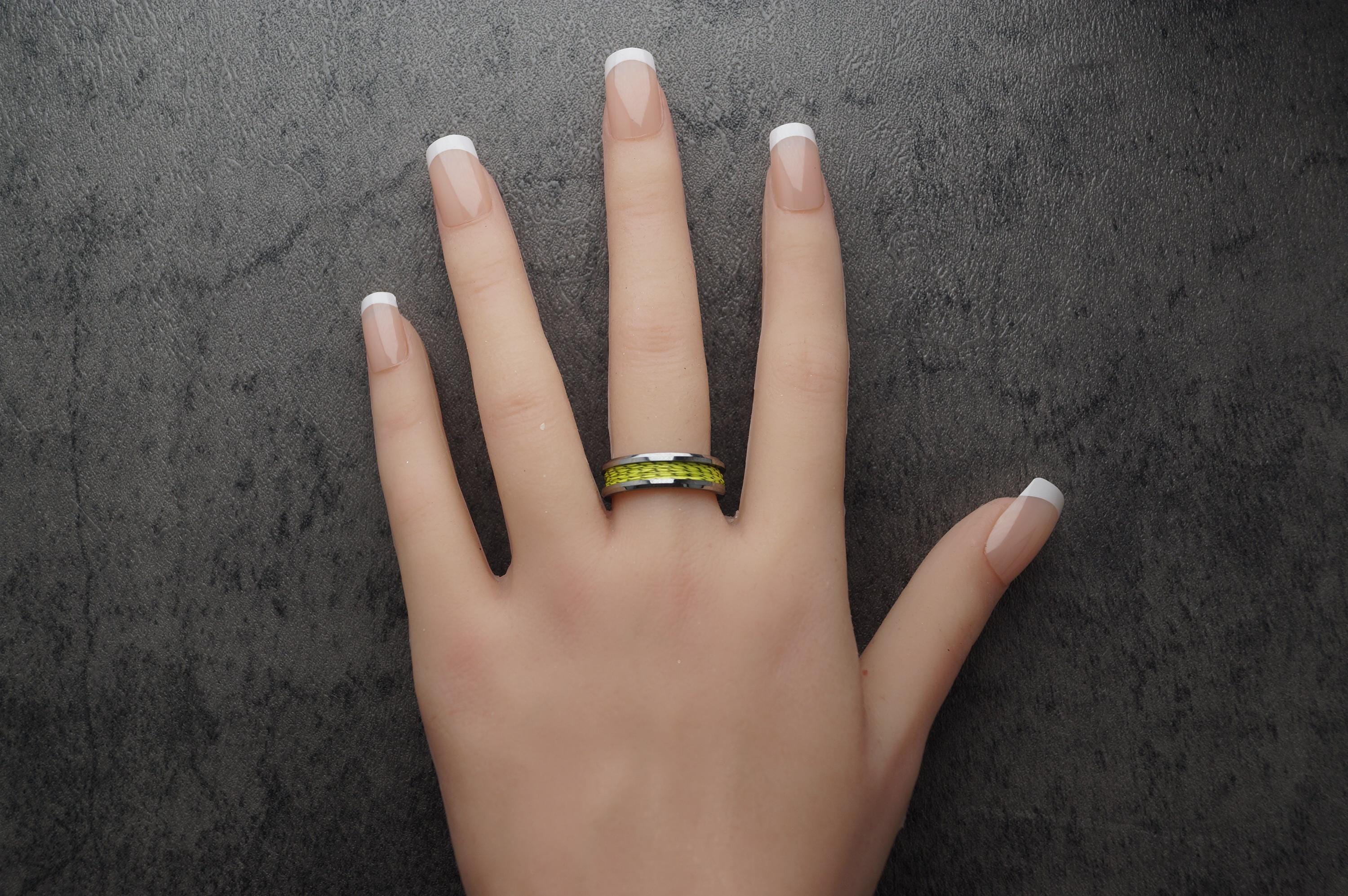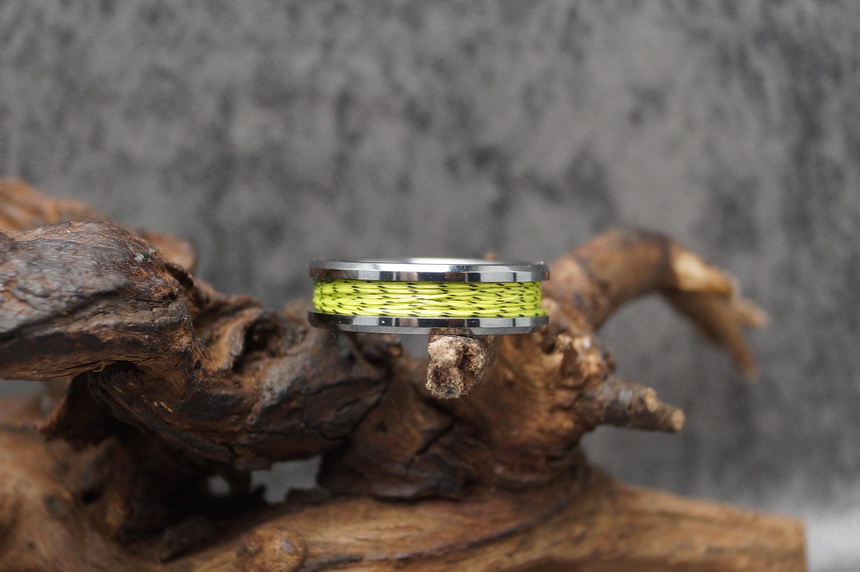 This genuine Tungsten Carbide ring is inlaid with genuine Spider-Line Green and Black Fishing Line.