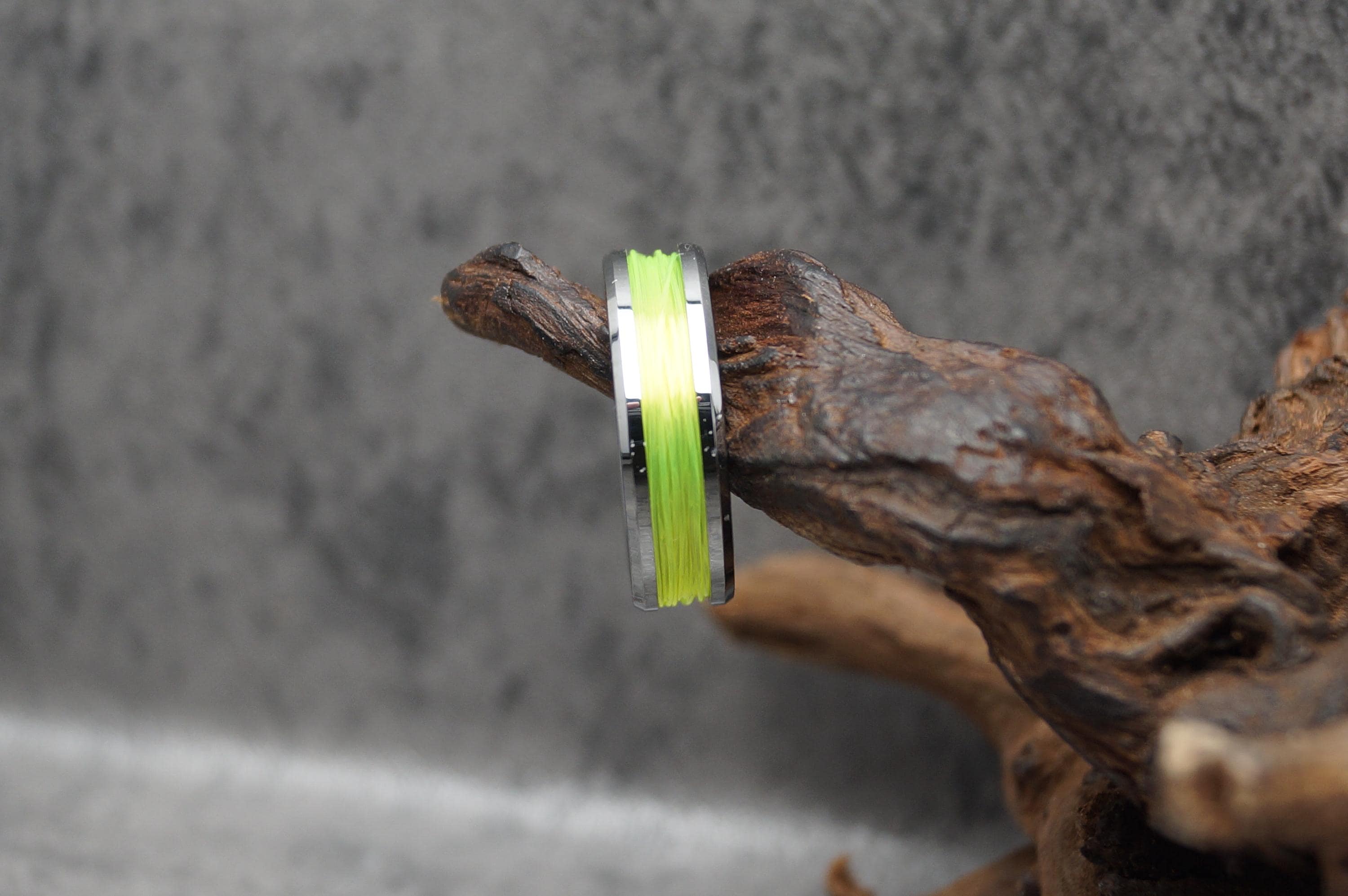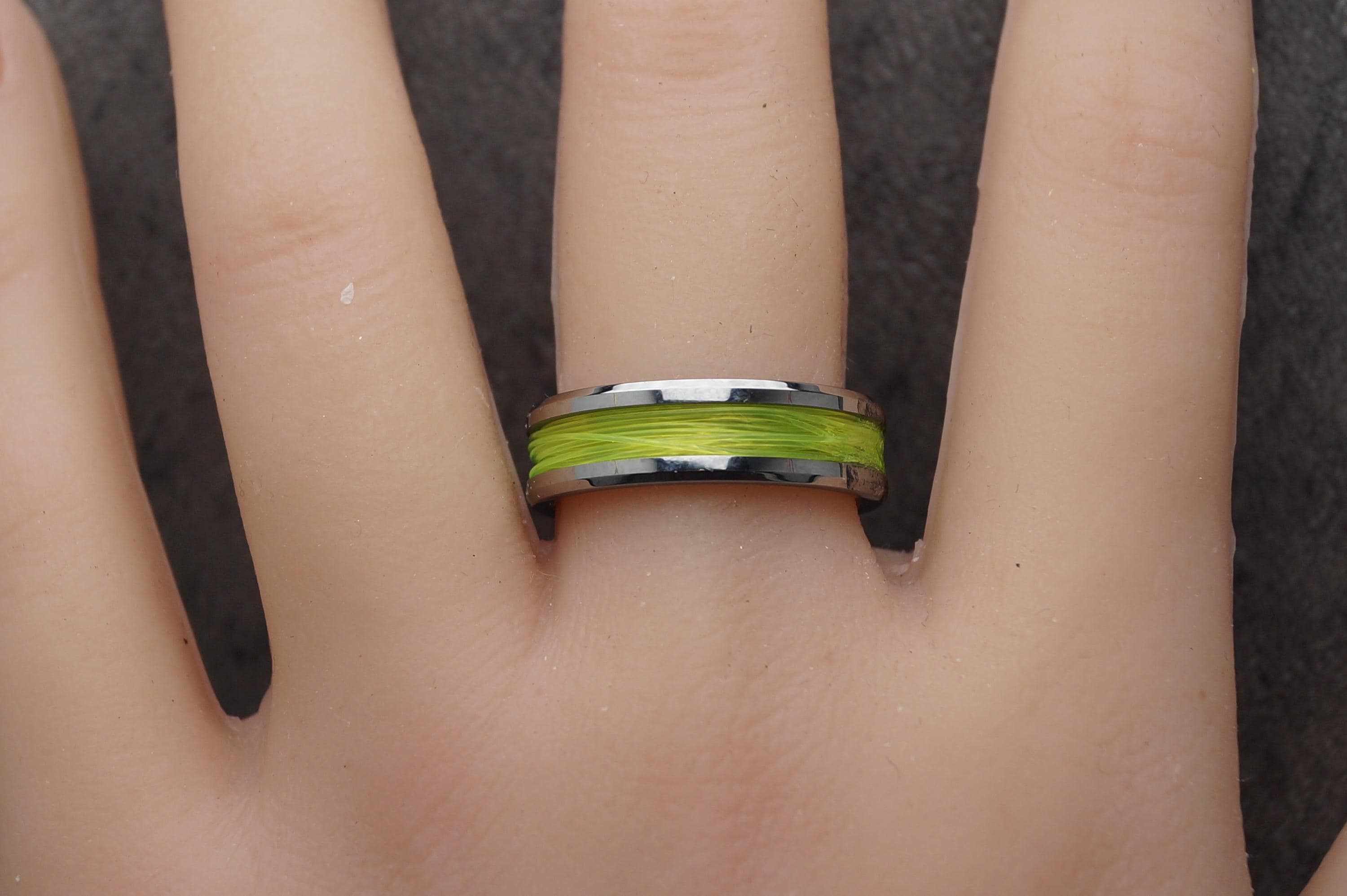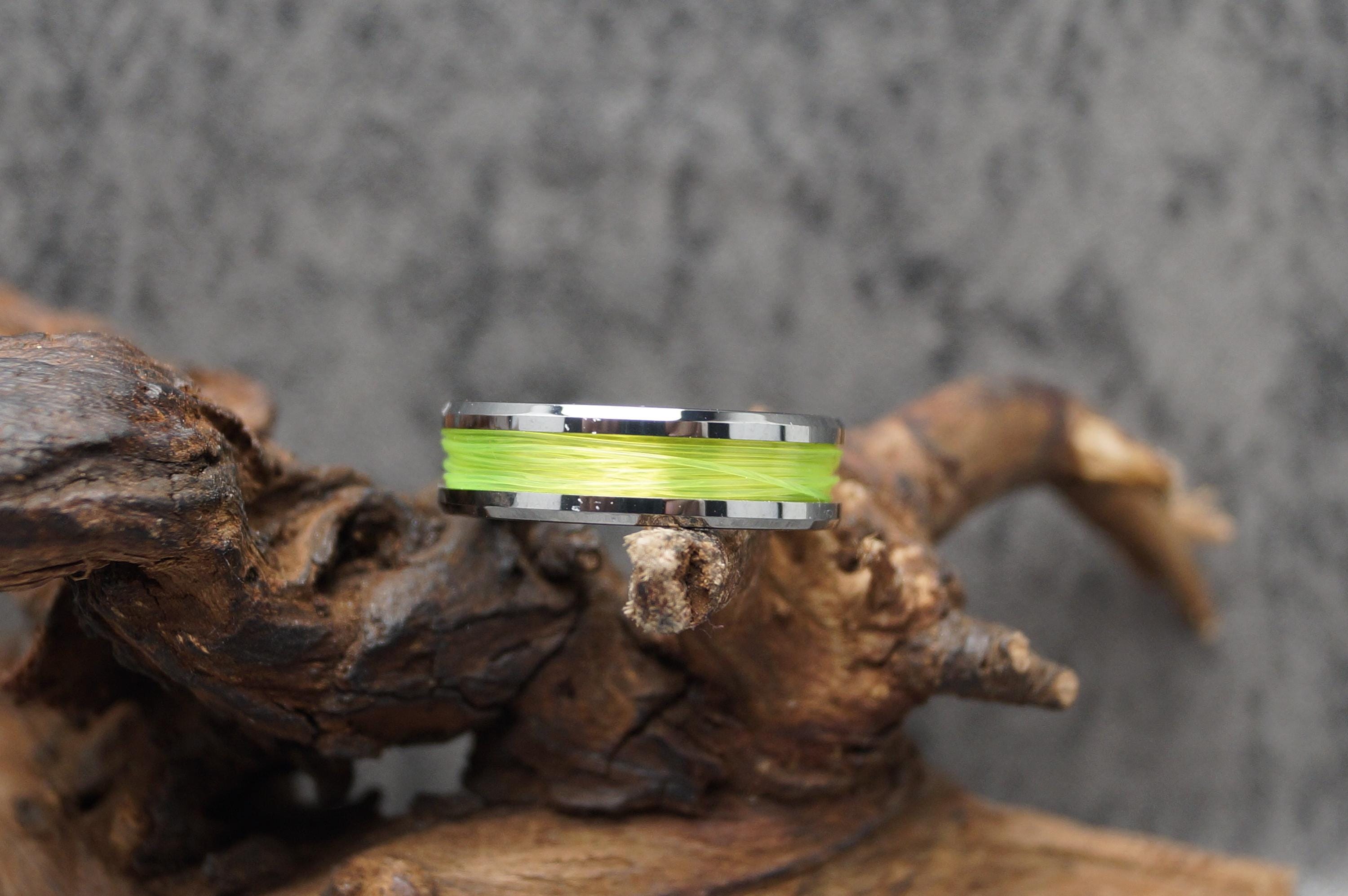 This genuine Tungsten Carbide ring is inlaid with genuine Fishing Line - UV Glow Yellow