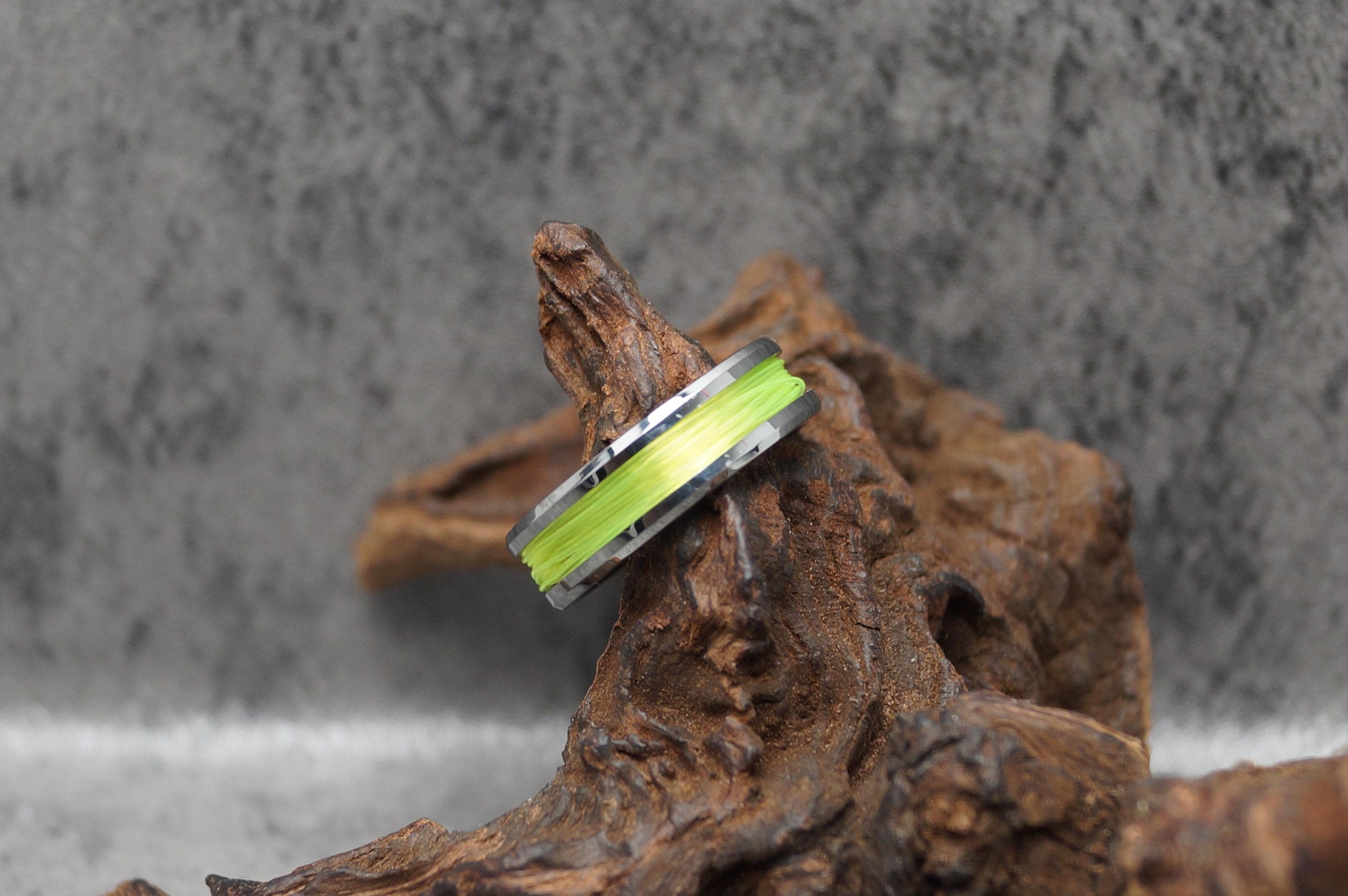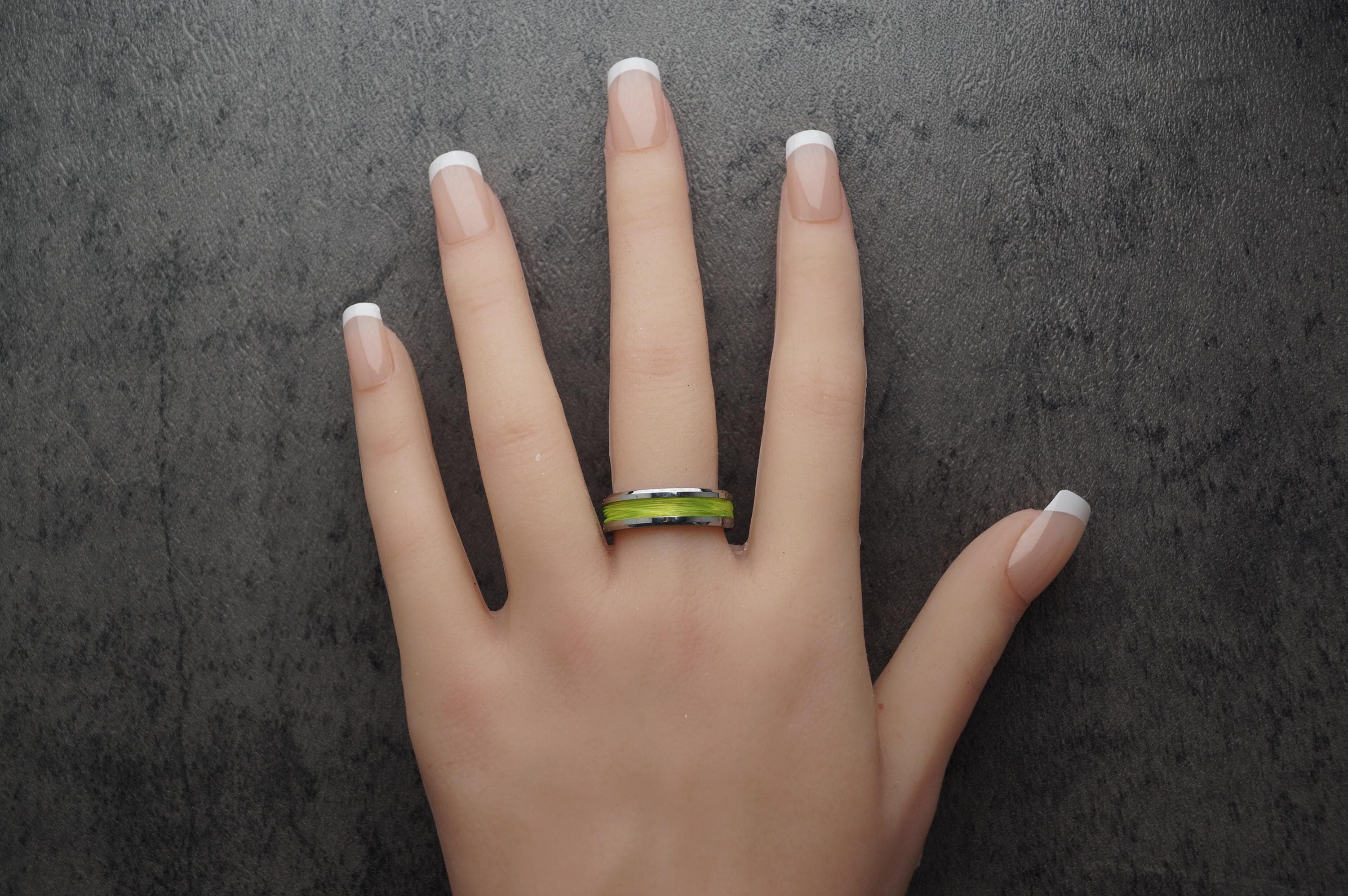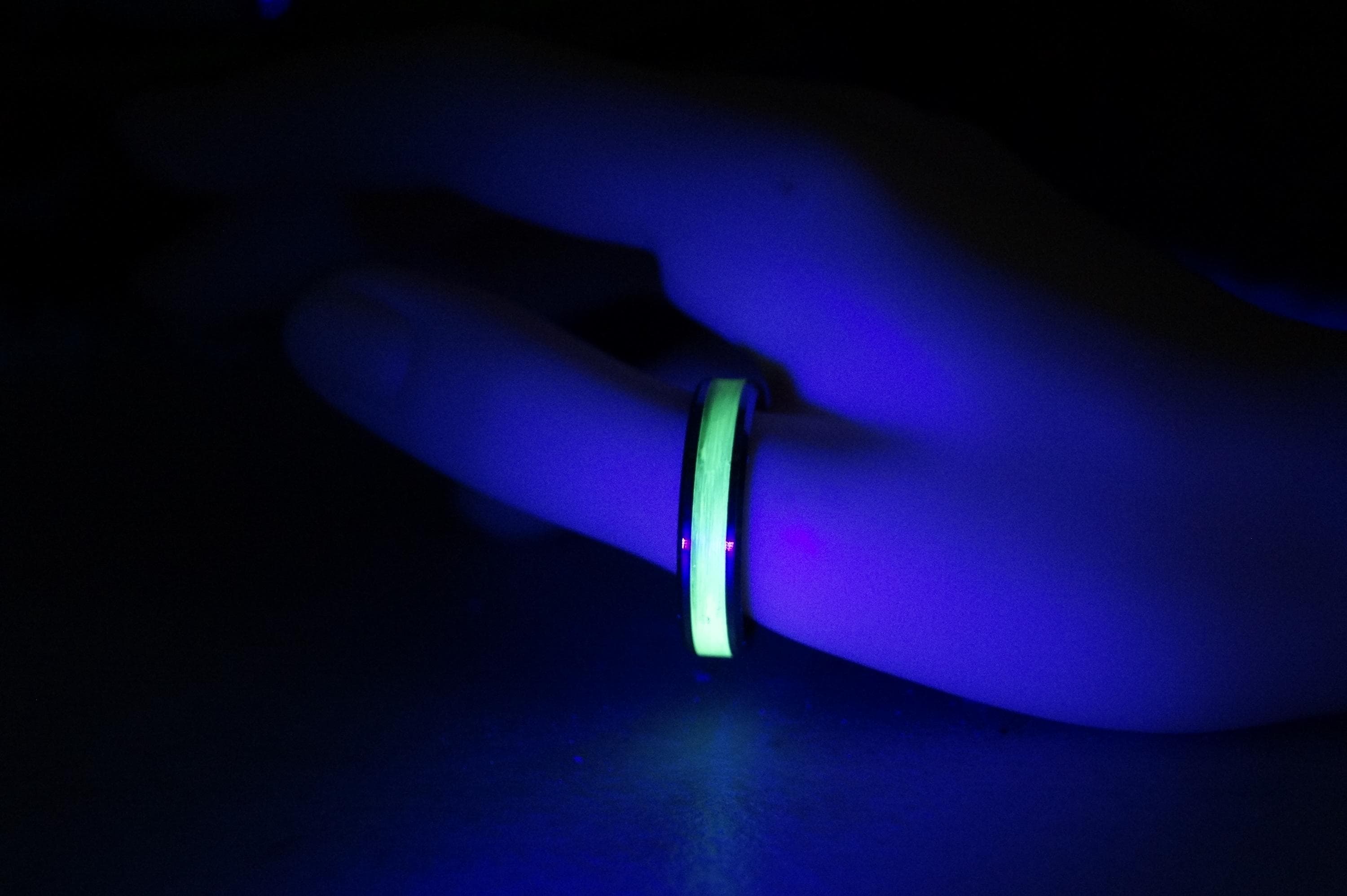 This genuine Tungsten Carbide ring is inlaid with genuine Fishing Line - UV Glow Yellow