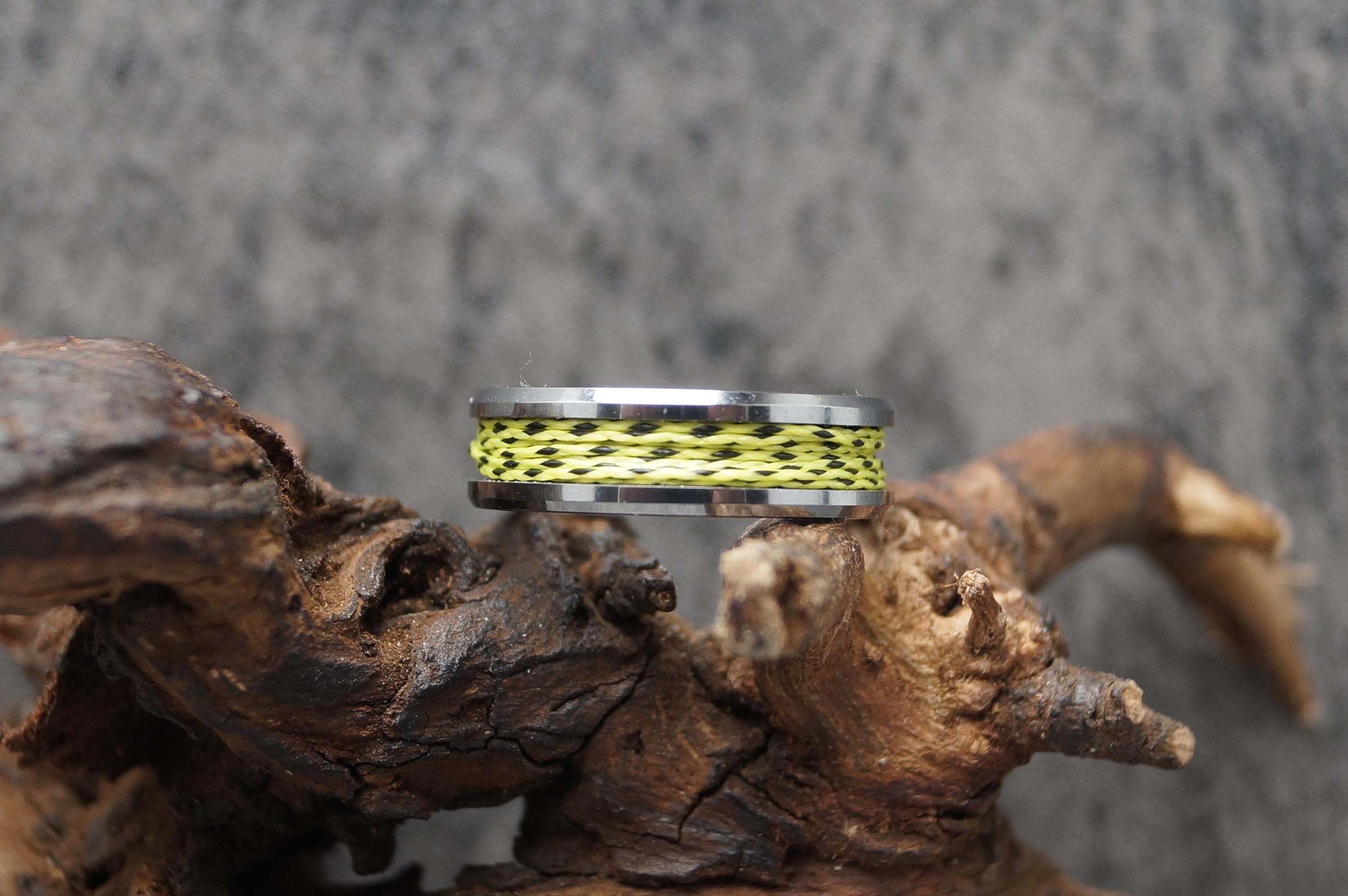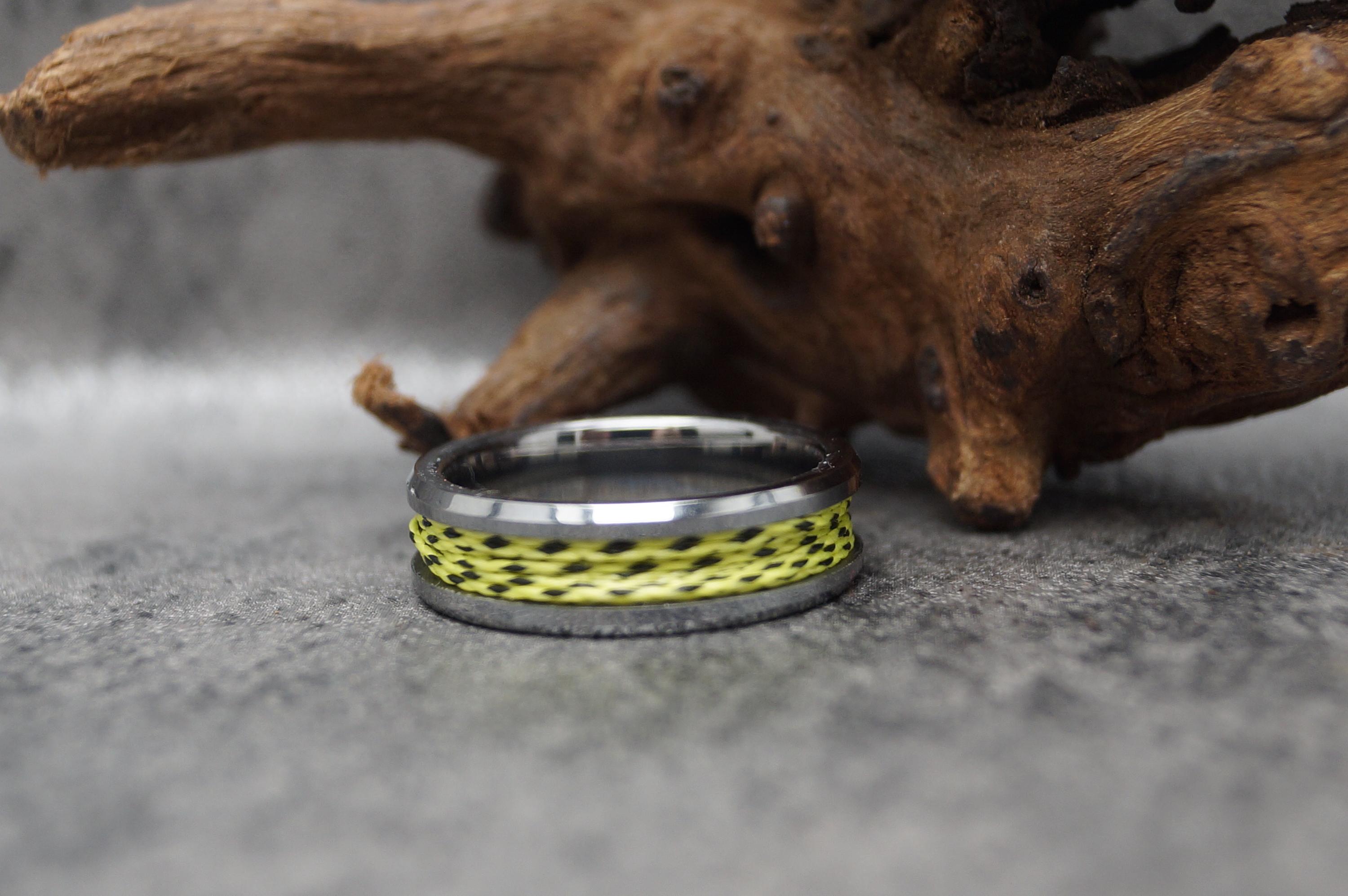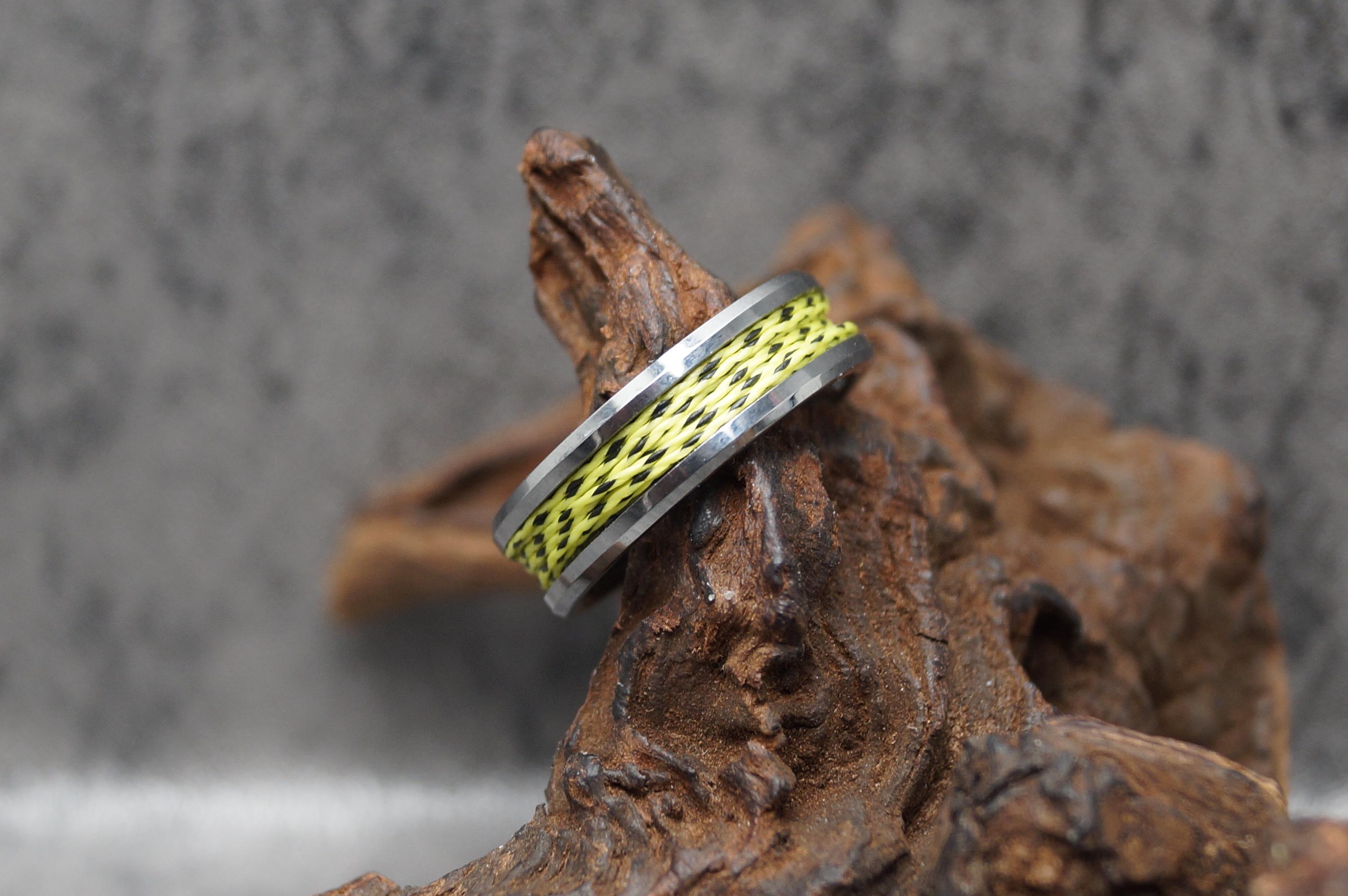 This genuine Tungsten Carbide ring is inlaid with genuine Fishing Line - Spider-Line Green and Black.