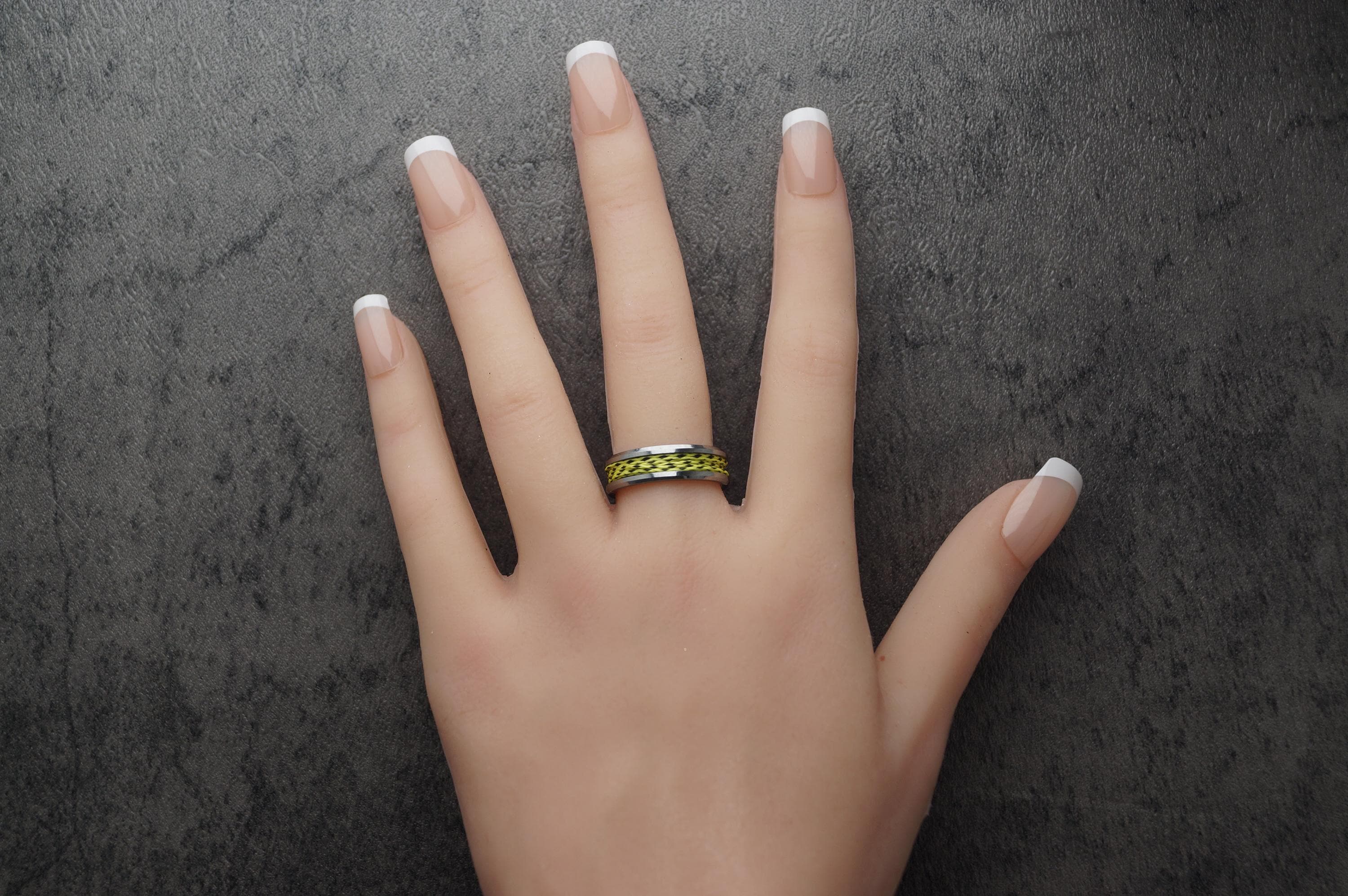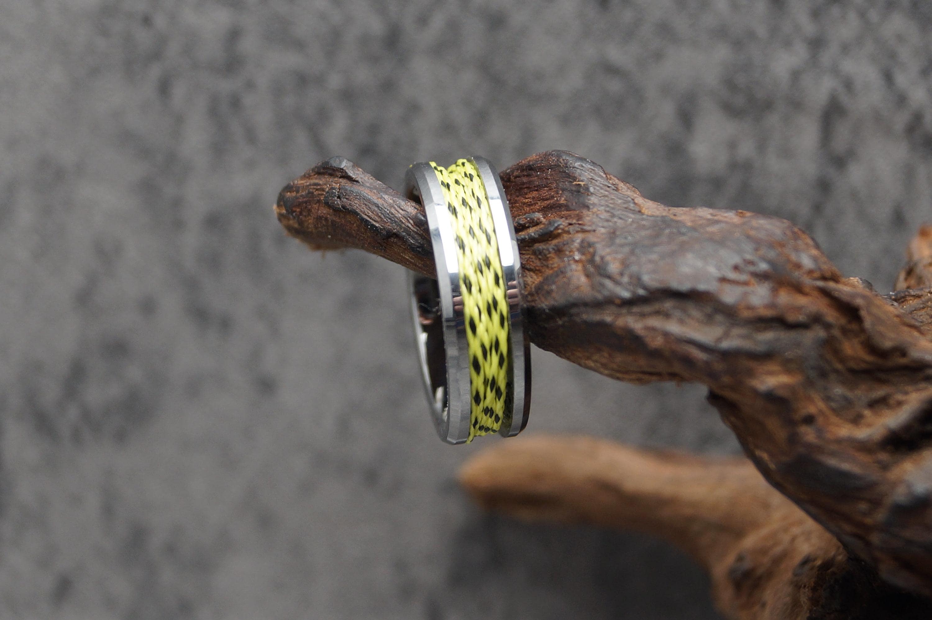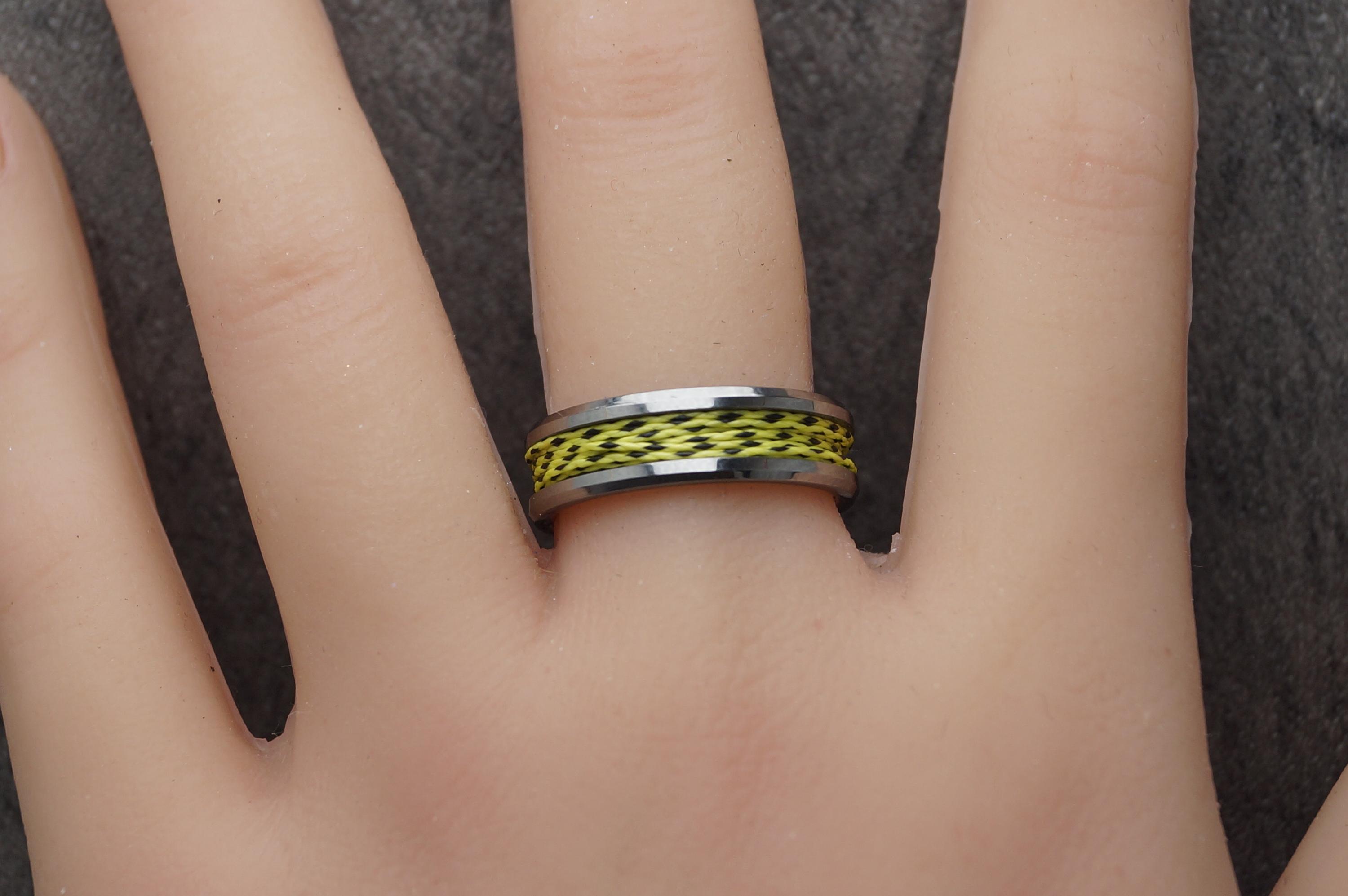 This genuine Tungsten Carbide ring is inlaid with genuine Fishing Line - Spider-Line Green and Black.
