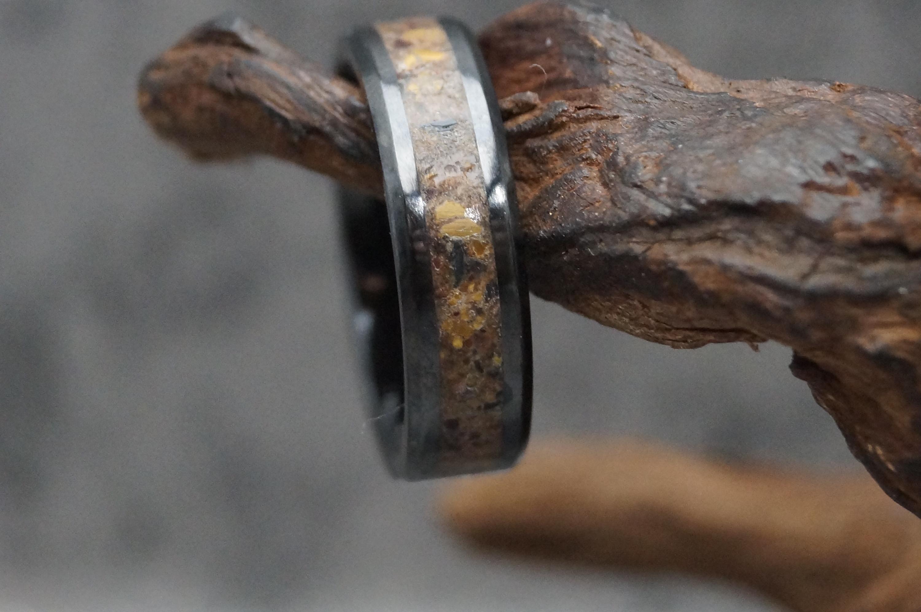 This genuine Black Ceramic ring inlaid with 100% Natural Tiger Eye.