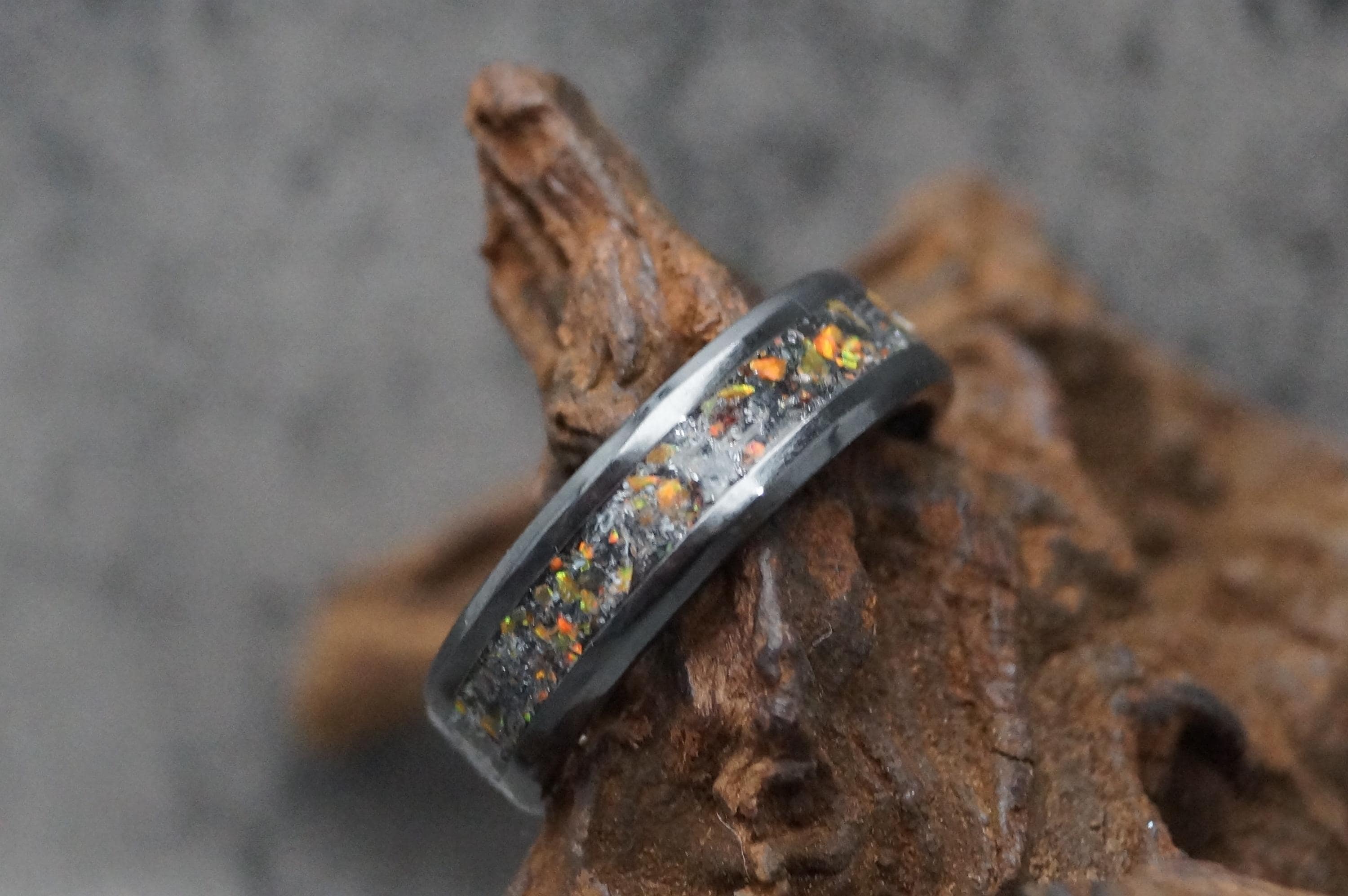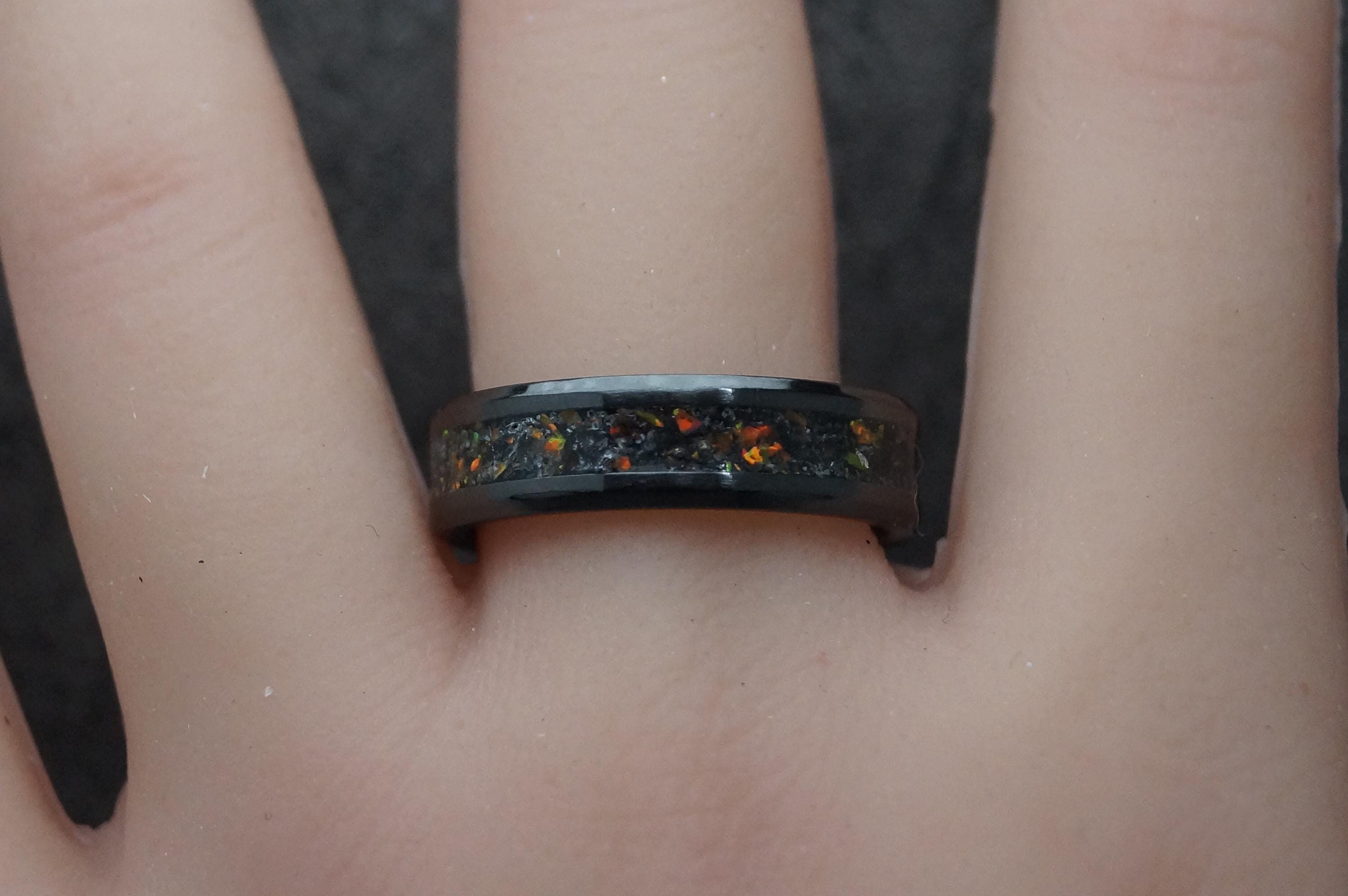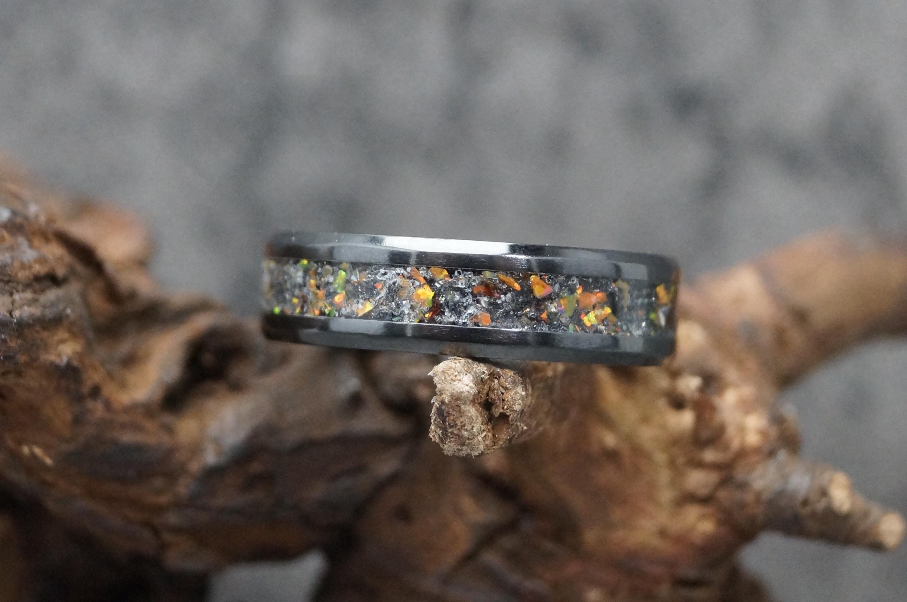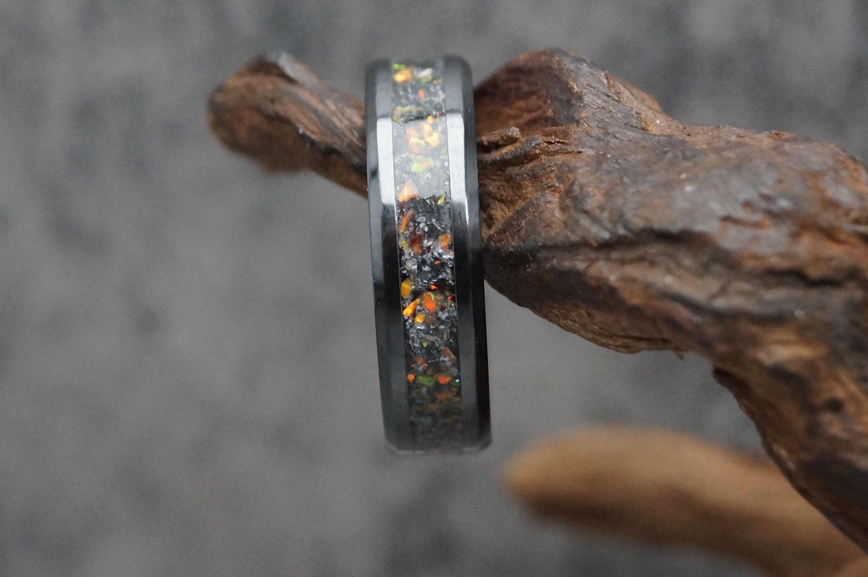 Fire Opal & Natural Peacock Ore Inlay Black Ceramic Ring available 4 mm, 6 mm or 8 mm wide ring - Black Ceramic Inlaid with Fire Opal & Natural Peacock Ore. 4 mm, 6 mm or 8 mm wide Black Ceramic Ring - Every ring is a unique ring