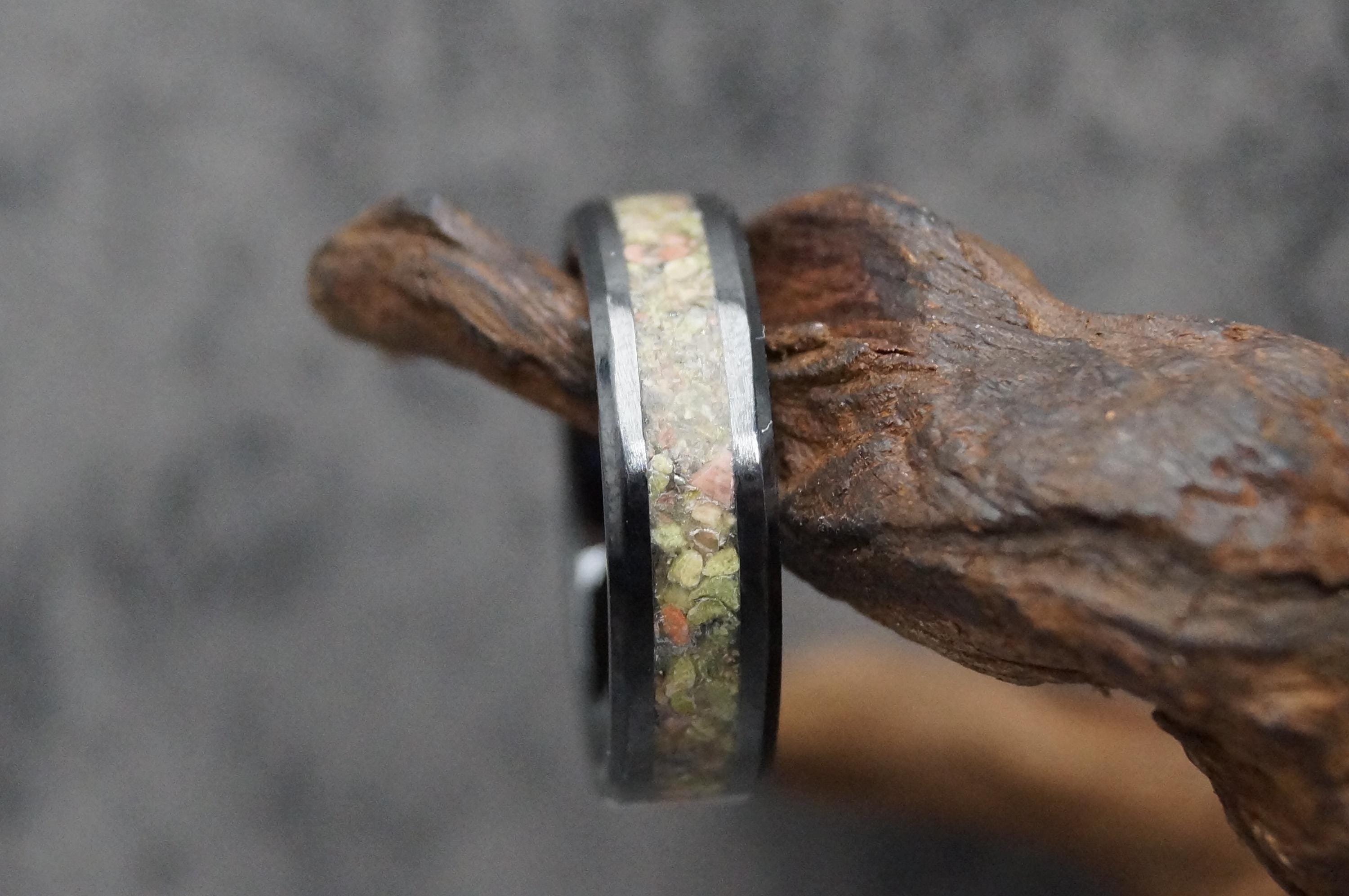 This genuine Black Ceramic ring inlaid with 100% Natural Unakite.