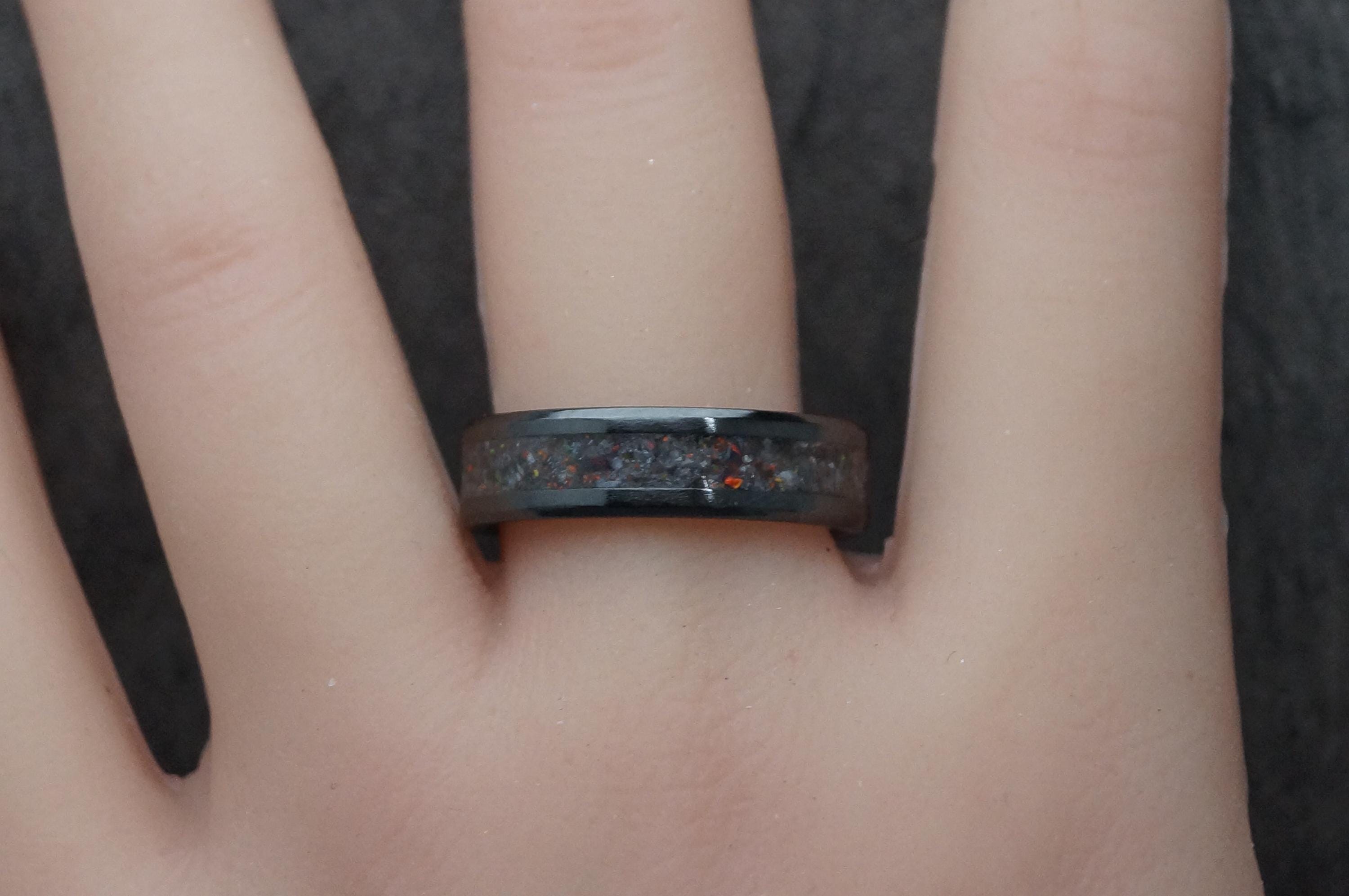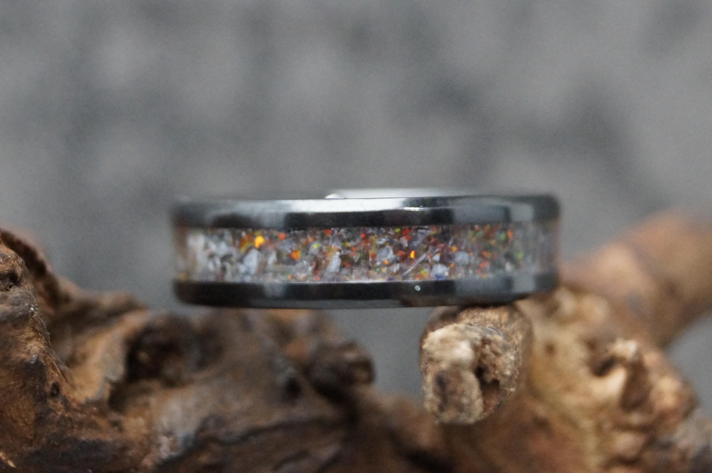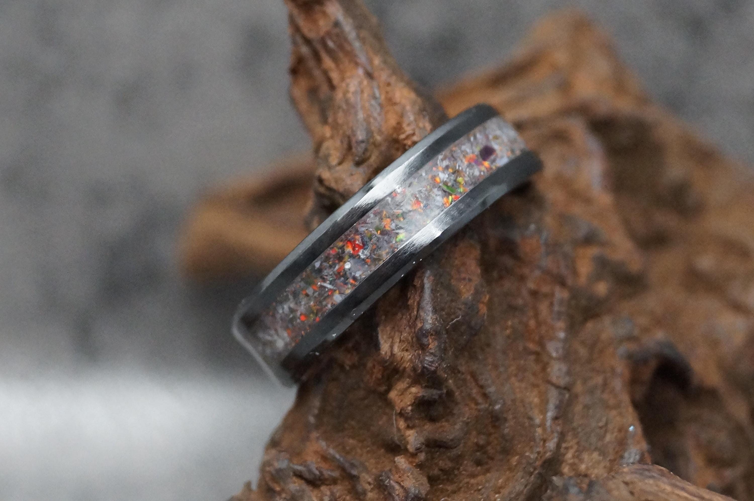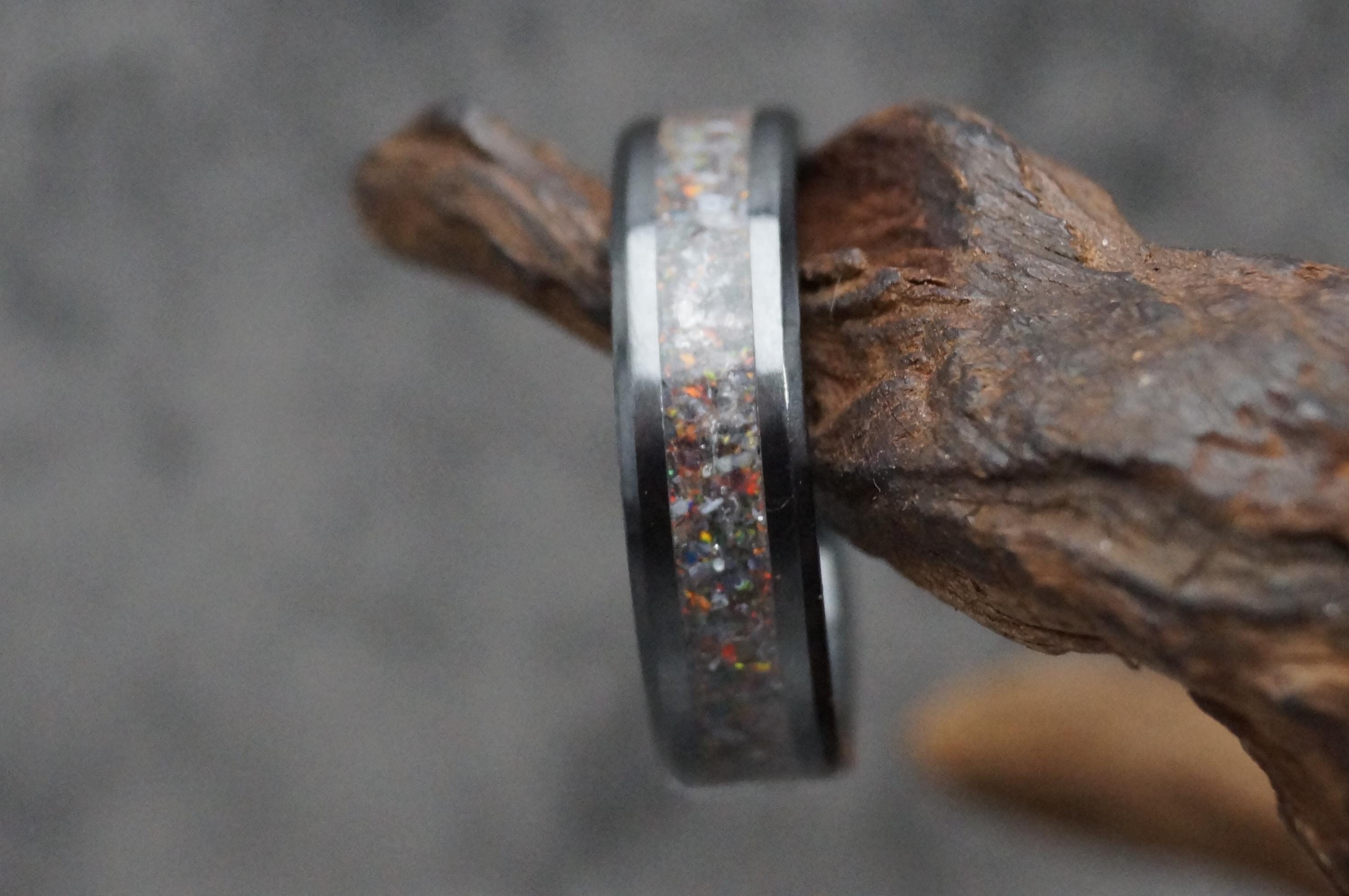 Black Opal & Natural Madagascar White Opal Black Ceramic Ring / Wedding Band - Ring for men and women - Every Ring Unique