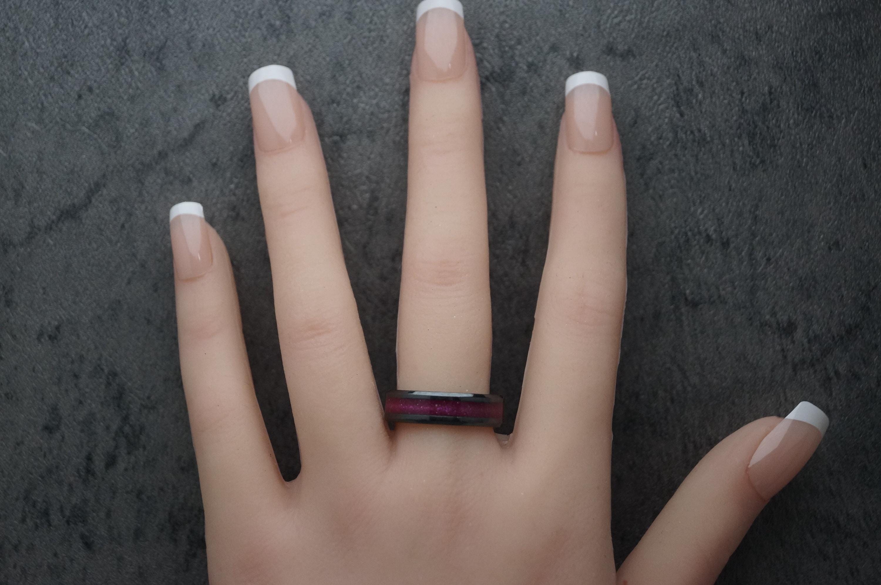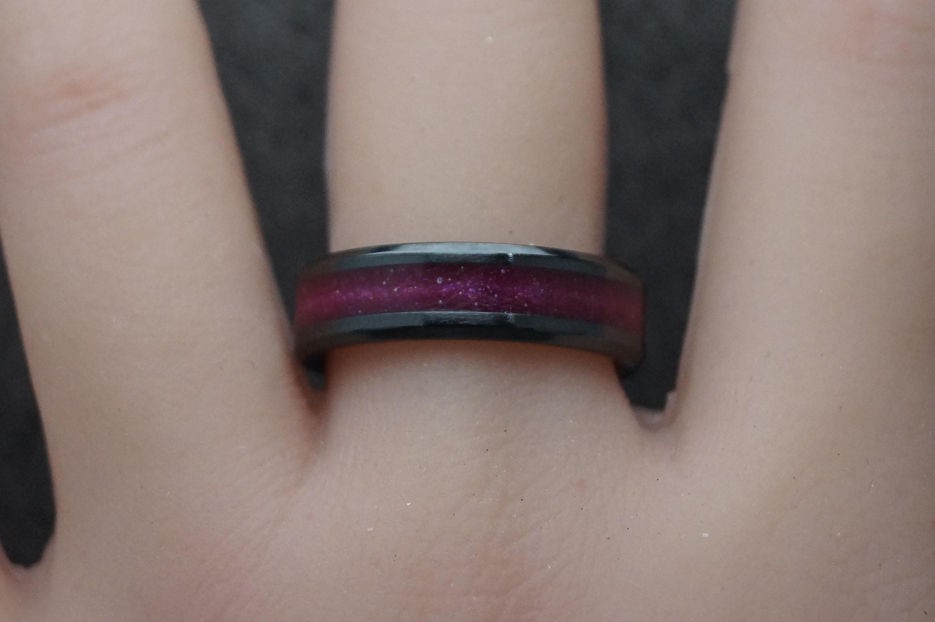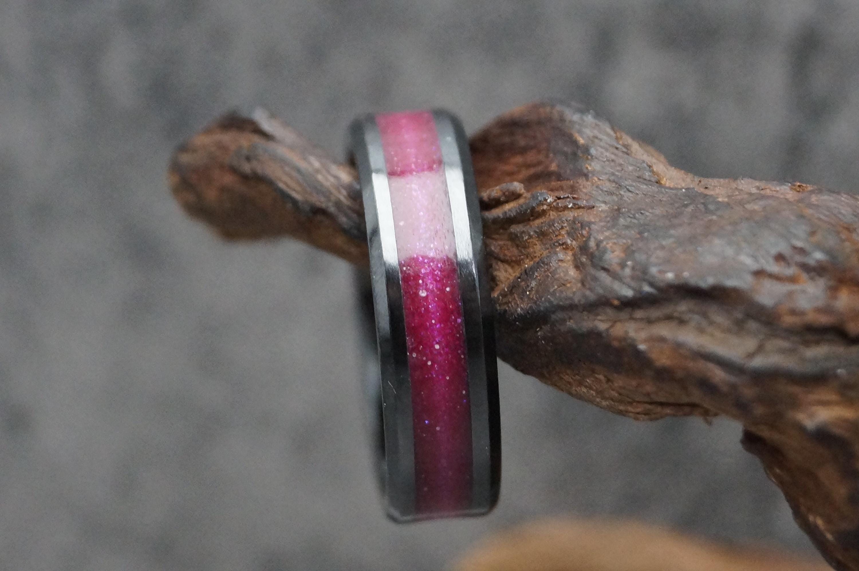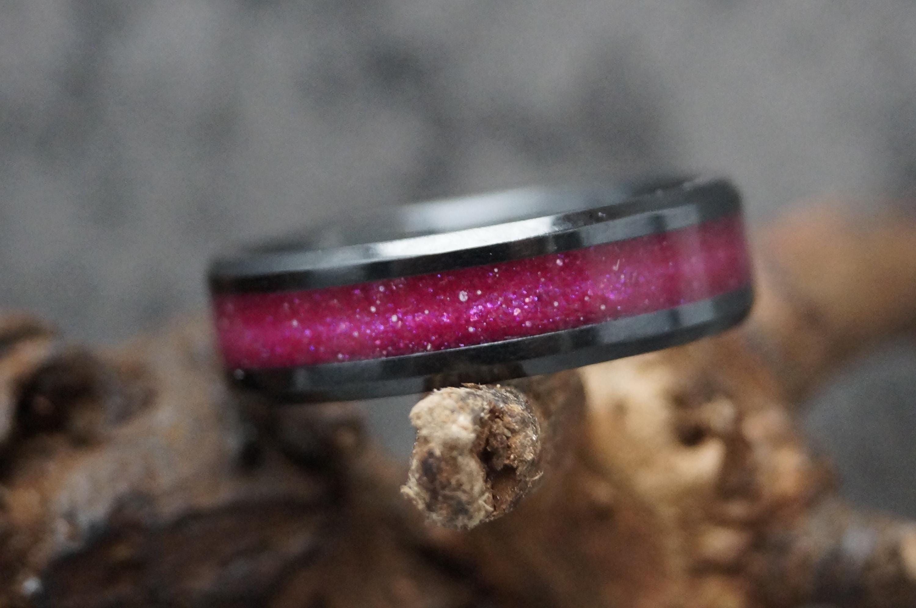 Pet Fur Ring or Pet Ashes Ring with Magenta Eco-Glitter Black Ceramic Band 4 mm, 6 mm or 8 mm wide ring