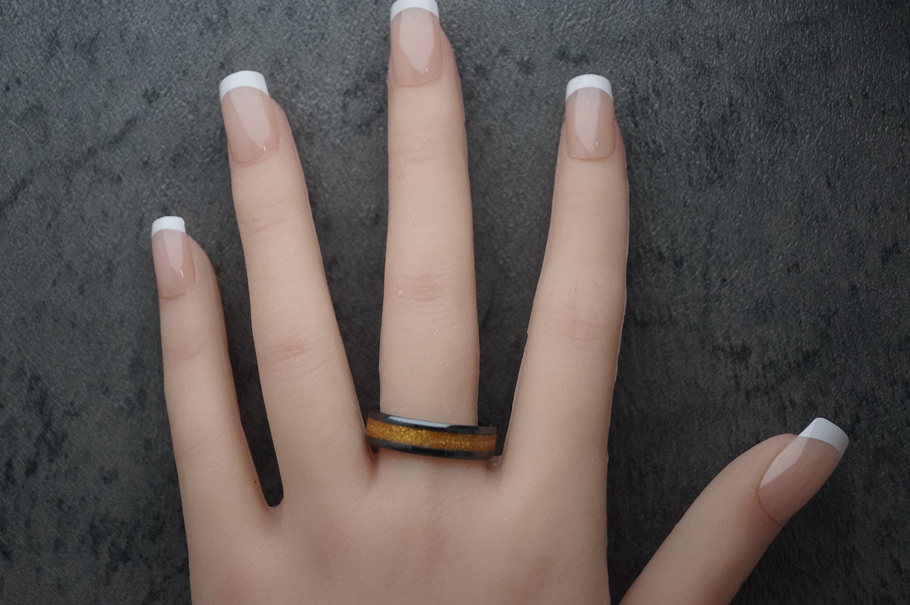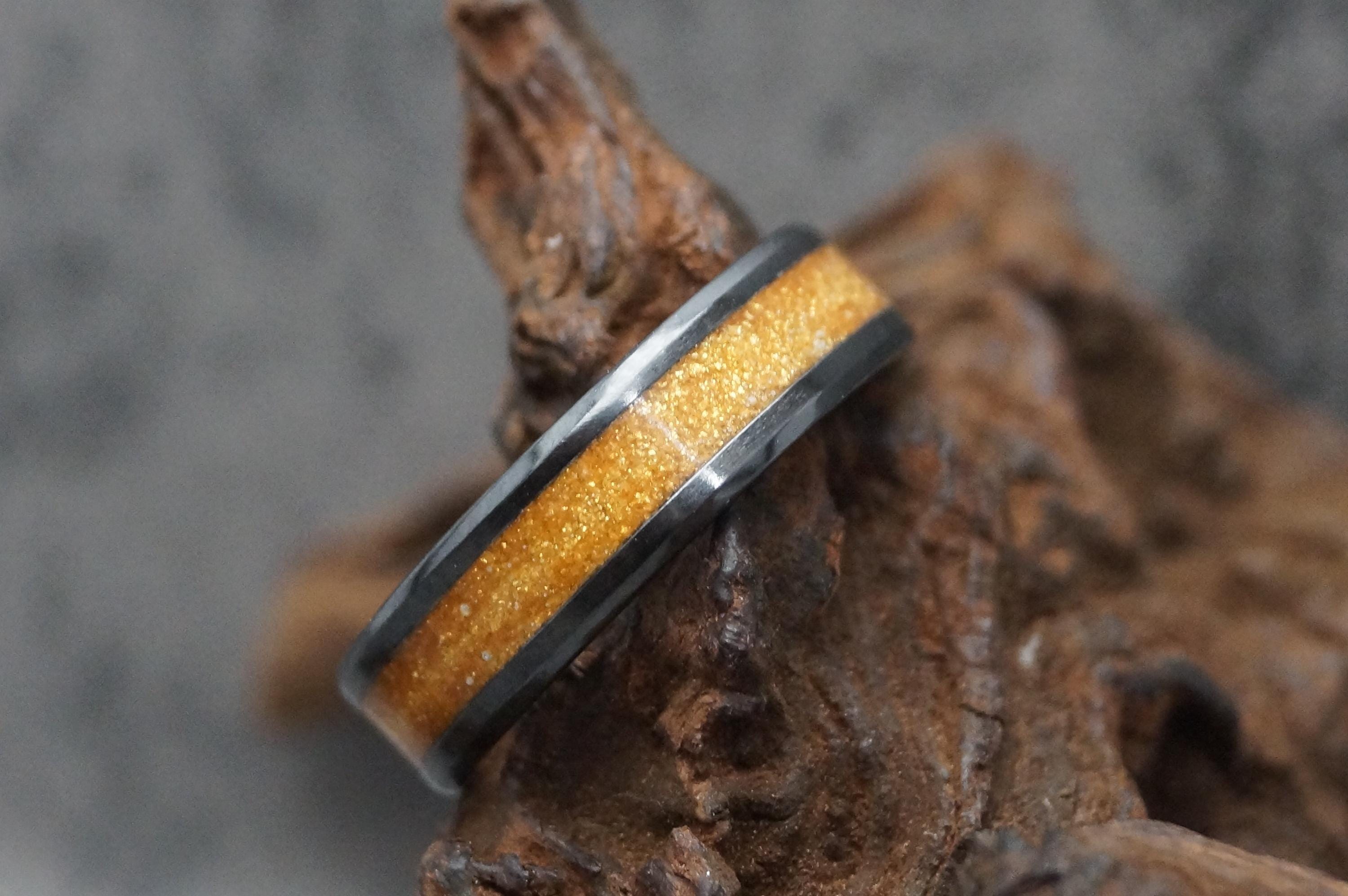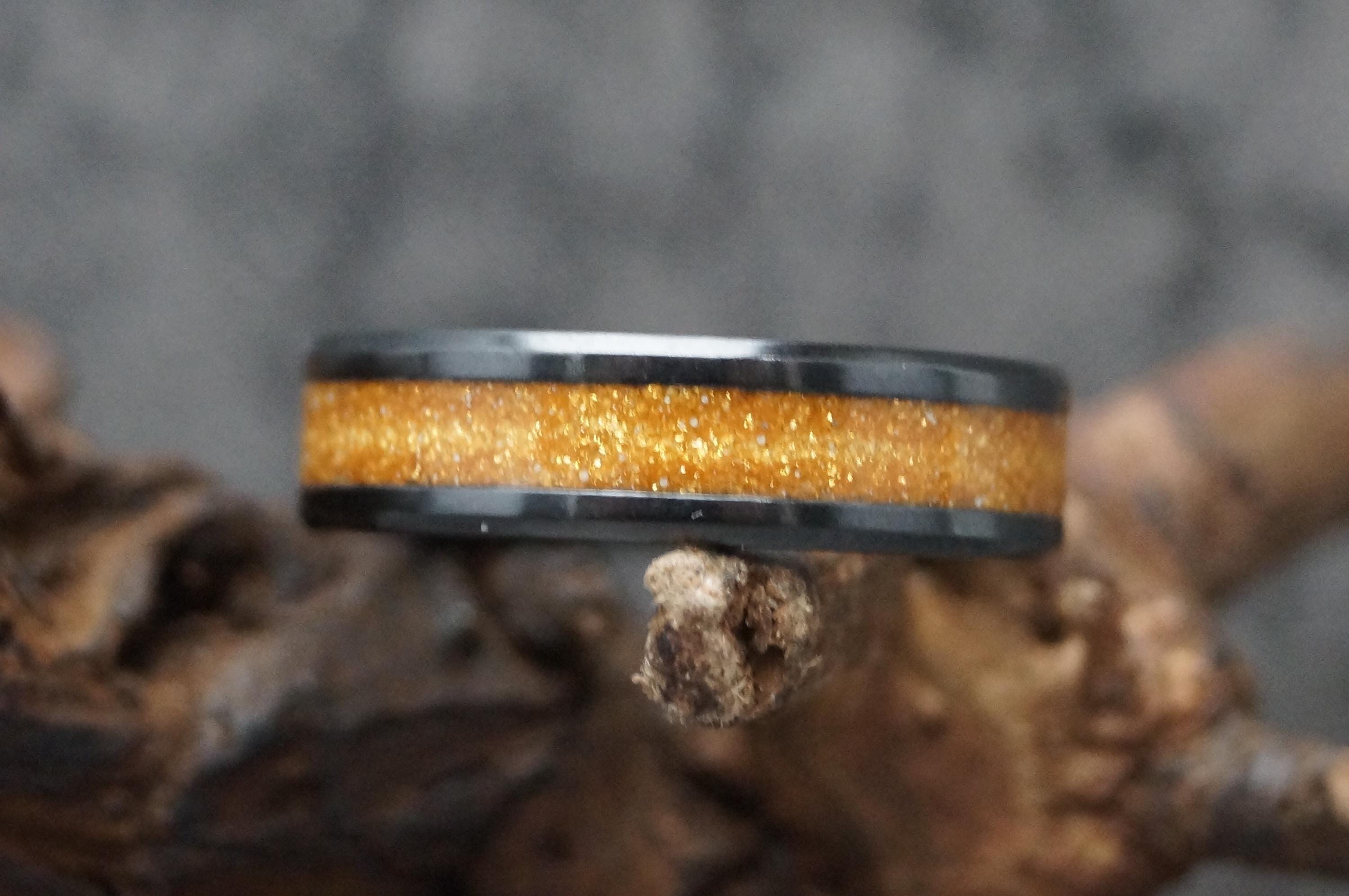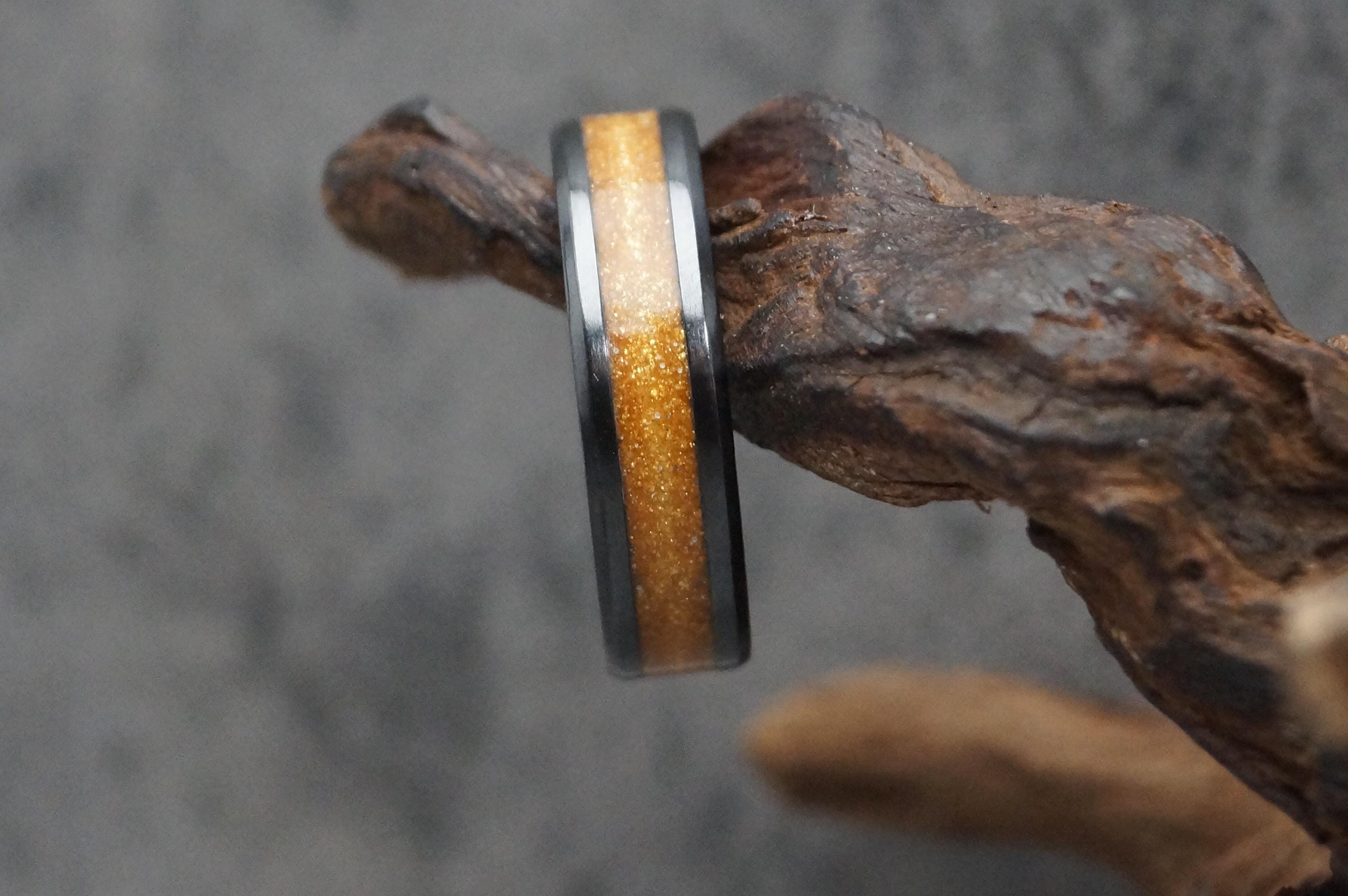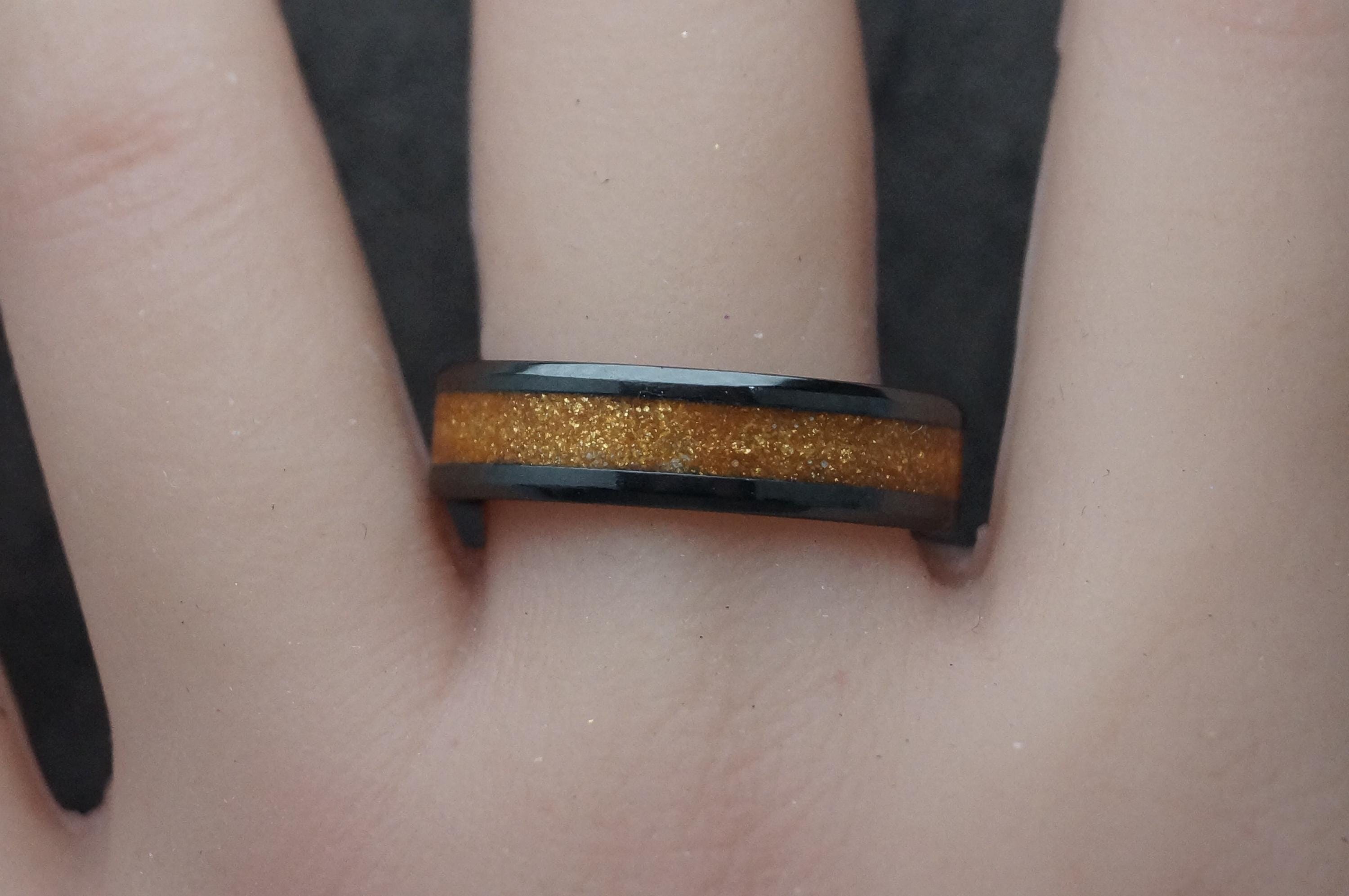 Pet Fur Ring or Pet Ashes Ring with Gold Eco-Glitter Black Ceramic Band 4 mm, 6 mm or 8 mm wide ring