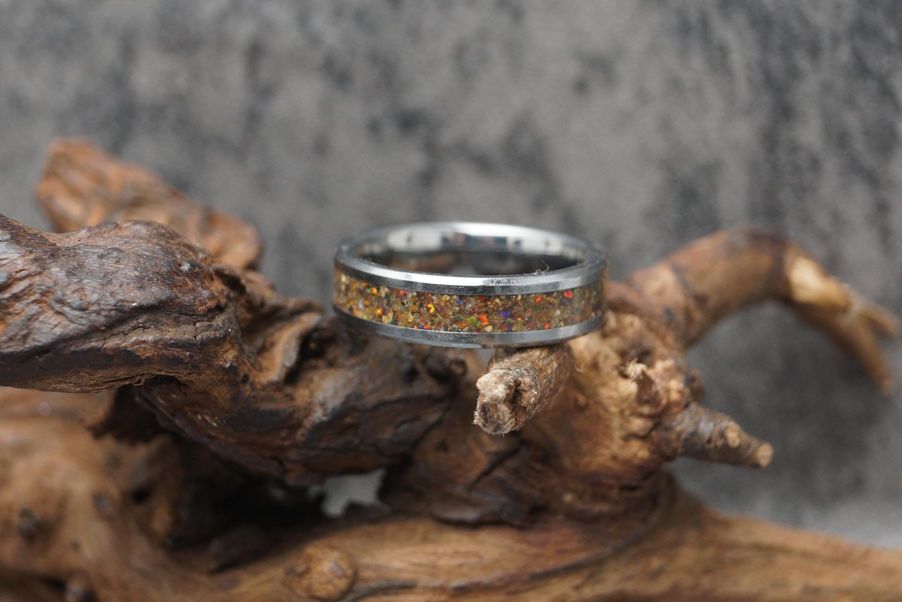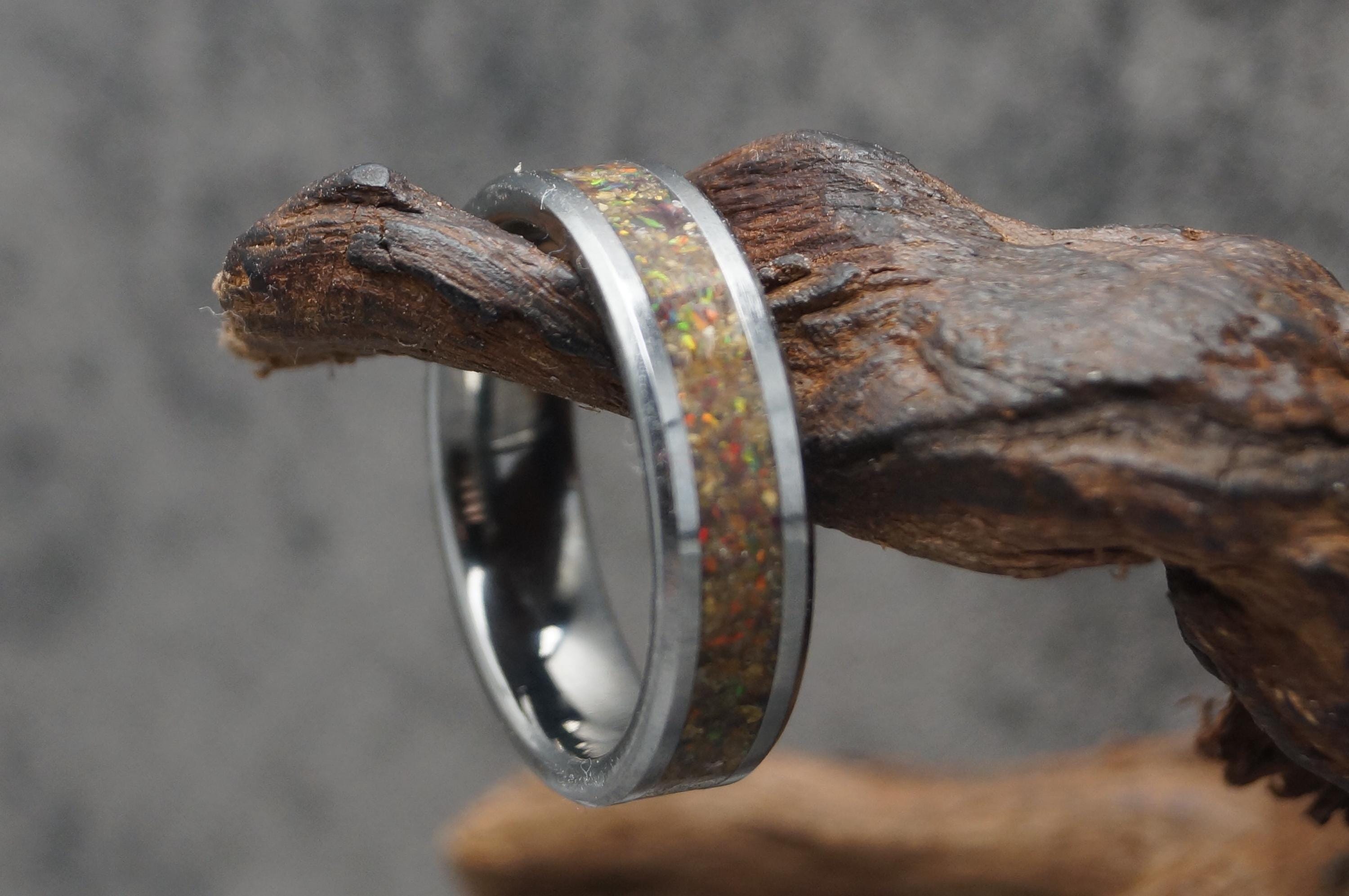 This genuine Tungsten Carbide ring inlaid with Black Opal & Megalodon Tooth