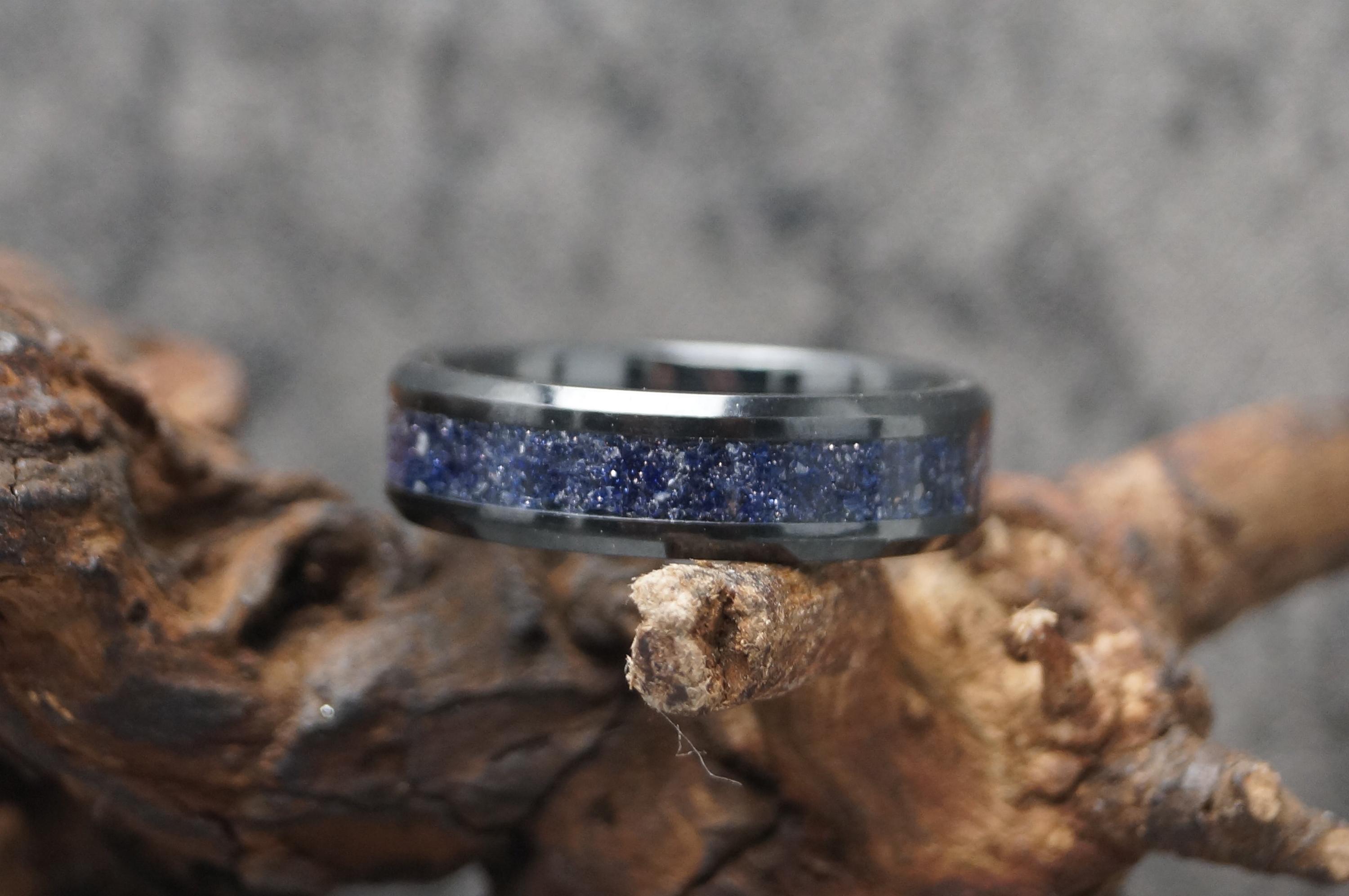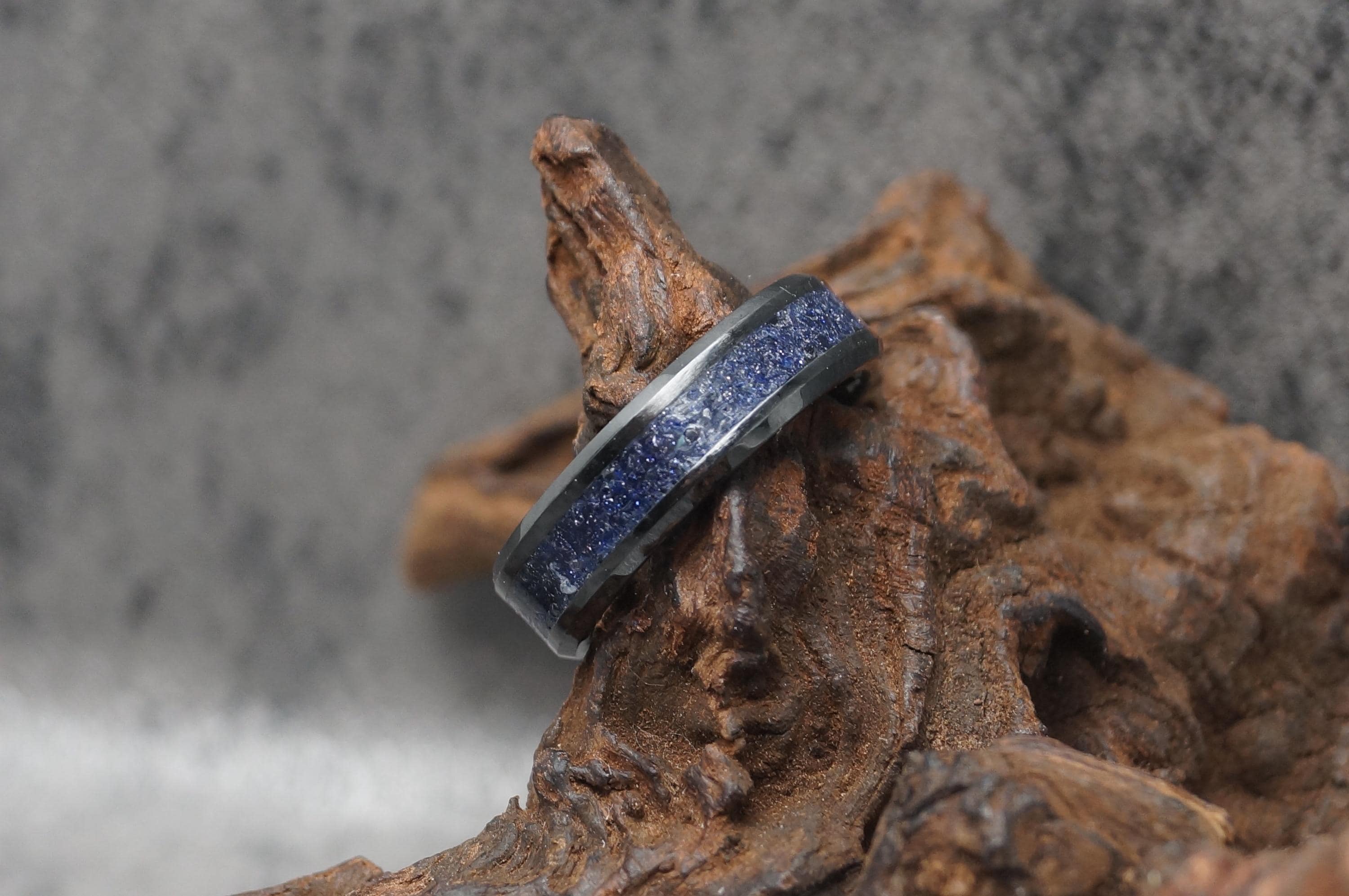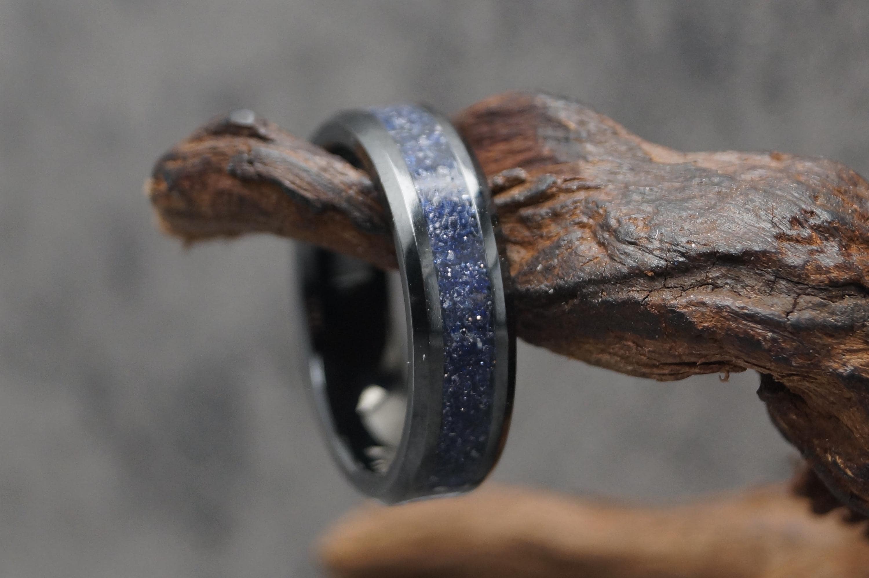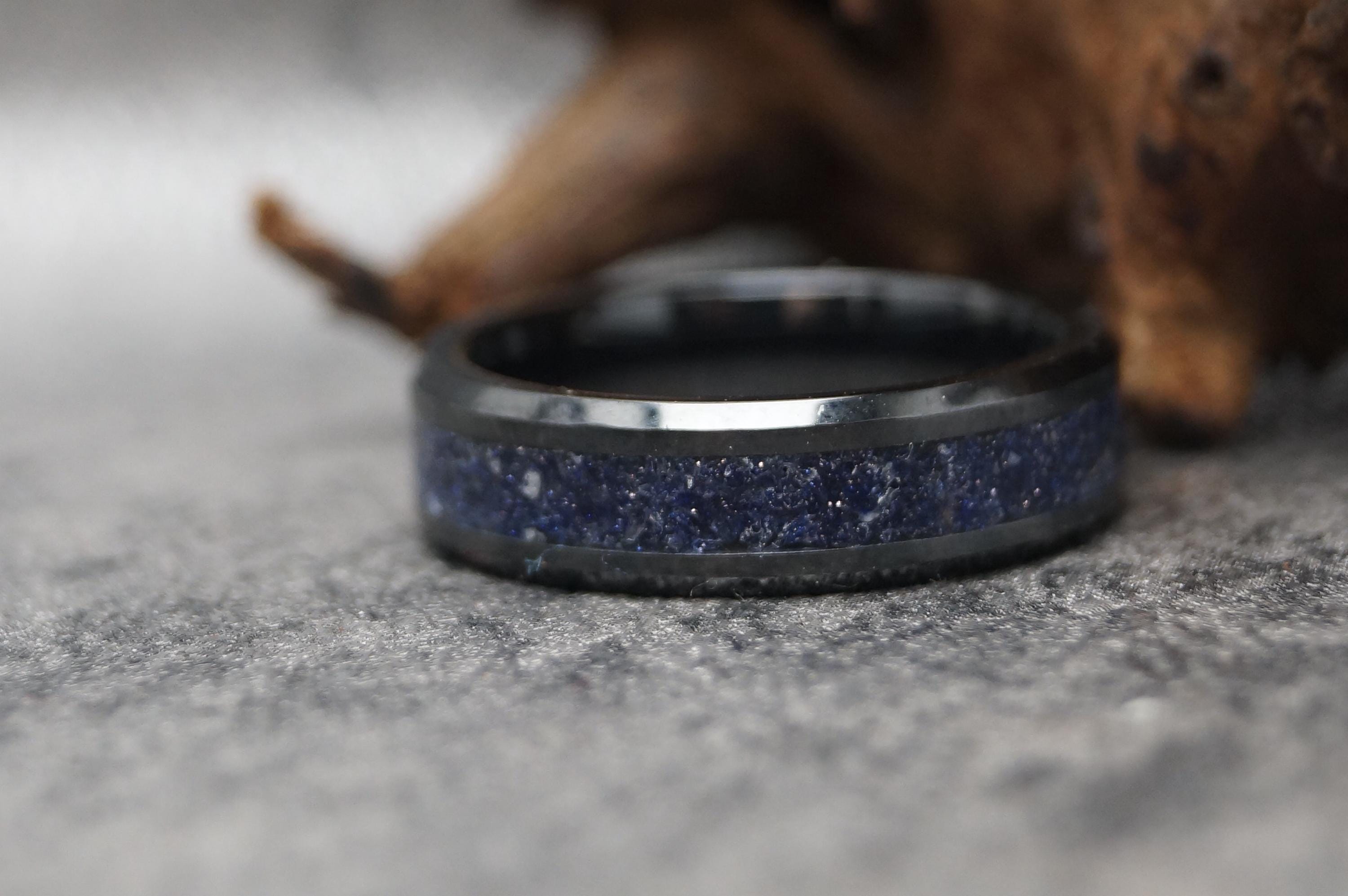 Dark Blue Goldstone Inlay Black Ceramic Wedding Band available 4 mm, 6 mm or 8 mm wide - Unique ring