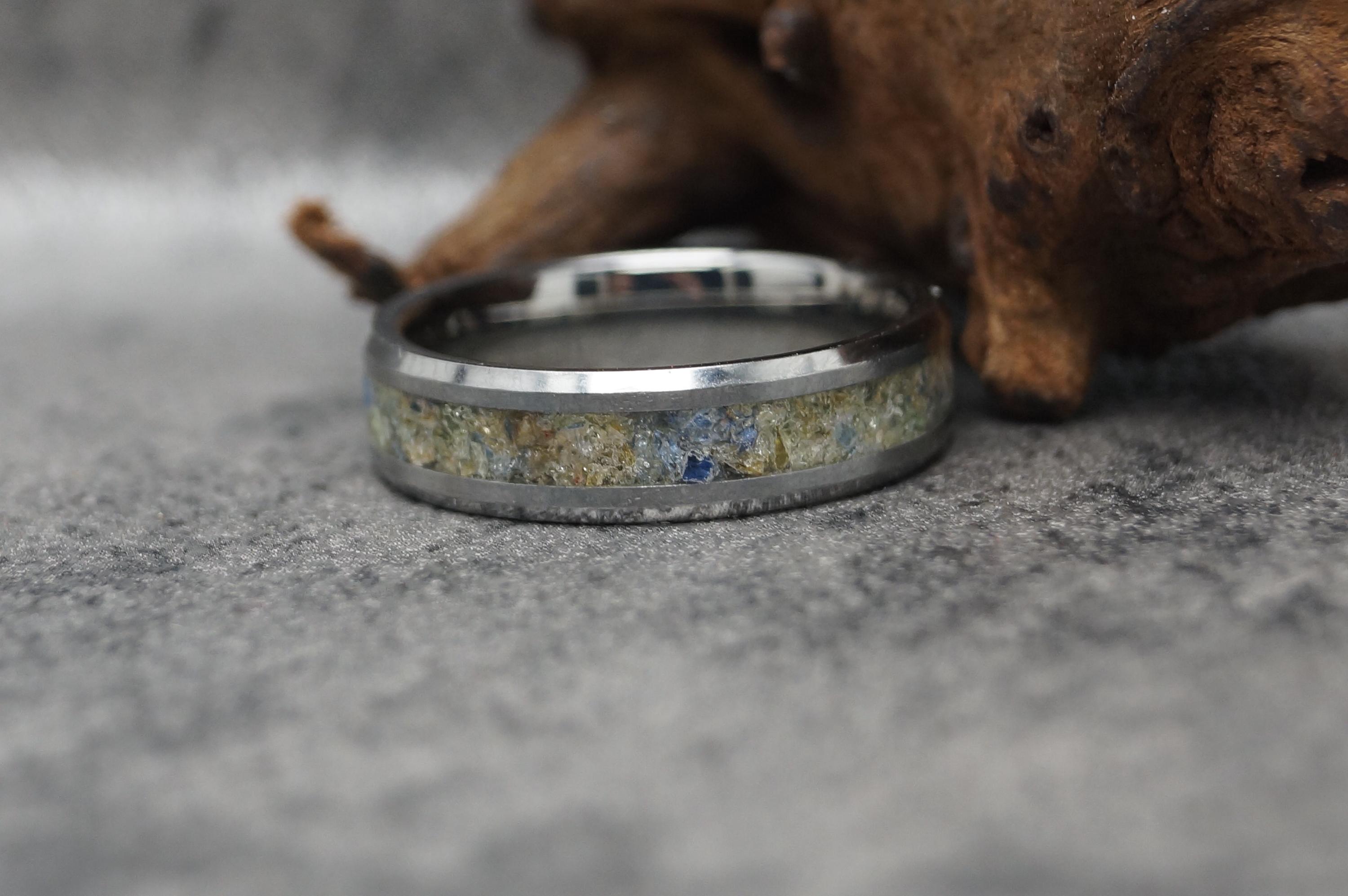 This genuine Black Ceramic ring is inlaid with 100% Sea Glass with a mixture of Blue, Green, Brown and Clear glass collected from the beach at Lyme Regis, Dorset, England.