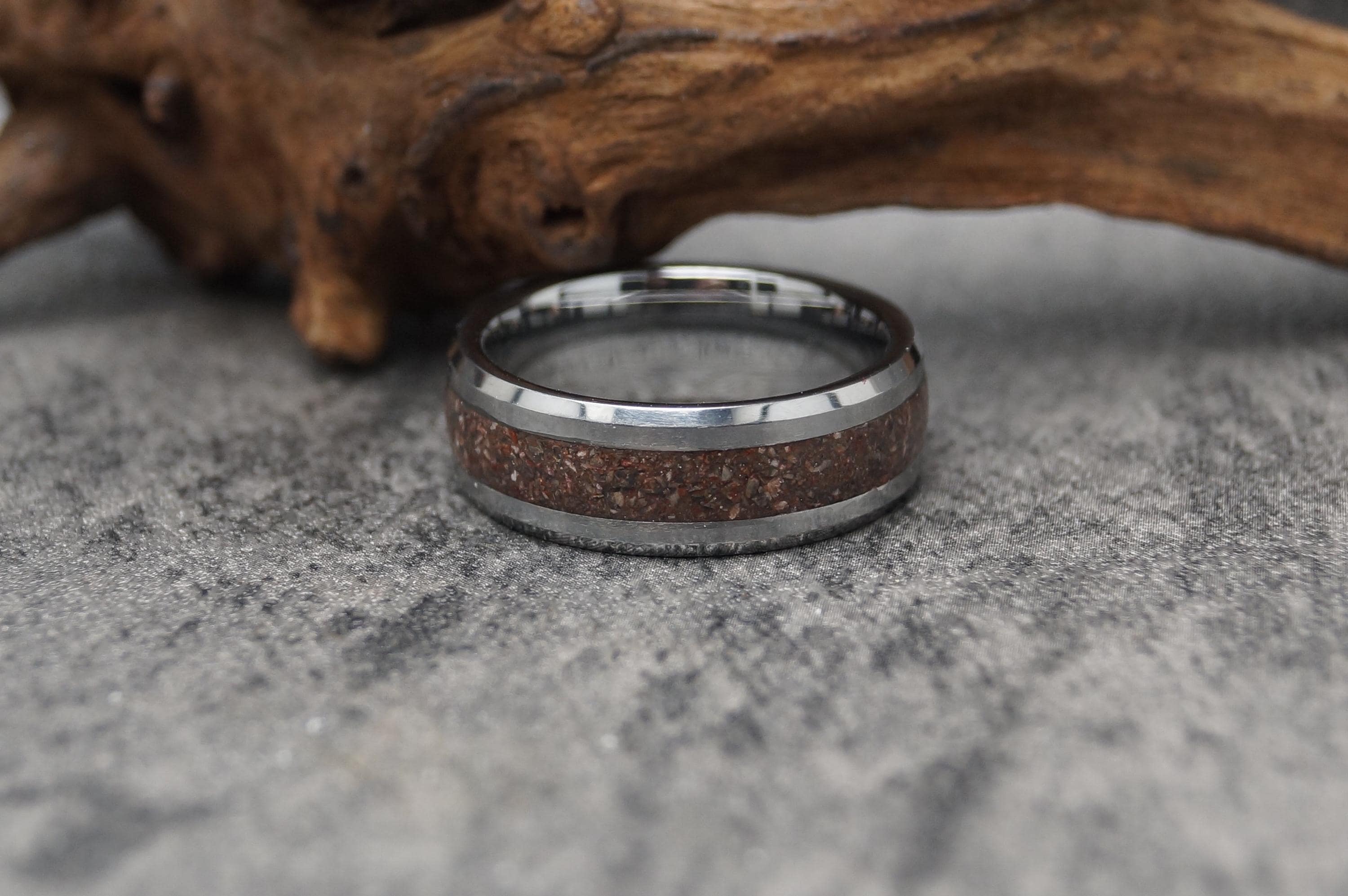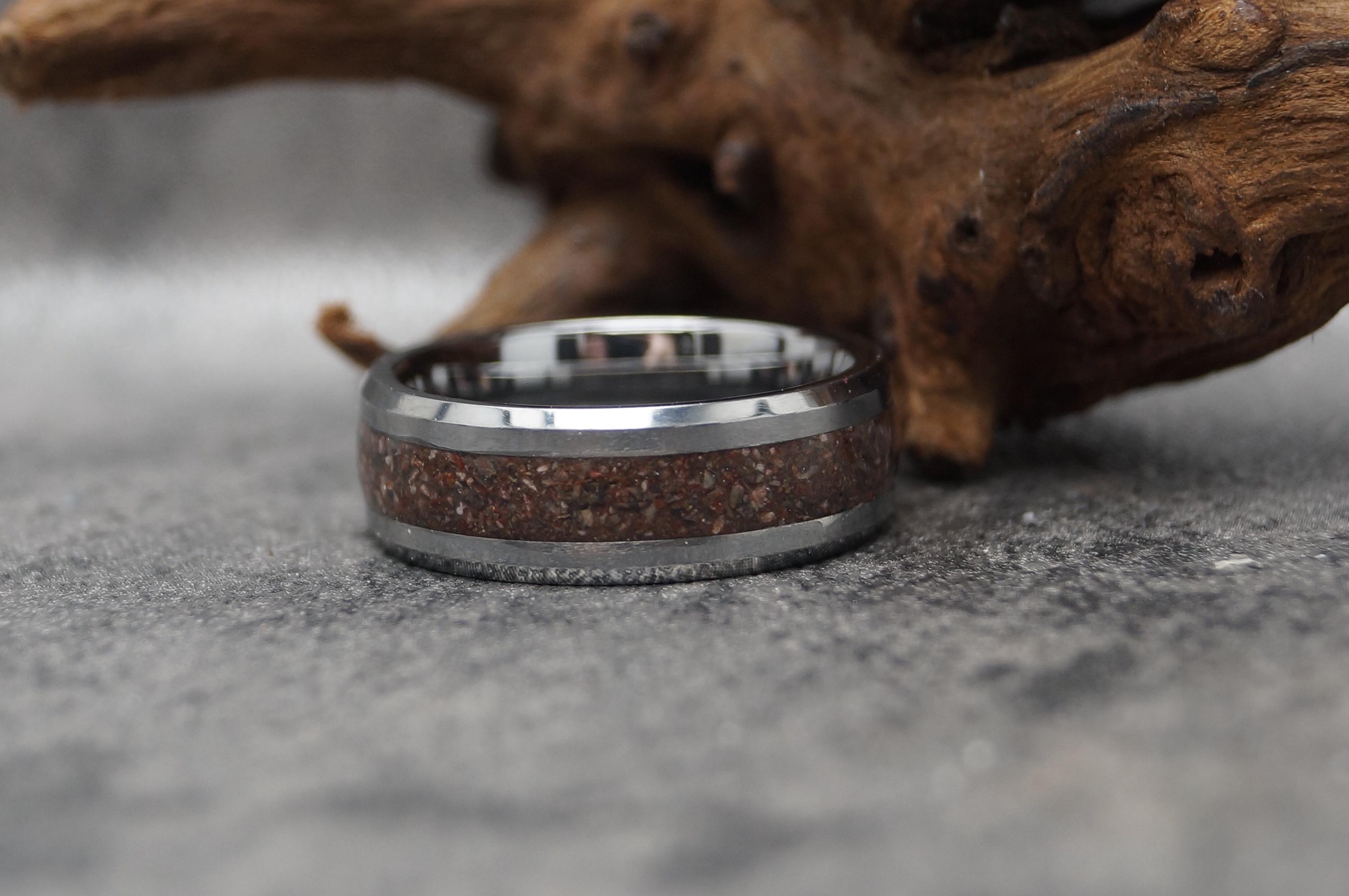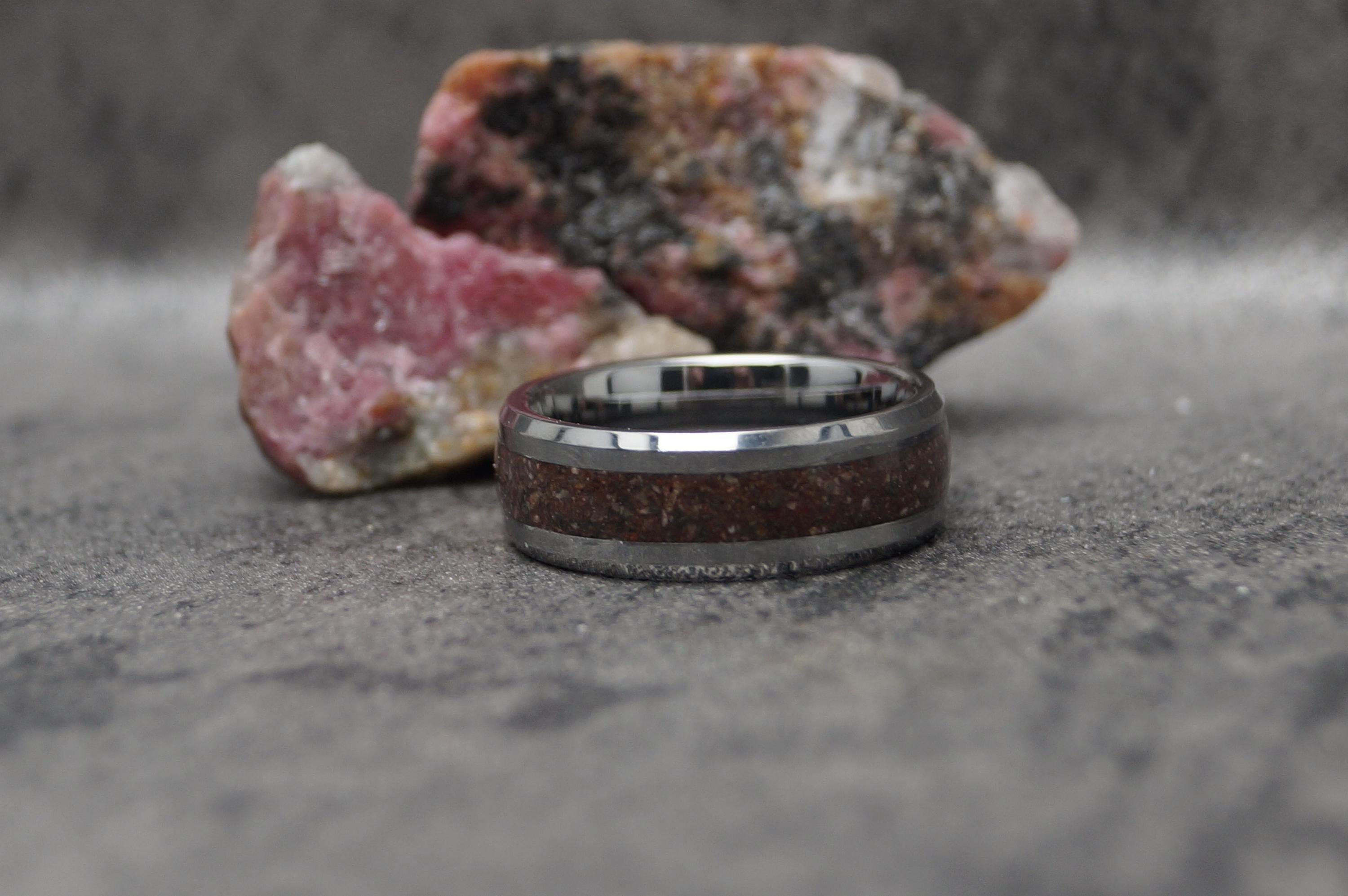 This genuine Tungsten Carbide ring inlaid with 100% Natural Rhodonite