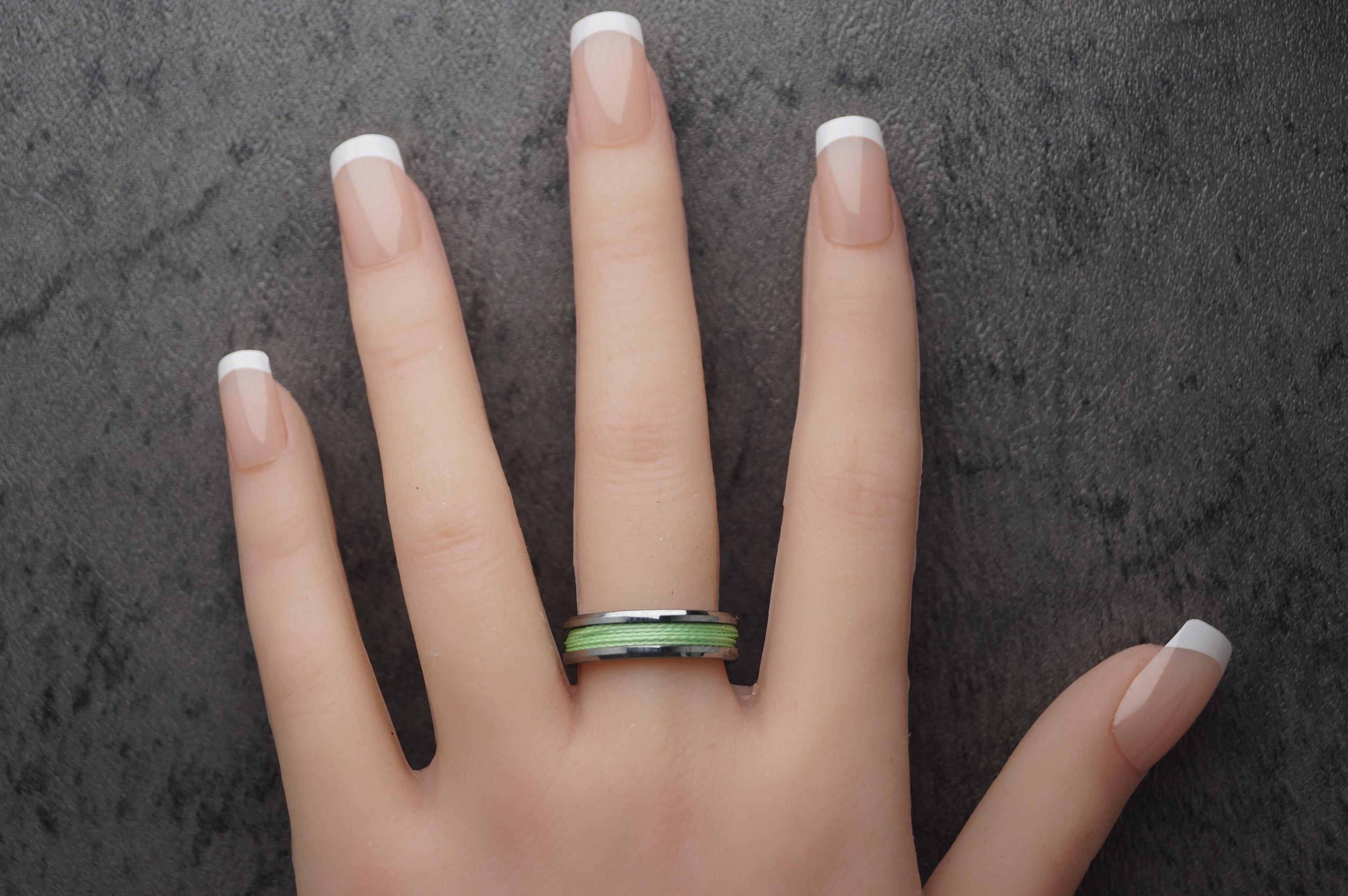 This genuine Tungsten Carbide ring is inlaid with genuine Fishing Line.