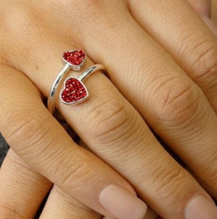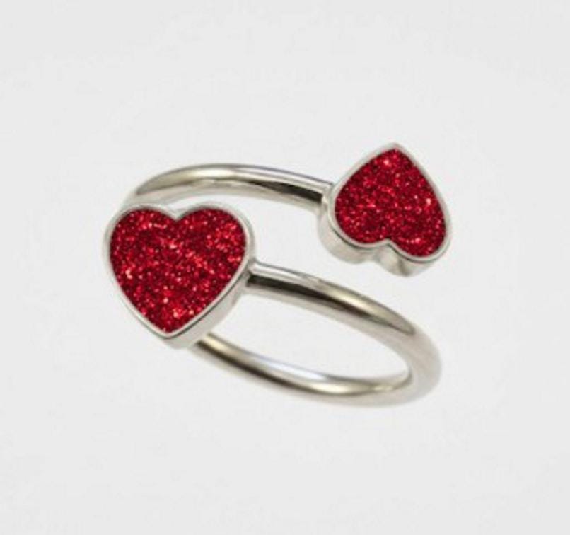 This is a genuine Hallmarked Sterling Silver Double Heart Adjustable Ring incorporating the ashes, hair or fur of a loved one or pet with Red Eco-Glitter.