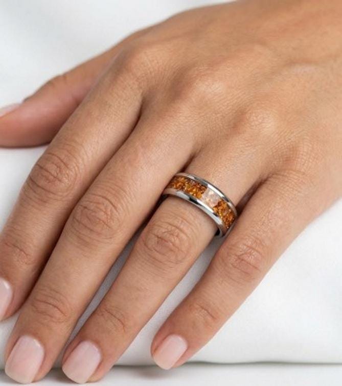 This genuine Tungsten Carbide ring is inlaid with Medium Orange Cubic Zirconia (CZ) Stones