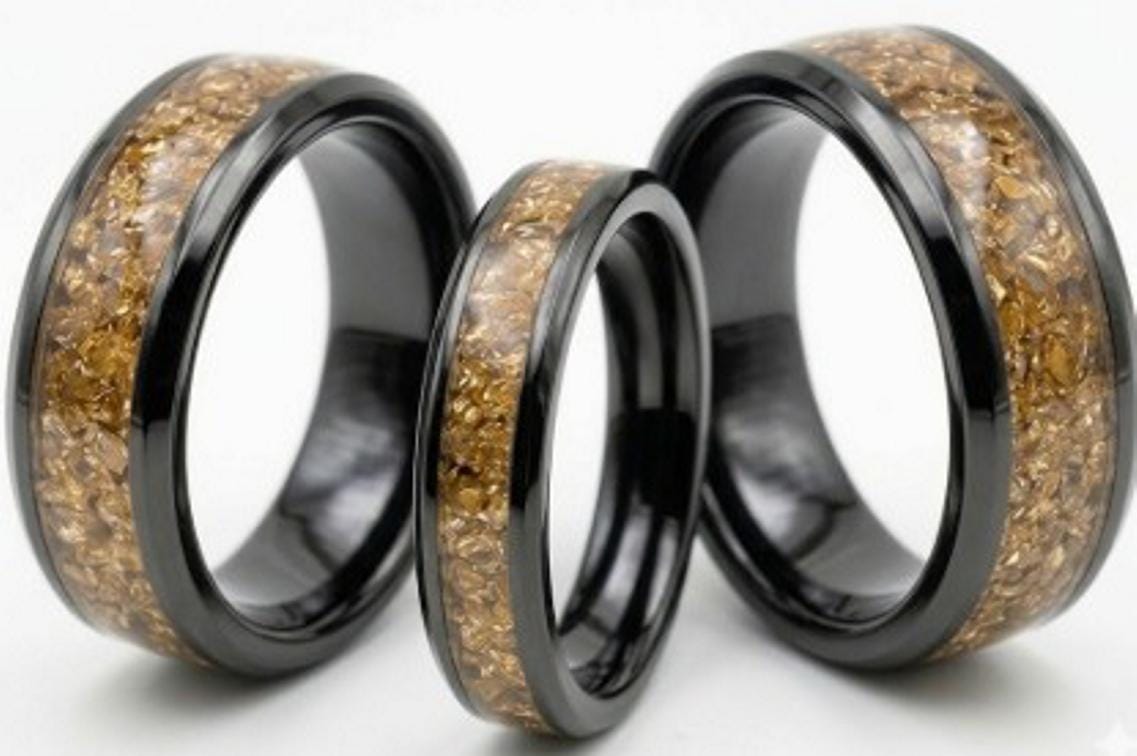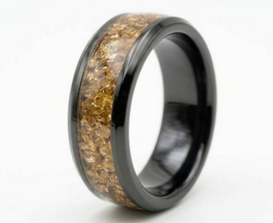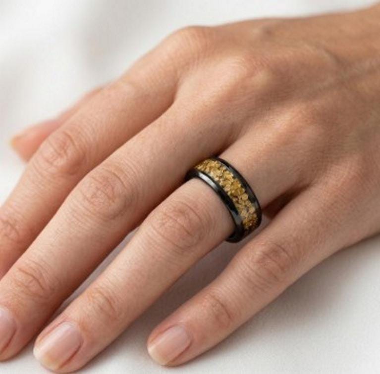 This genuine Black Ceramic ring is inlaid with Medium Champagne Cubic Zirconia (CZ) Stones