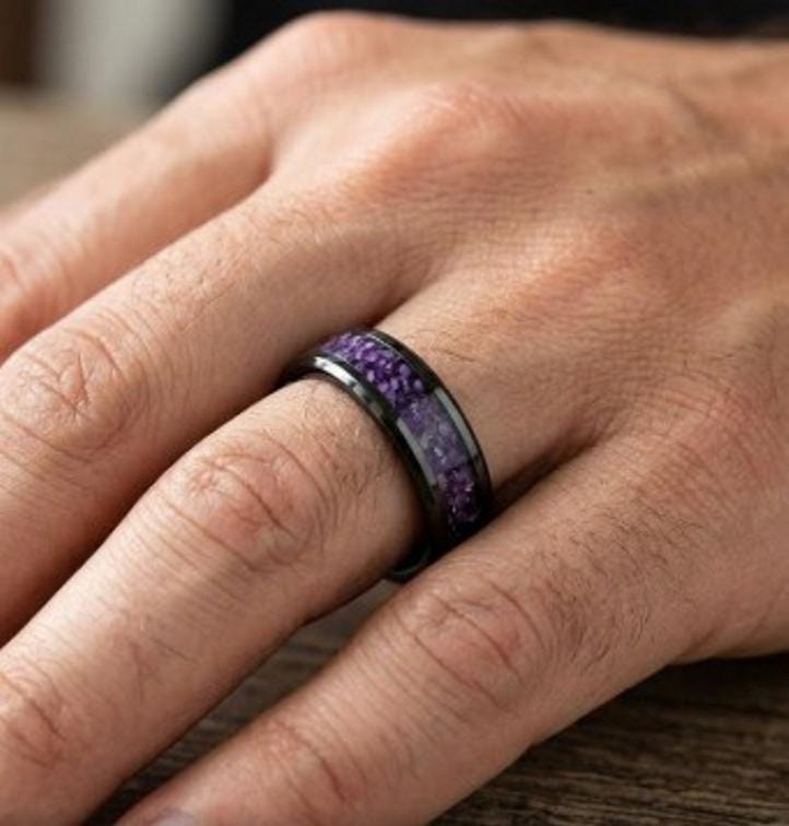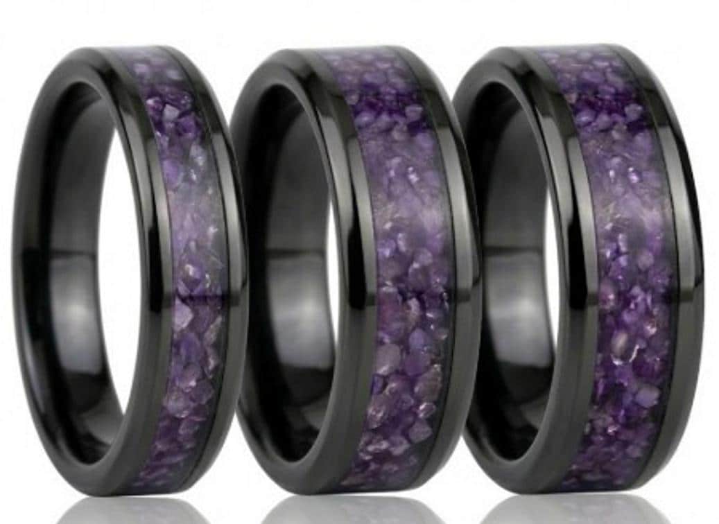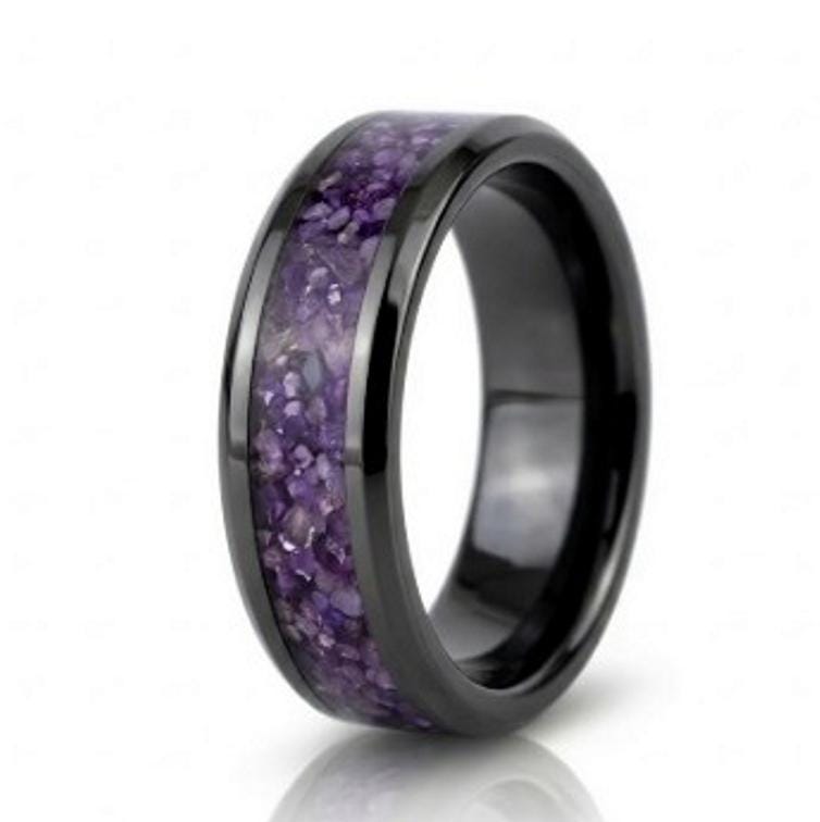 Medium Amethyst CZ Stones Inlaid Black Ceramic Ring - Available 4mm, 6mm or 8mm wide