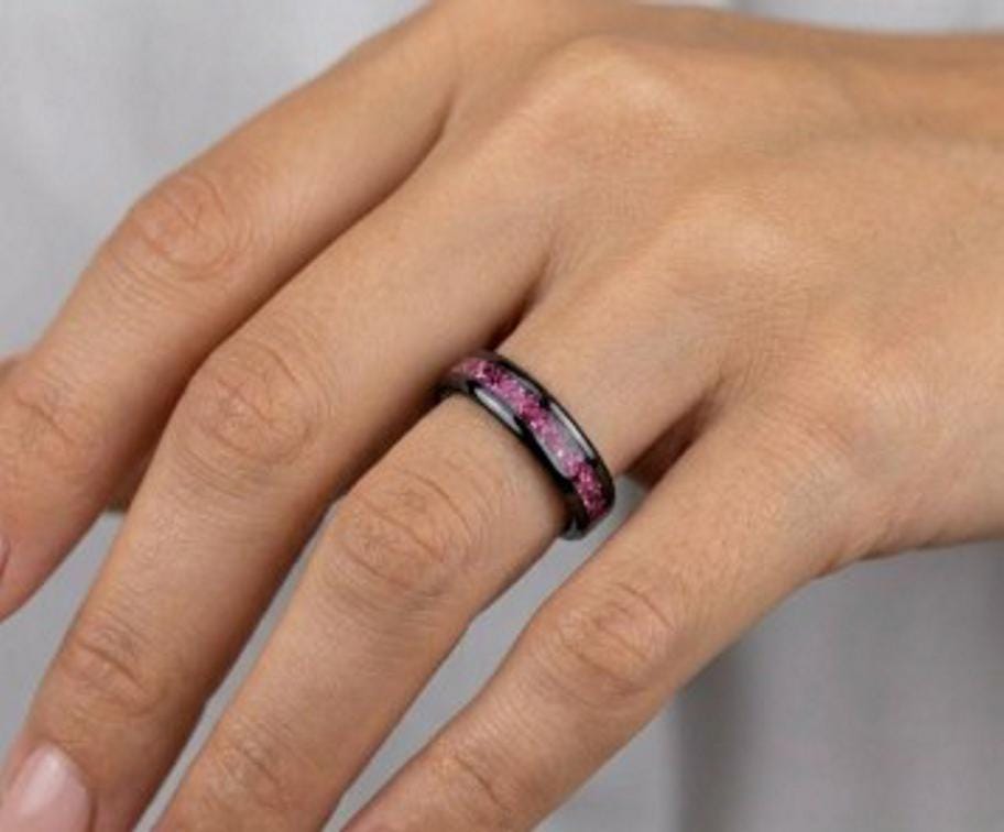 This genuine Black Ceramic ring is inlaid with Pink Cubic Zirconia (CZ) Stones