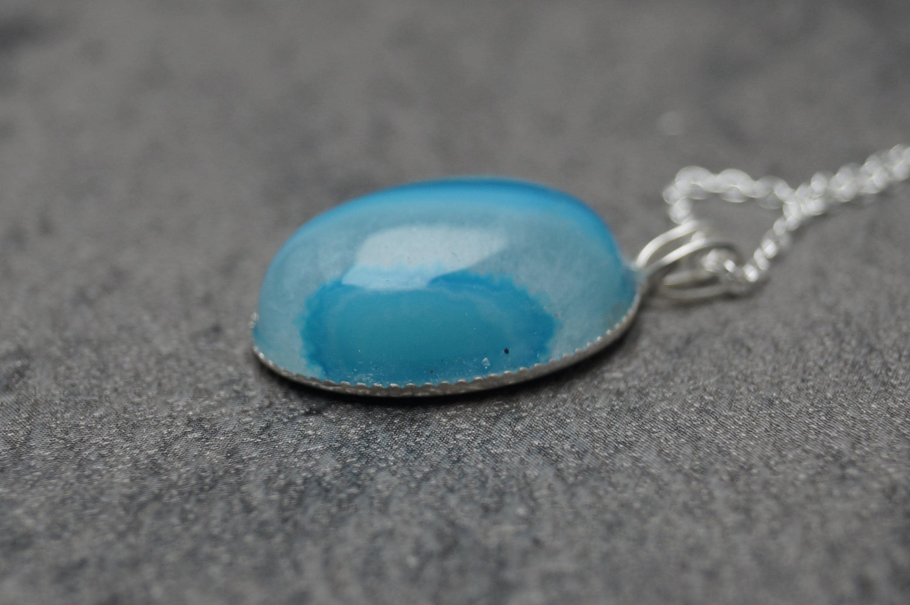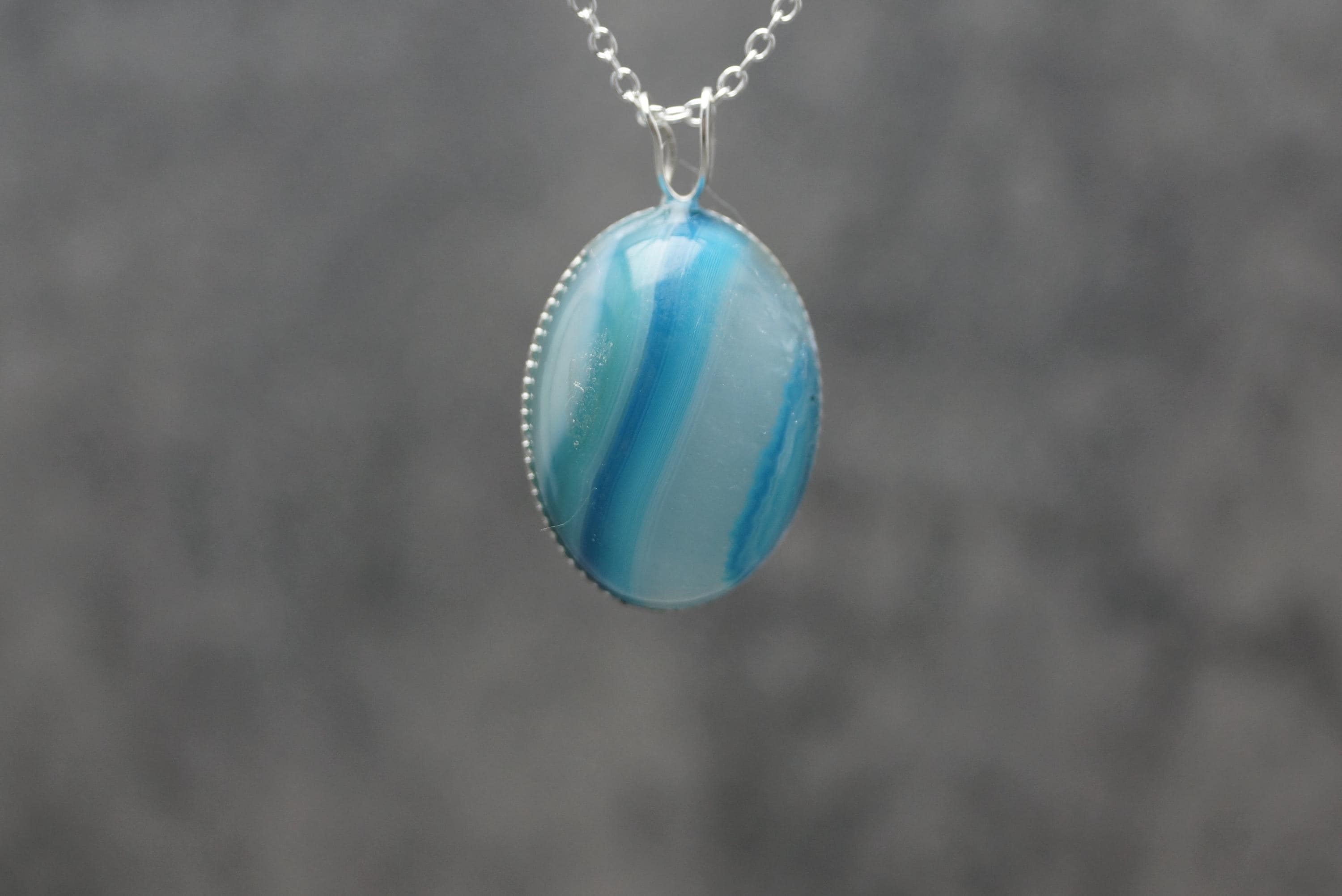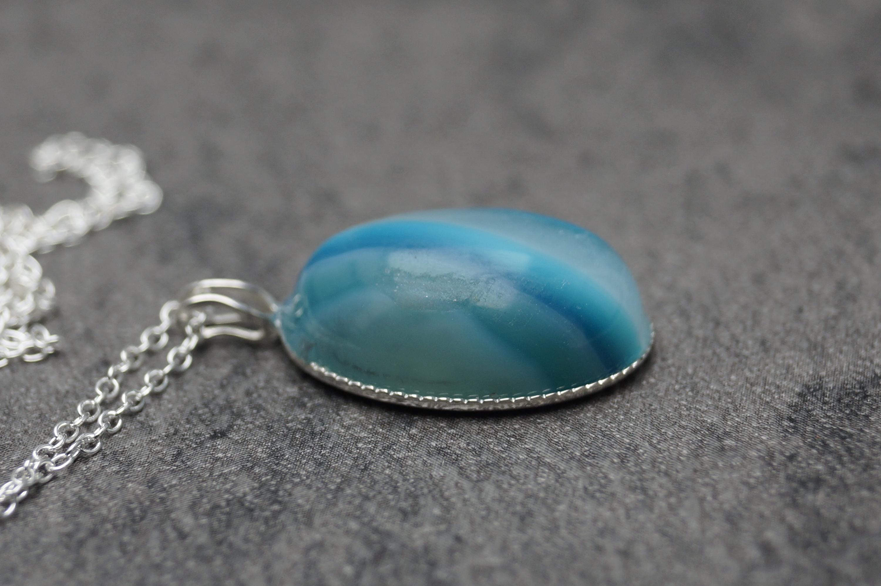 Highly polished Blue Agate gemstone pendant is a great example of this popular stone, perfect for those looking for a sterling silver Blue Agate pendant.