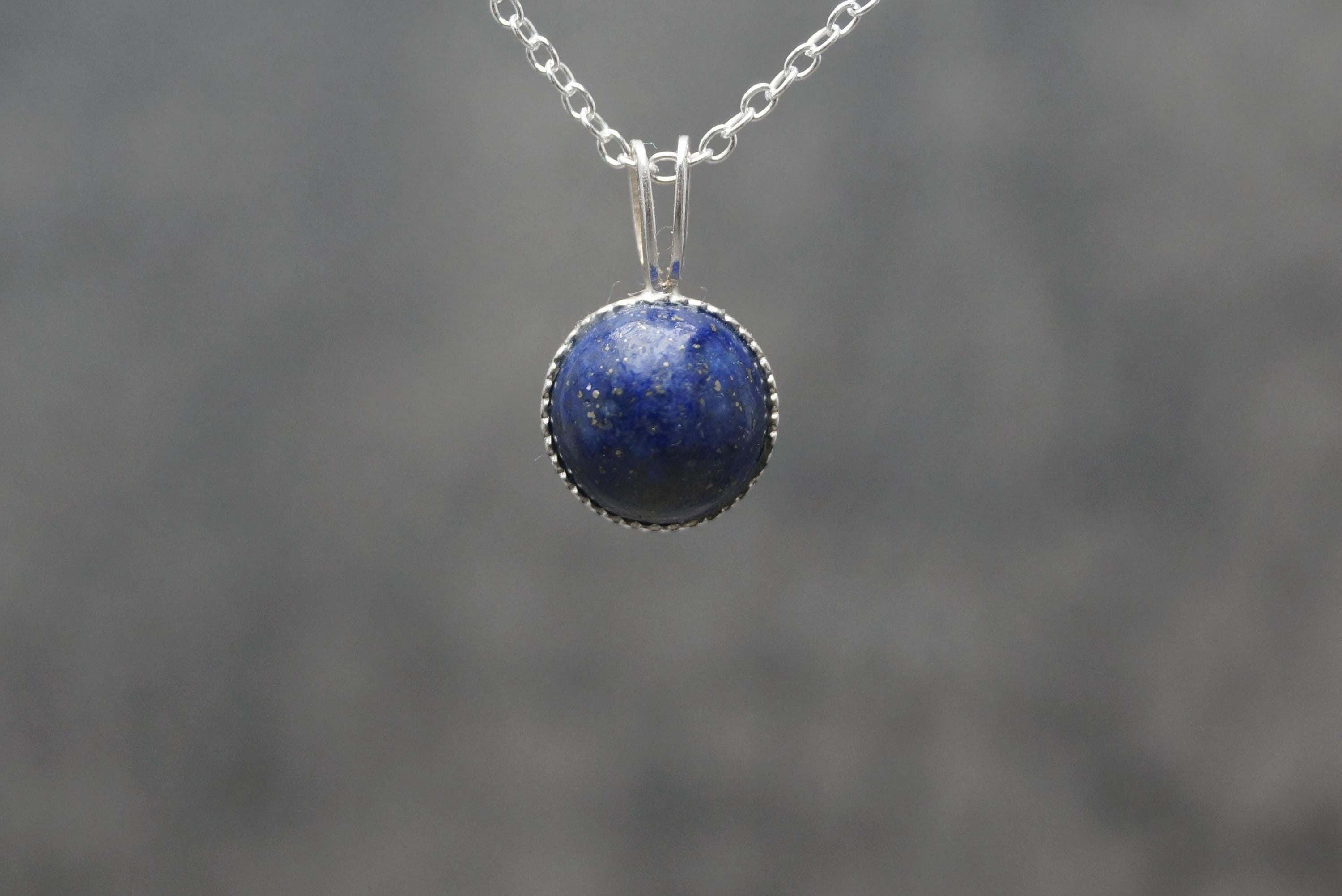 Sterling Silver Round Milled Edge Lapis Lazuli Pendant & 18" Chain, features a natural Lapis Lazuli gemstone.