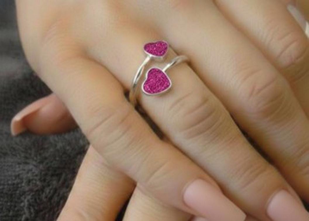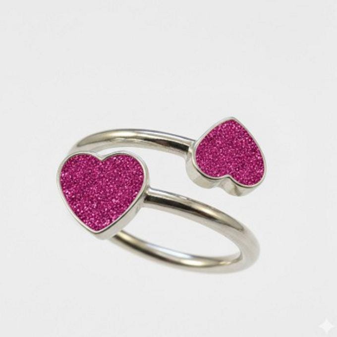 This is a genuine Hallmarked Sterling Silver Double Heart Adjustable Ring incorporating the ashes, hair or fur of a loved one or pet with Magenta Eco-Glitter.
