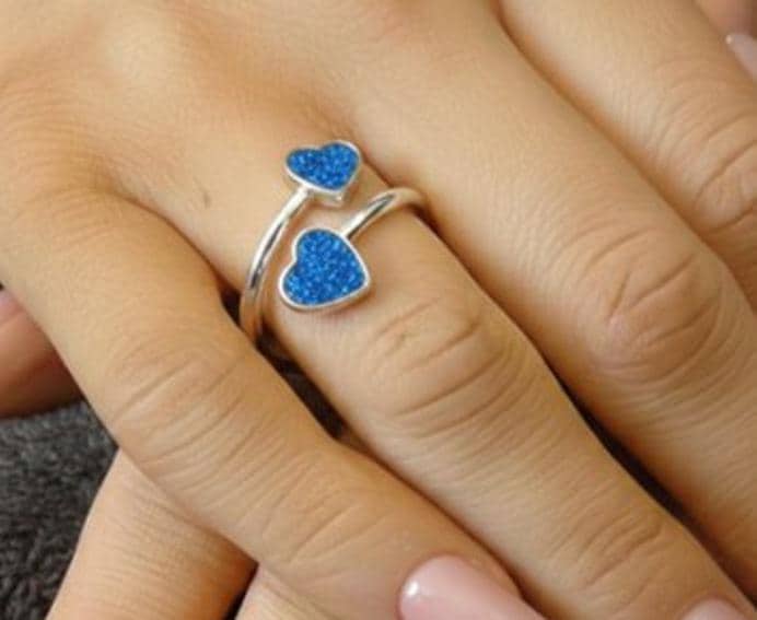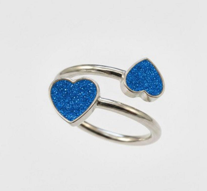 This is a genuine Hallmarked Sterling Silver Double Heart Adjustable Ring incorporating the ashes, hair or fur of a loved one or pet with Blue Eco-Glitter.
