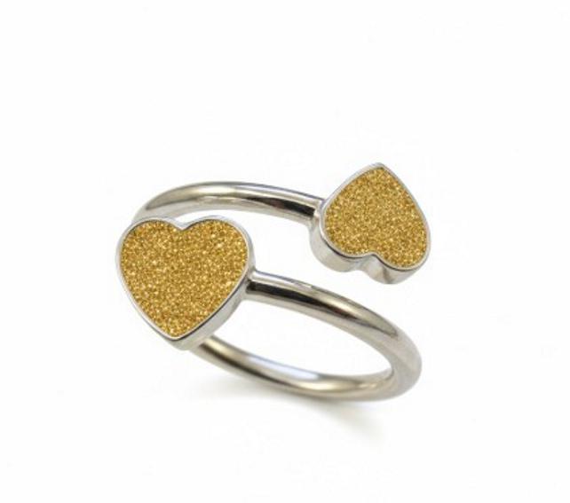 This is a genuine Hallmarked Sterling Silver Double Heart Adjustable Ring incorporating the ashes, hair or fur of a loved one or pet with Gold Eco-Glitter.