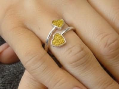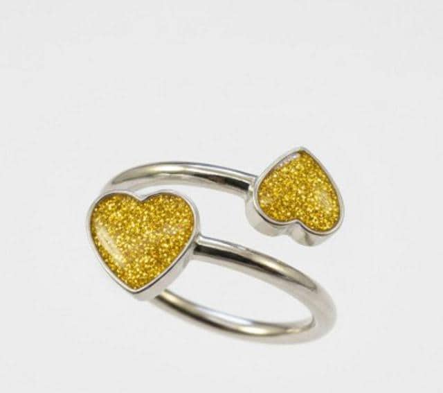 This is a genuine Hallmarked Sterling Silver Double Heart Adjustable Ring incorporating the ashes, hair or fur of a loved one or pet with Yellow Gold Eco-Glitter.