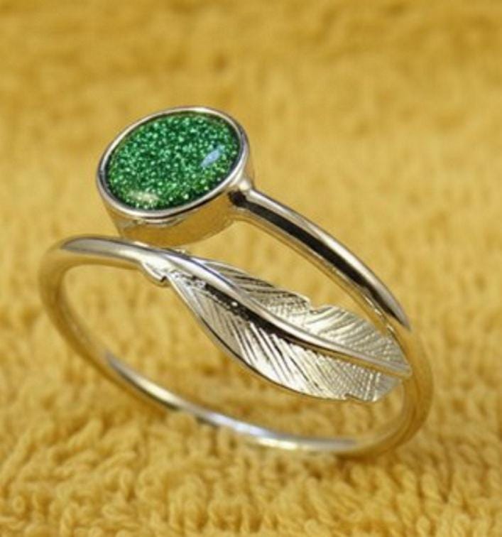 Personalised Sterling Silver Feather Adjustable Ring With a 6mm Setting including Ashes or Hair Inlaid with Green Eco-Glitter