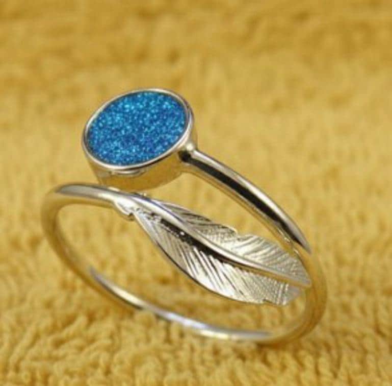 This is a genuine Hallmarked Sterling Silver Feather Adjustable Ring with a 6mm Setting incorporating the ashes, hair or fur of a loved one or pet with Aqua Eco-Glitter.