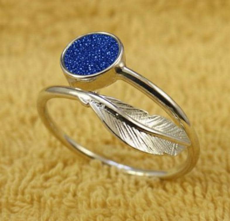 Personalised Sterling Silver Feather Adjustable Ring With a 6mm Setting including Ashes or Hair Inlaid with Blue Eco-Glitter