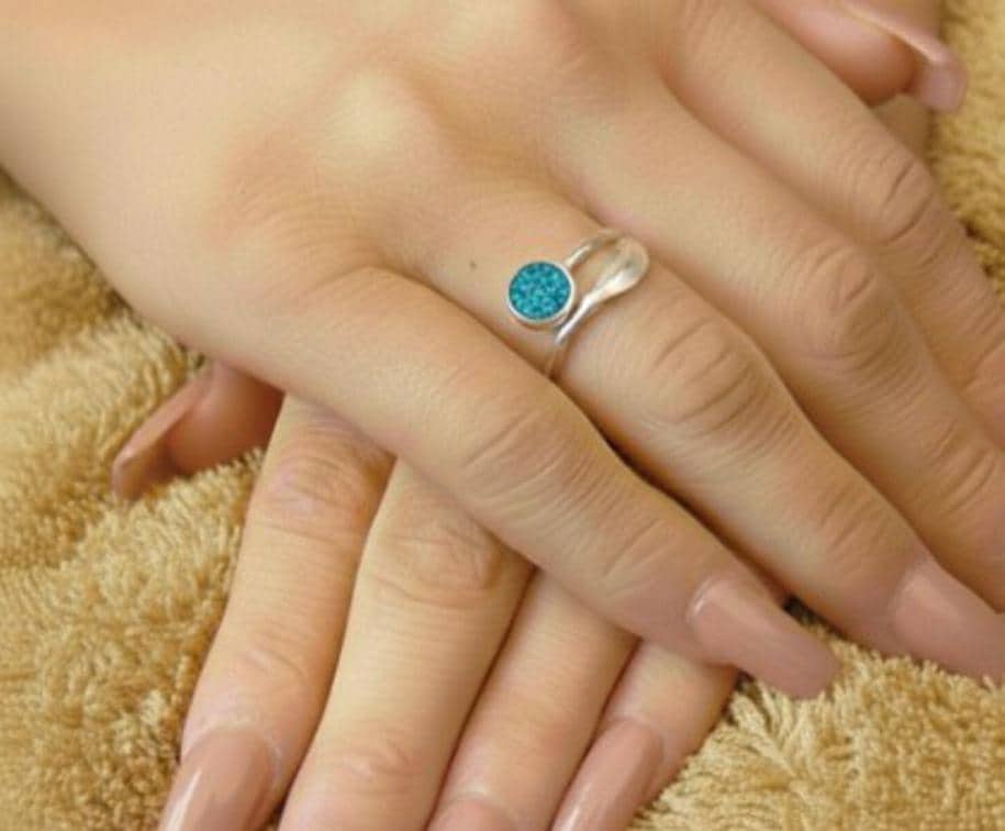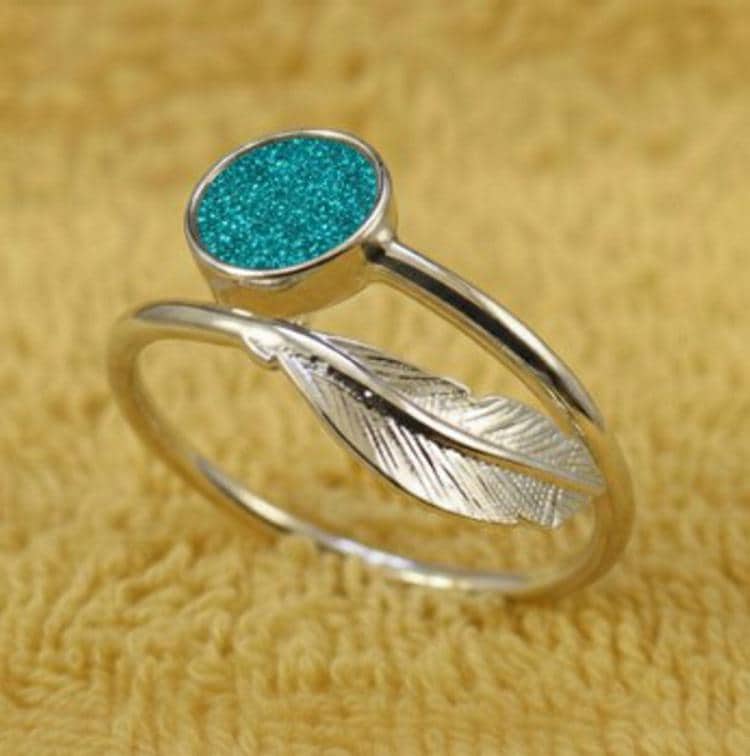 Personalised Sterling Silver Feather Adjustable Ring With a 6mm Setting including Ashes or Hair Inlaid with Blue-Green Eco-Glitter