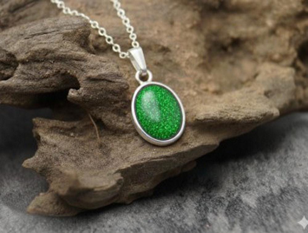 This is a genuine Hallmarked Sterling Silver oval pendant with a 10mm x 8mm Setting incorporating the ashes, hair or fur of a loved one or pet with Green Eco-Glitter.