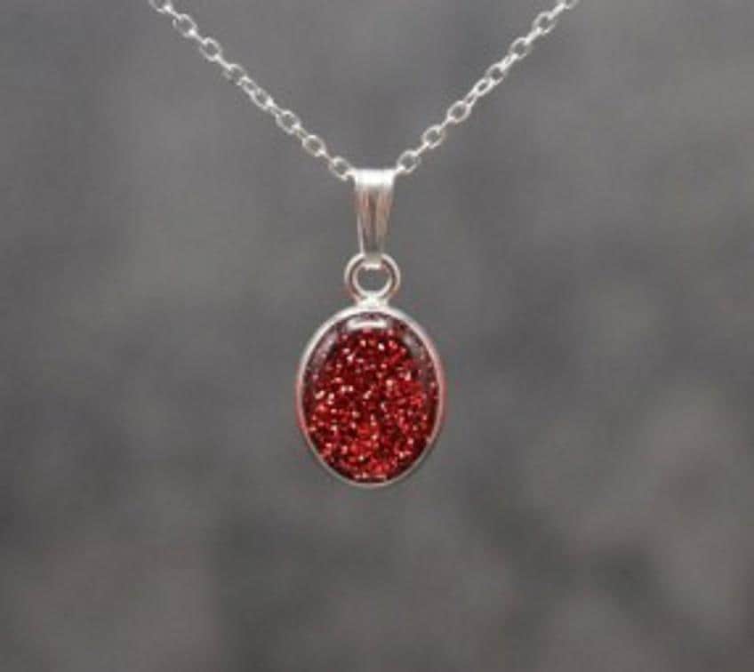 This is a genuine Hallmarked Sterling Silver oval pendant with a 10mm x 8mm Setting incorporating the ashes, hair or fur of a loved one or pet with Red Eco-Glitter.