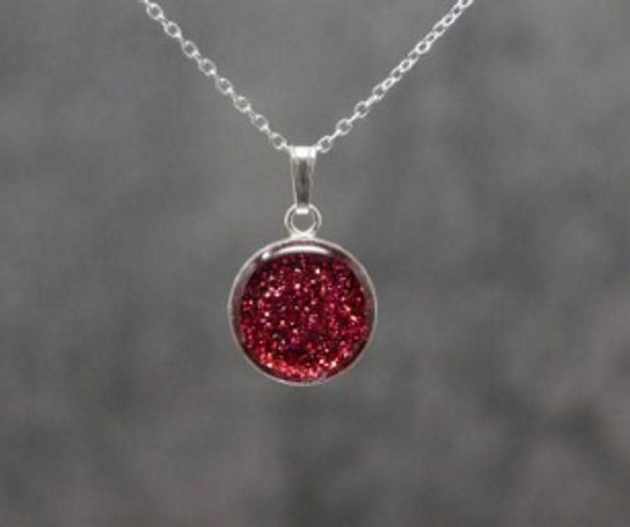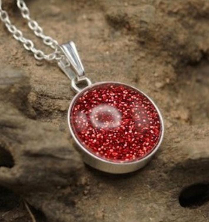 This is a genuine Hallmarked Sterling Silver round pendant with a 12mm Setting incorporating the ashes, hair or fur of a loved one or pet with Red Eco-Glitter.
