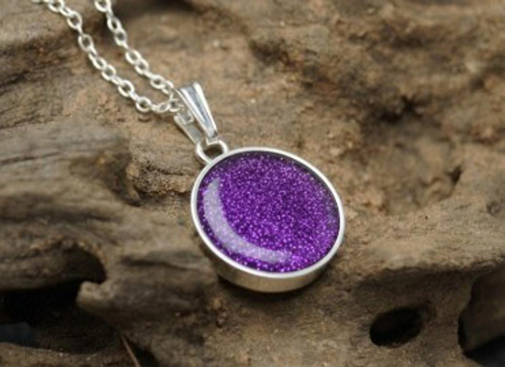 This is a genuine Hallmarked Sterling Silver round pendant with a 12mm Setting incorporating the ashes, hair or fur of a loved one or pet with Purple Eco-Glitter.