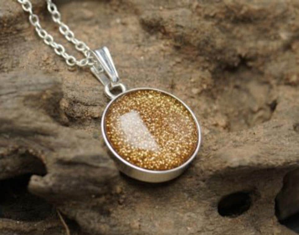 This is a genuine Hallmarked Sterling Silver round pendant with a 12mm Setting incorporating the ashes, hair or fur of a loved one or pet with Gold Eco-Glitter.