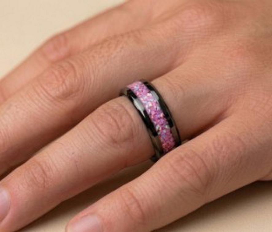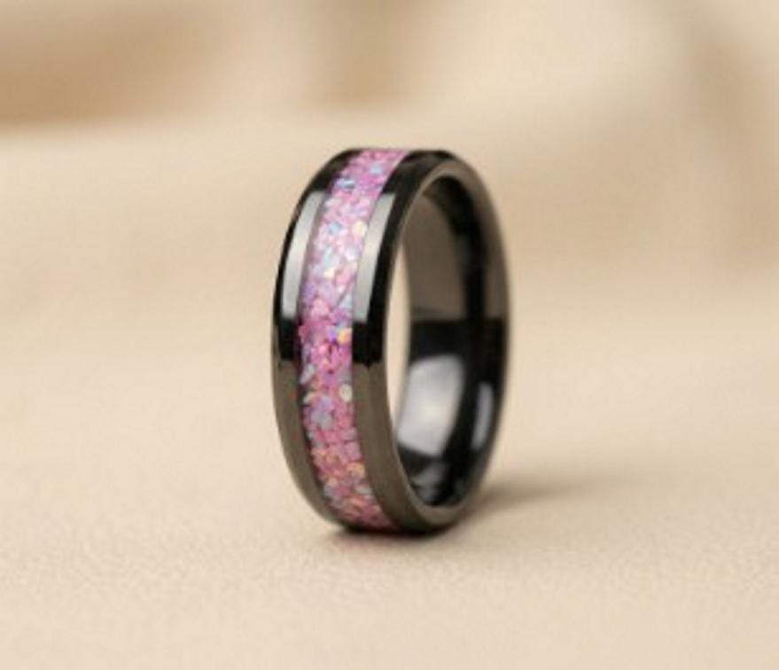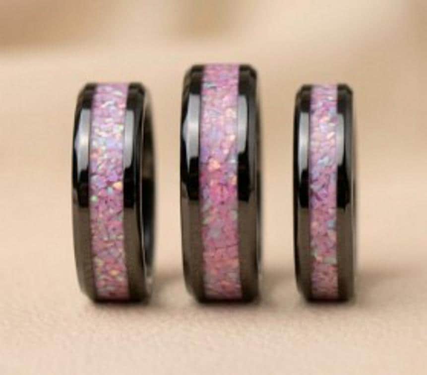 Rose Pink Opal Black Ceramic Wedding Band - Ring for men and women - Unique Ring