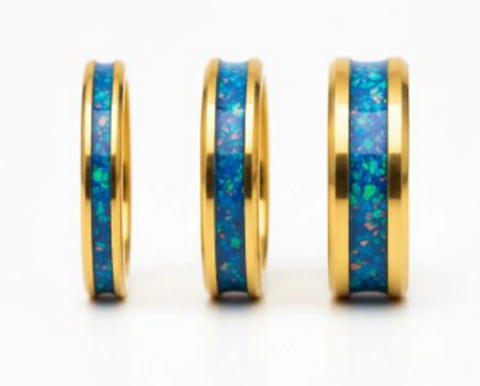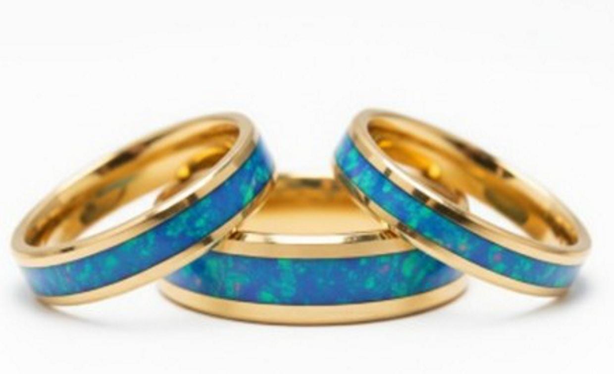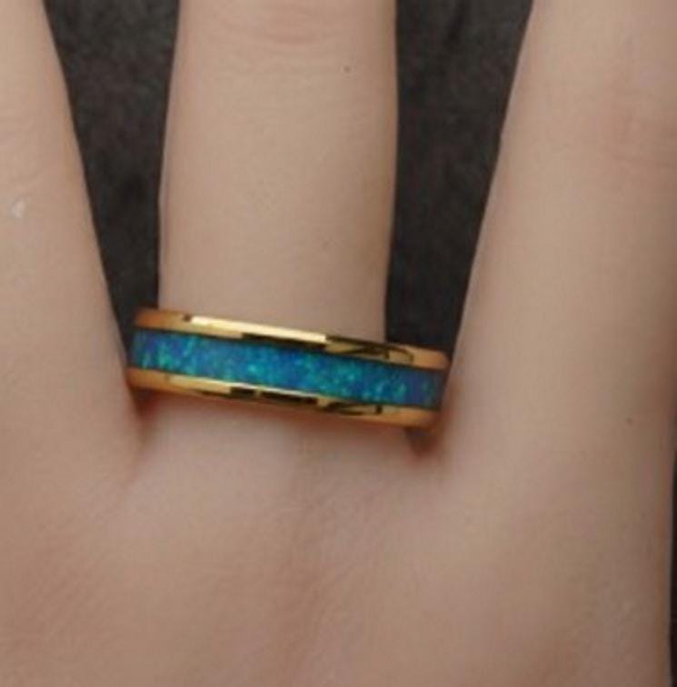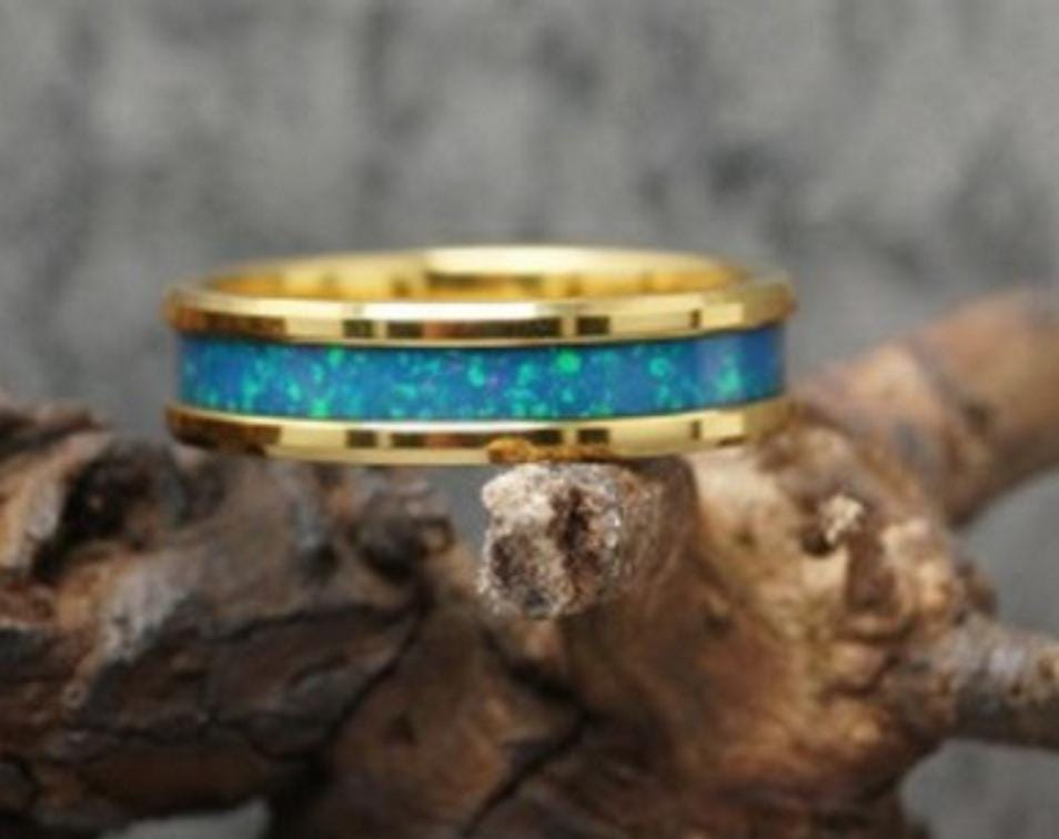 Multi-Teal Opal Gold Plated Tungsten Wedding Band - available 4 mm, 6 mm or 8 mm wide ring - Tungsten Inlaid Ring - Great Gift Idea