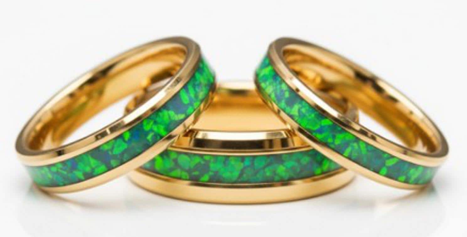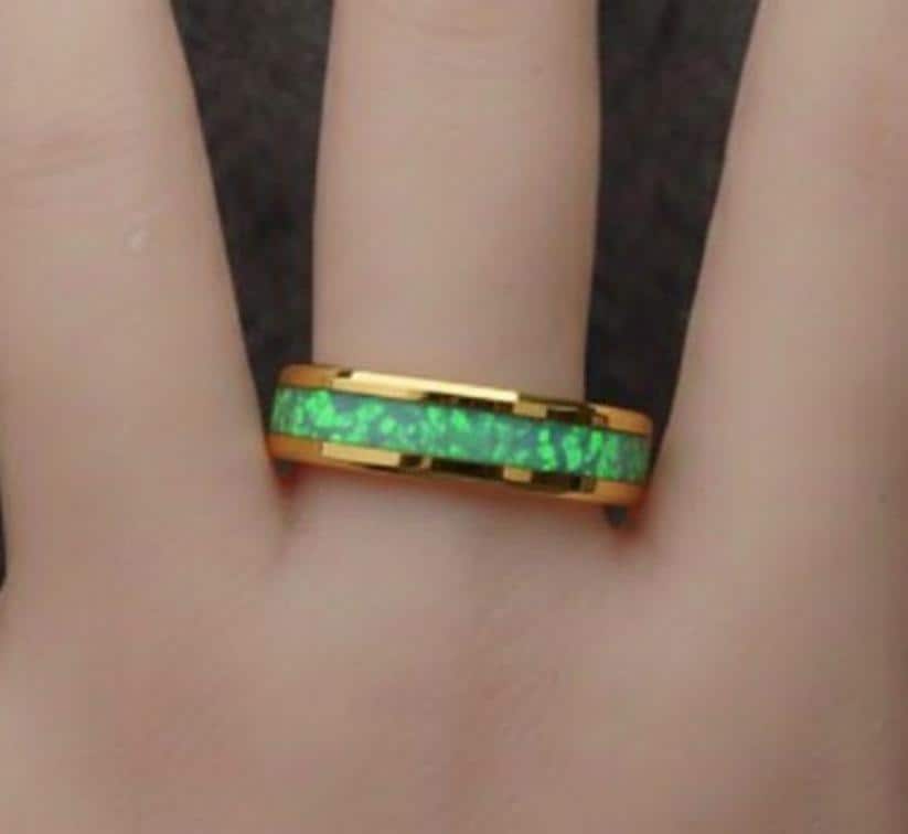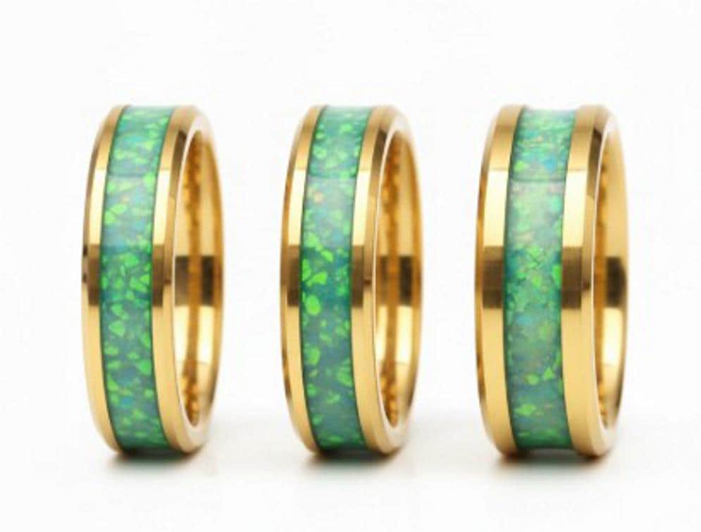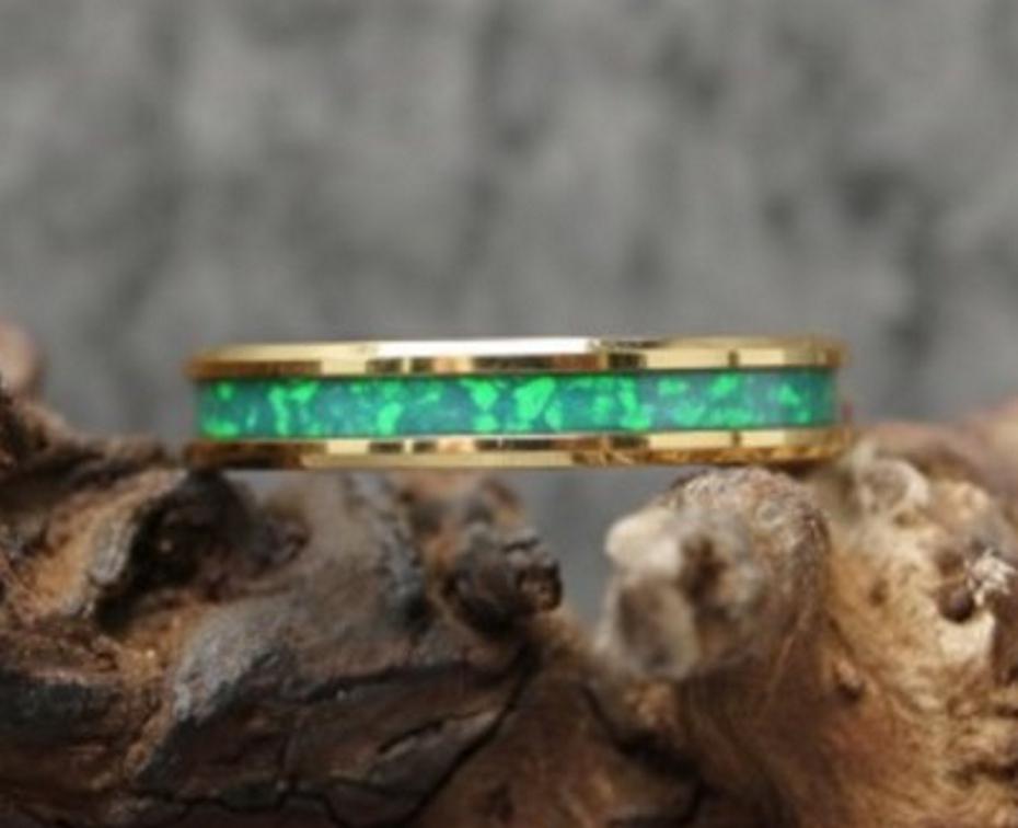 Light Green Opal Gold Plated Tungsten Wedding Band or Great Gift Idea, Unique Ring