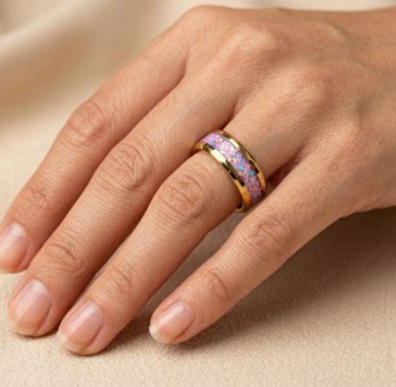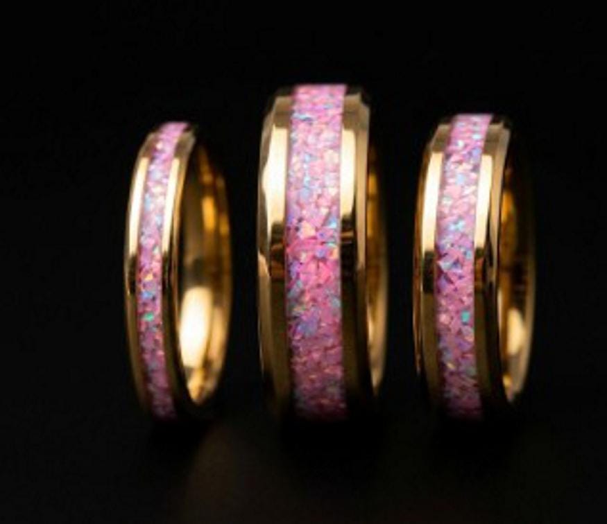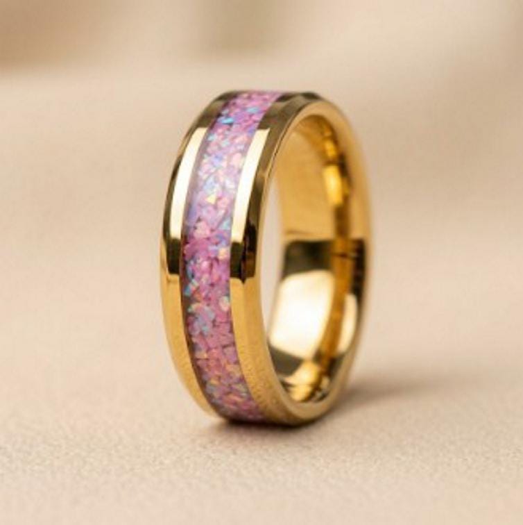 Rose Pink Opal Gold Plated Tungsten Ring - Unique Wedding Band or Gift Idea.