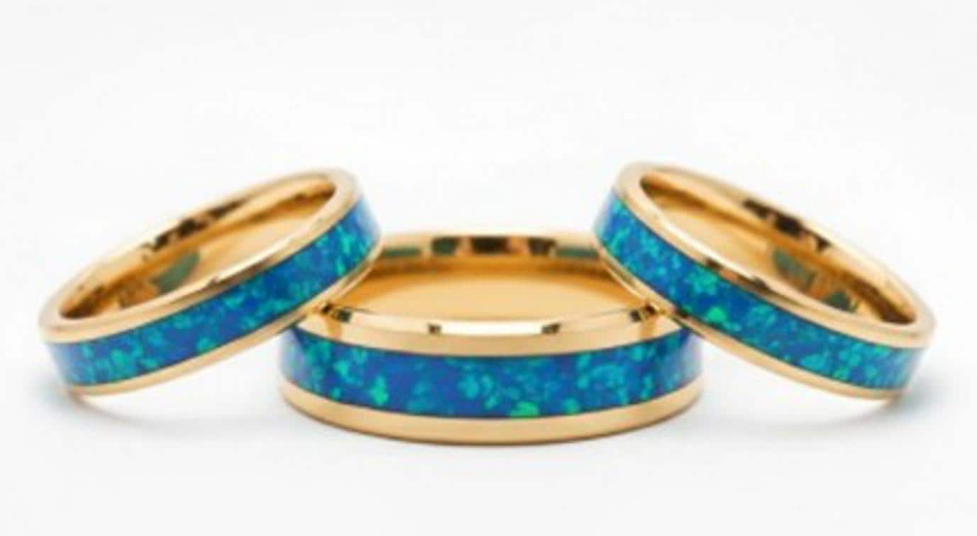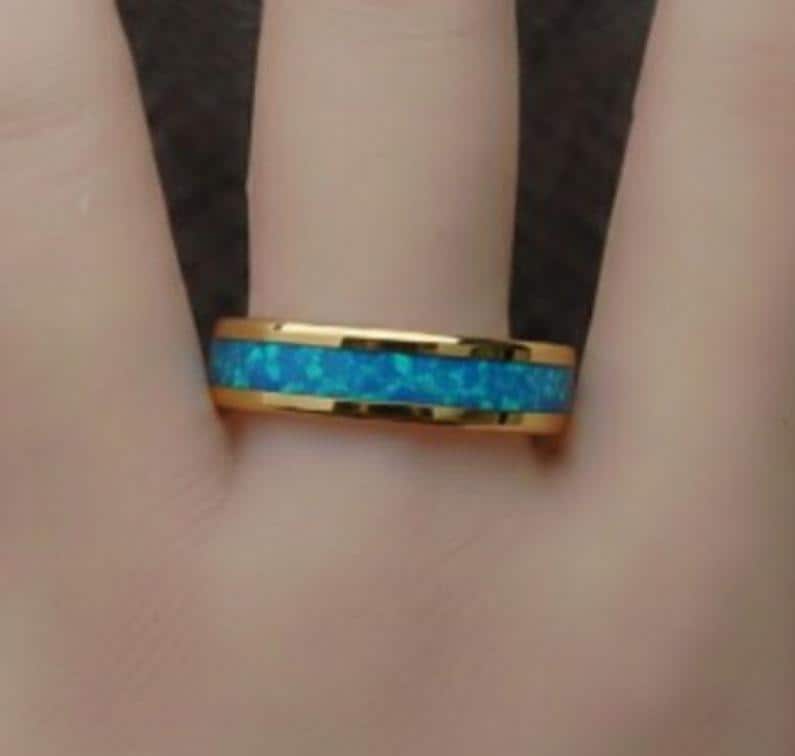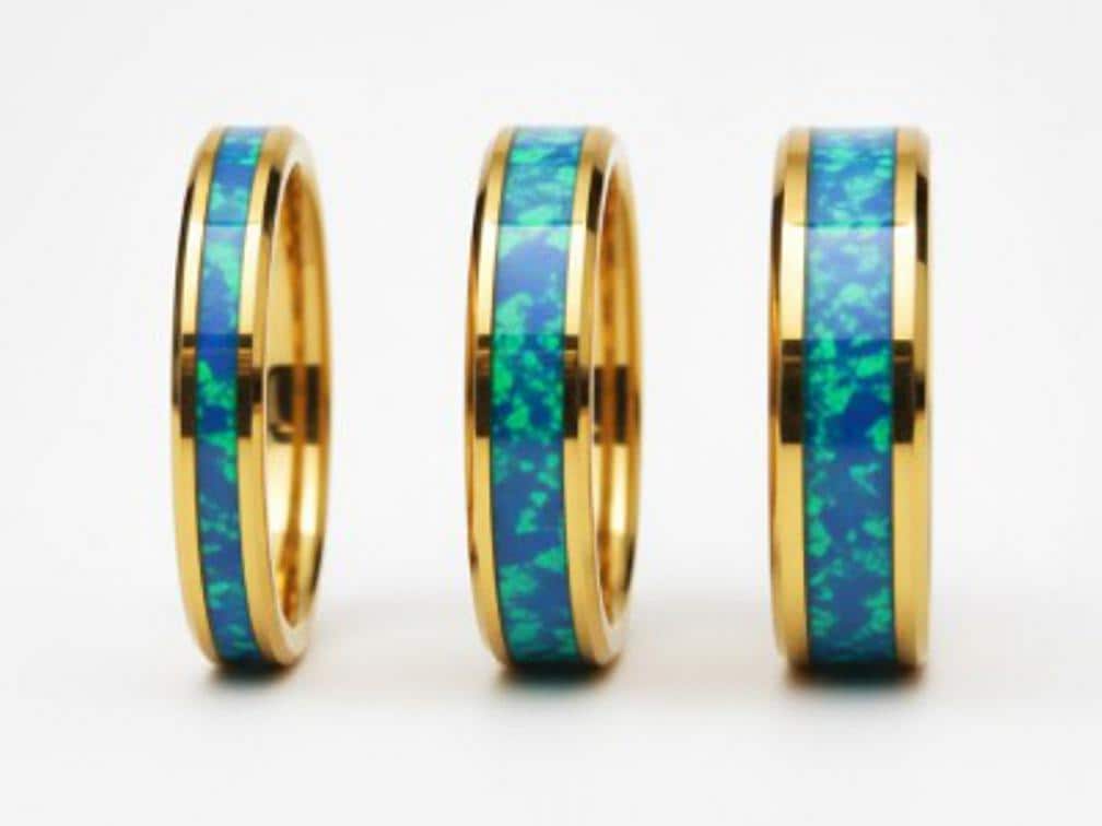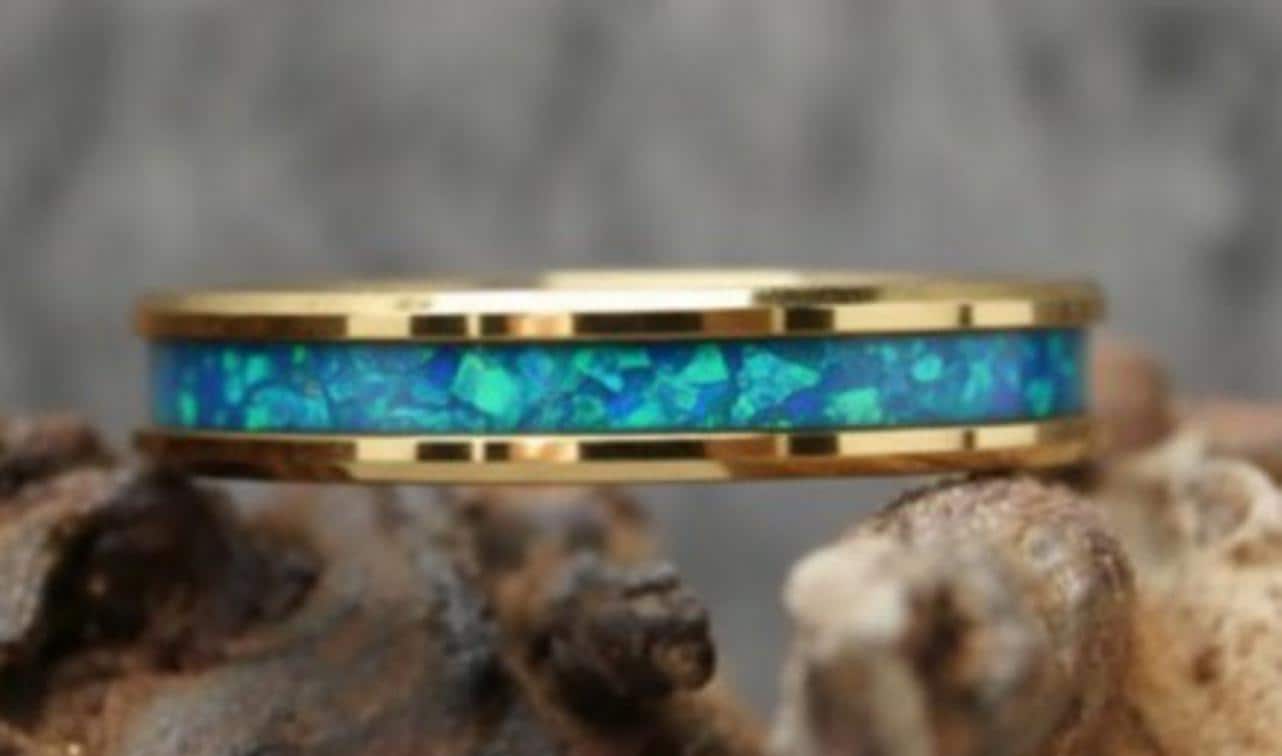 Aqua Opal Gold Plated Tungsten Ring - Unique Opal Band for Men or Women