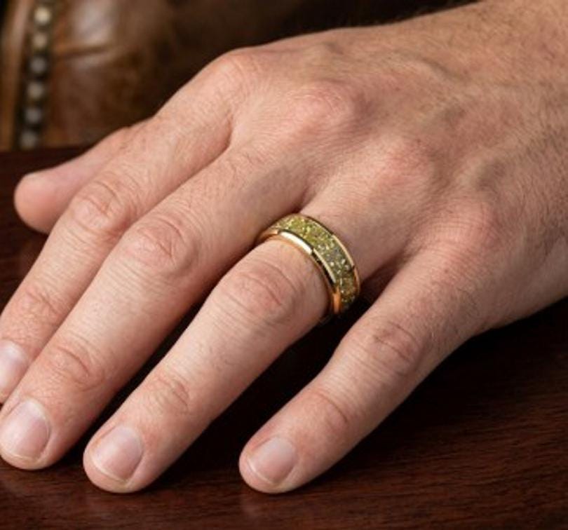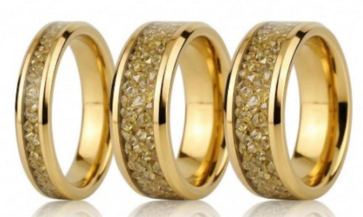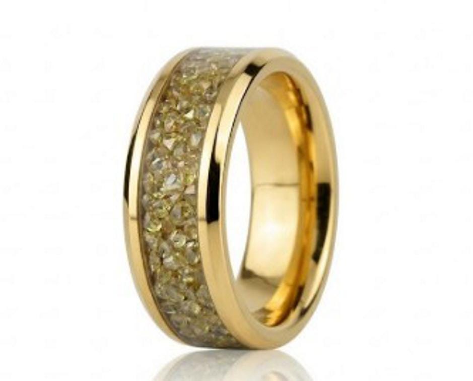 This genuine Gold Plated Tungsten Carbide ring is inlaid with Golden Cubic Zirconia (CZ) Stones.
