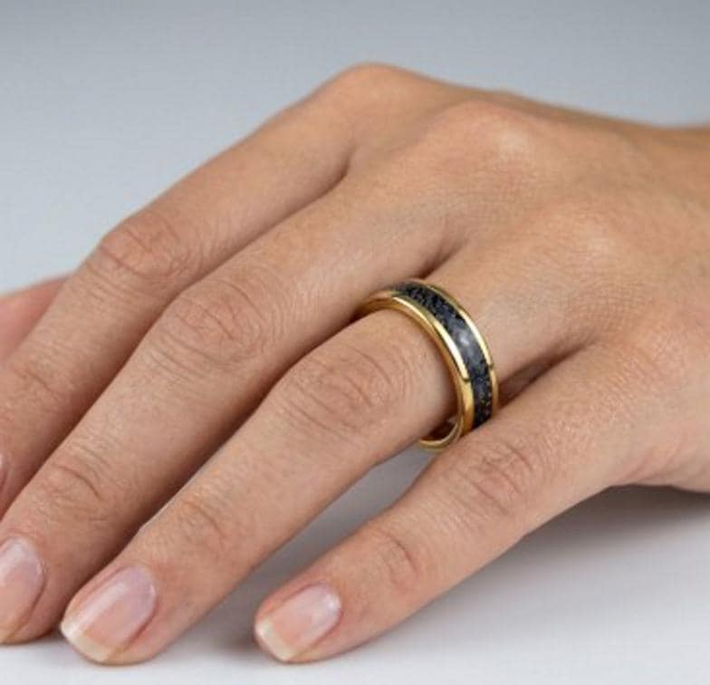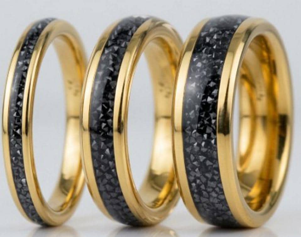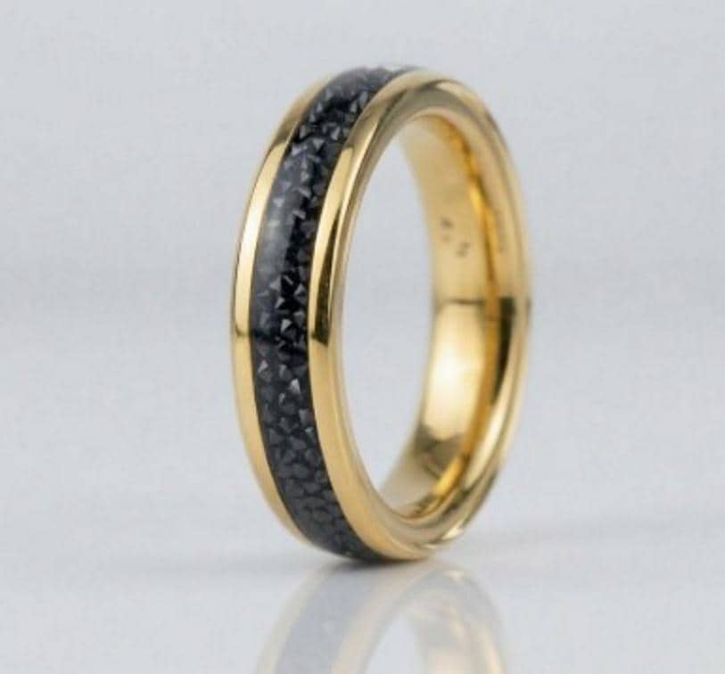 This genuine Gold Plated Tungsten Carbide ring is inlaid with Black Cubic Zirconia (CZ) Stones.