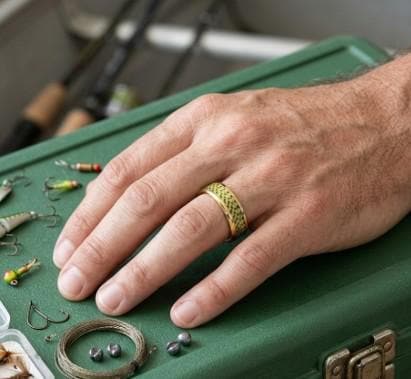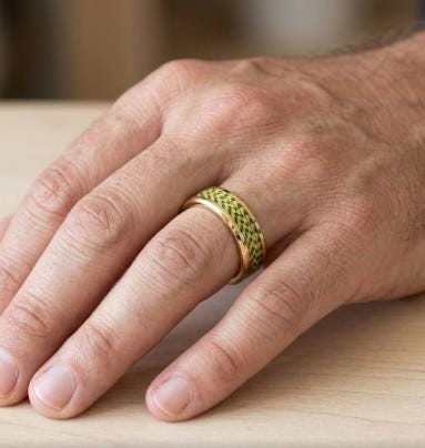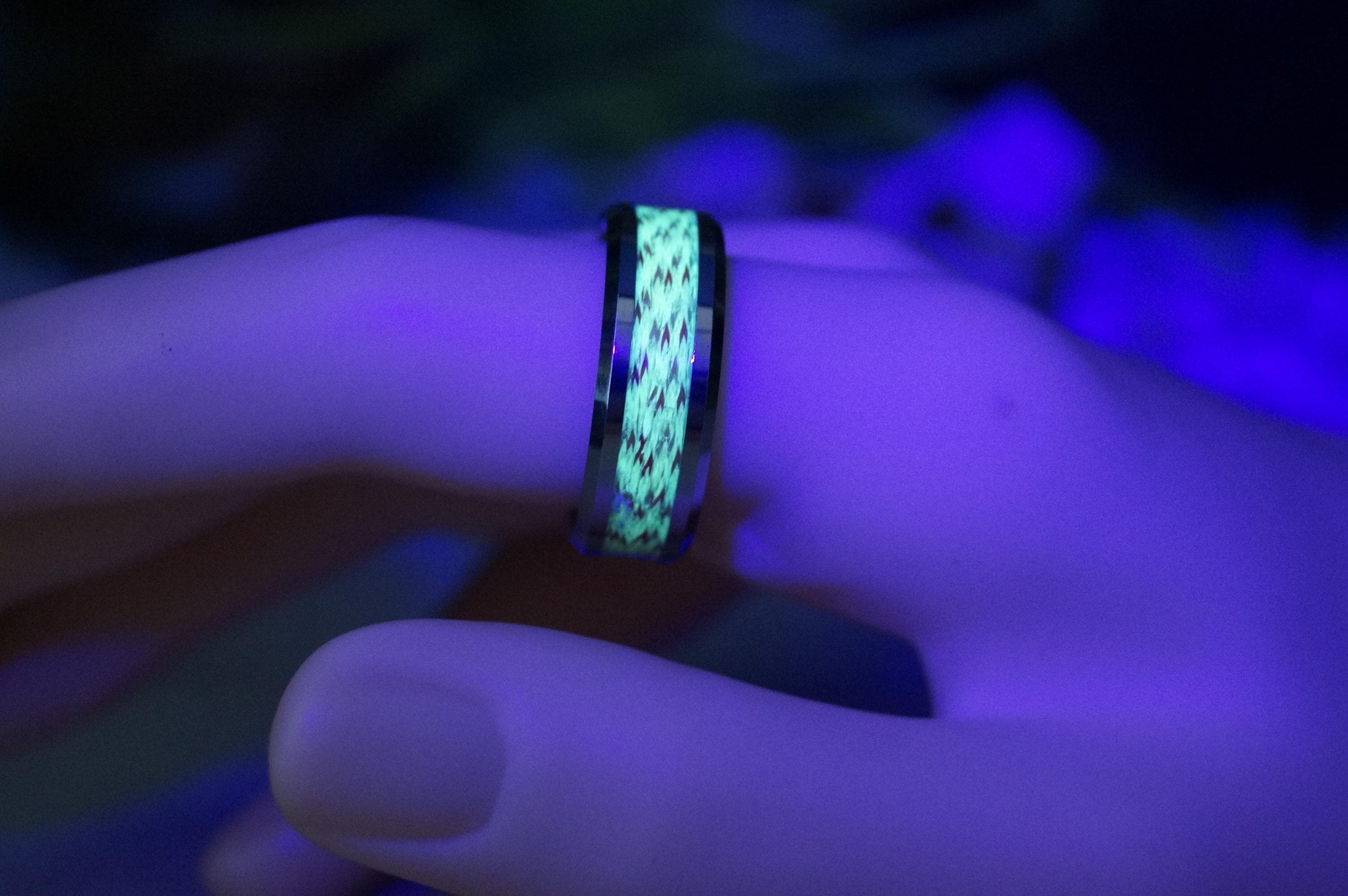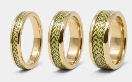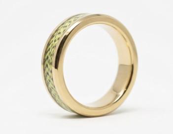 This genuine Gold Plated Tungsten Carbide ring is inlaid with genuine Green and Black Fishing Line - UV Glow Ring.