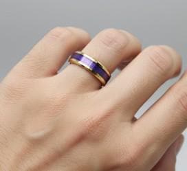 This genuine Gold Plated Tungsten Carbide ring is inlaid with genuine Purple Fishing Line.