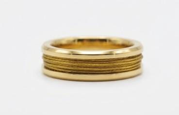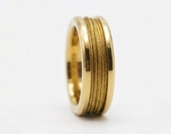 This genuine Gold Plated Tungsten Carbide ring is inlaid with genuine Gold Fishing Line