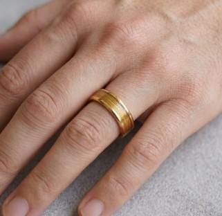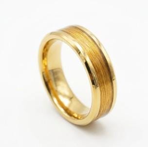 This genuine Gold Plated Tungsten Carbide ring is inlaid with genuine Yellow Gold Fishing Line.